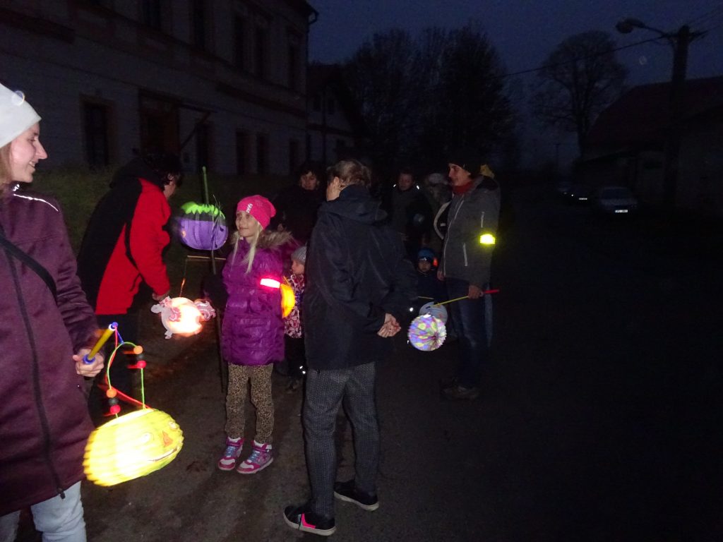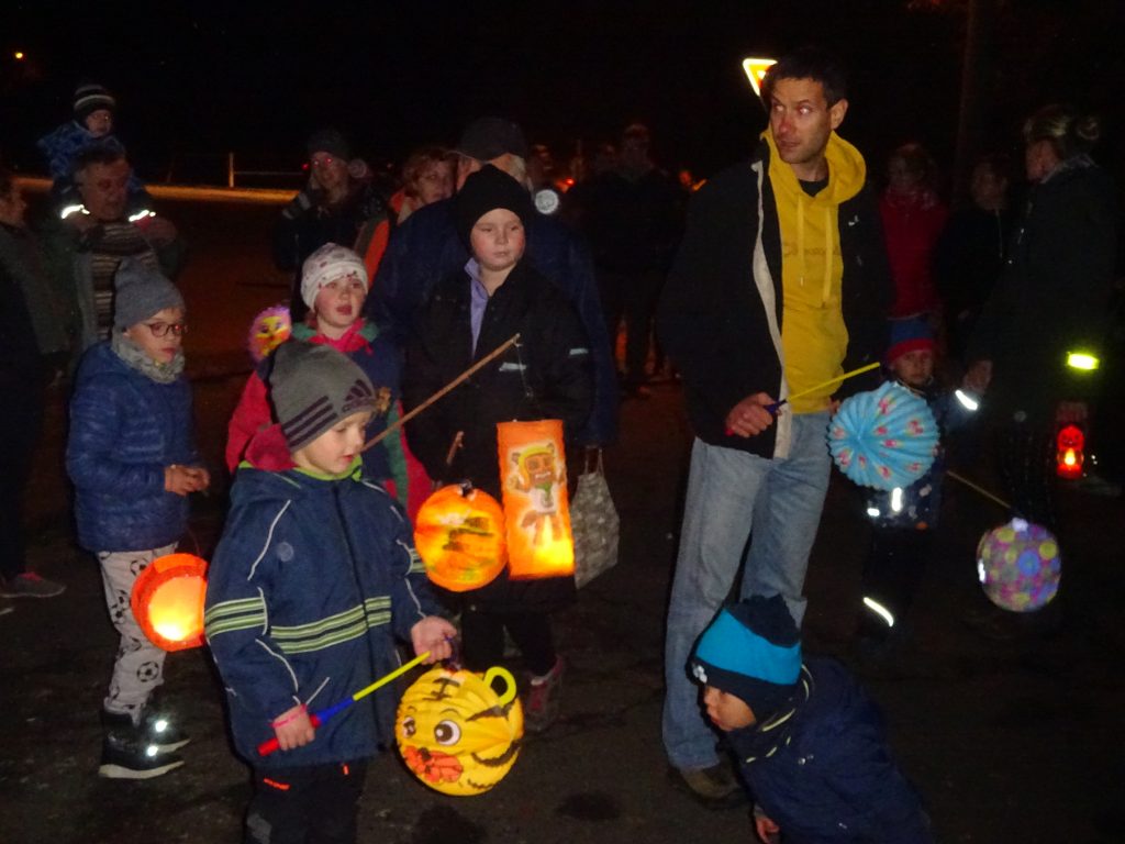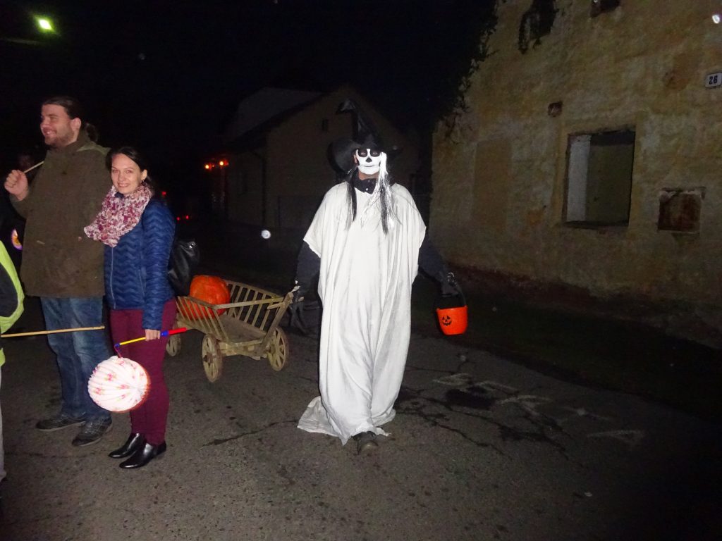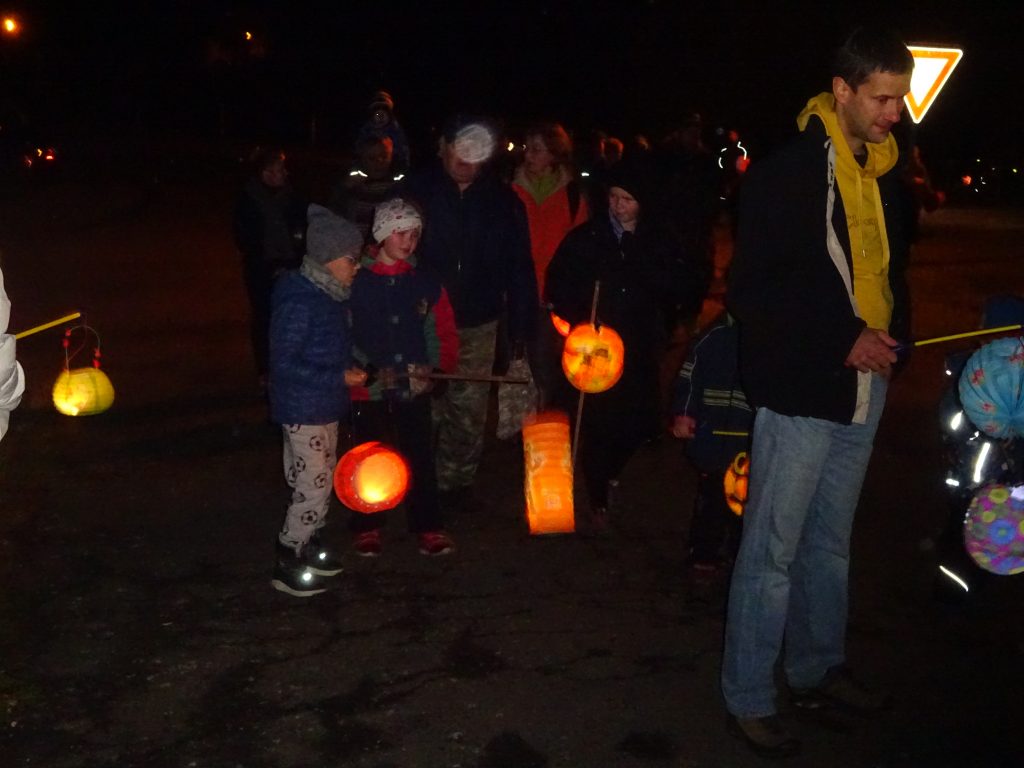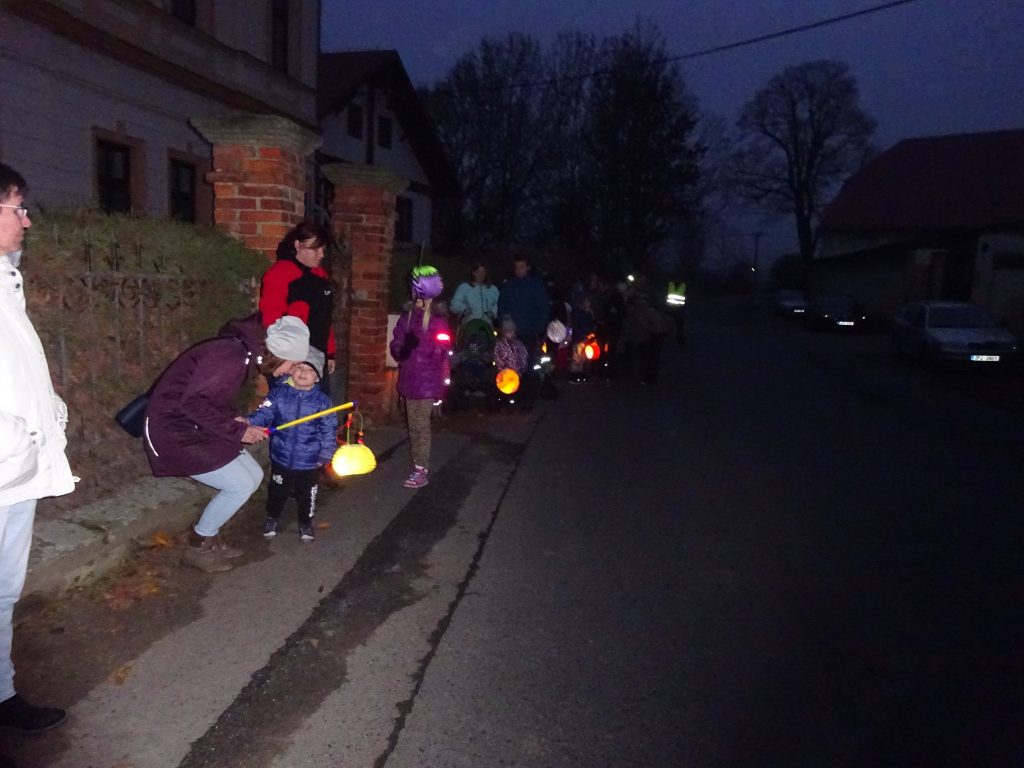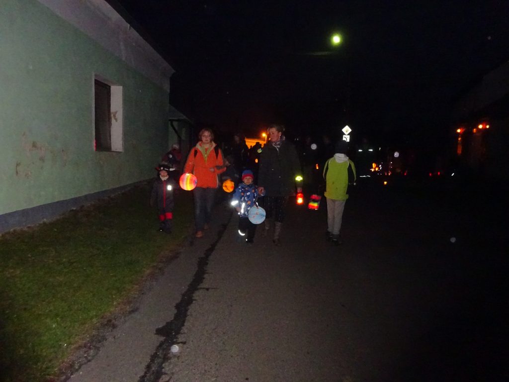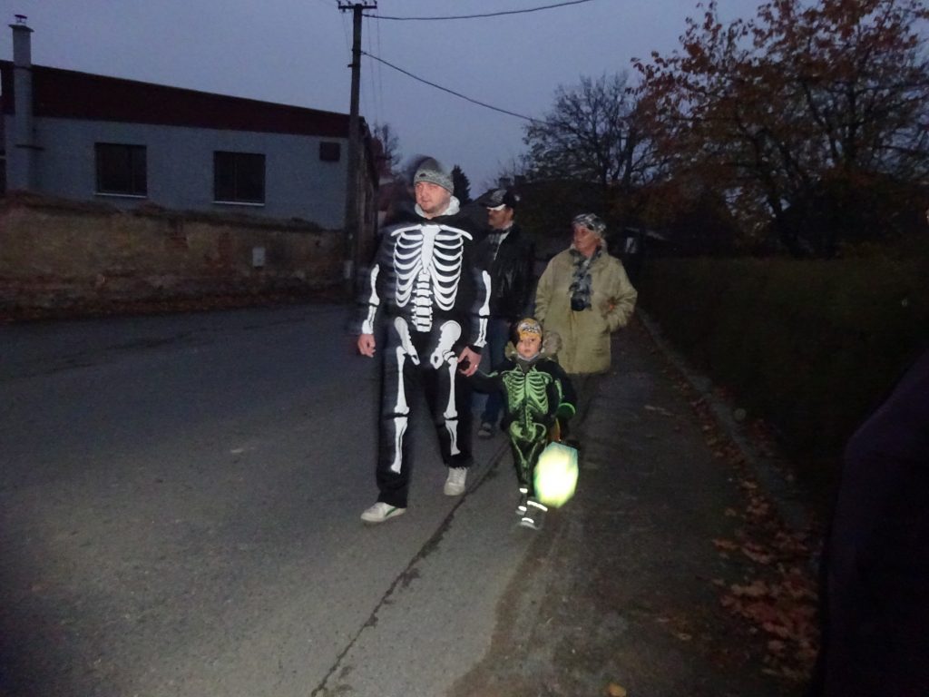 A Hallowenn pokračoval… Děti ve svých kostýmech zaplnily poslední říjnový týden školku a s chutí soutěžily, vyráběly a dloubaly dýně. V sobotu 3. listopadu vyzdobily rozsvícené dýně naši vesnici a lampionový průvod se vydal vesnicí na louku za bytovku. Průvod doprovázelo několik duchů a strašidel, výzdoba u obydlí nebrala konce a fantazie místních obyvatel. Na louce hasiči připravili ohniště a stezku pro odvážné děti. Nechybělo ani pouštění lampionků štěstí a opékání špekáčků. Opět se zúčastnila široká veřejnost a lampionový průvod se vydařil.