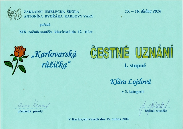 Ve dnech 15. a 16. dubna se v Karlových Varech uskutečnil XIX. ročník soutěže klavíristů do 12 -ti let «KARLOVARSKÁ RŮŽIČKA», které se úspěšně zúčastnila naše žákyně 5. ročníku Klárka LOJDOVÁ a zjískala «Čestné uznání 1. stupně».