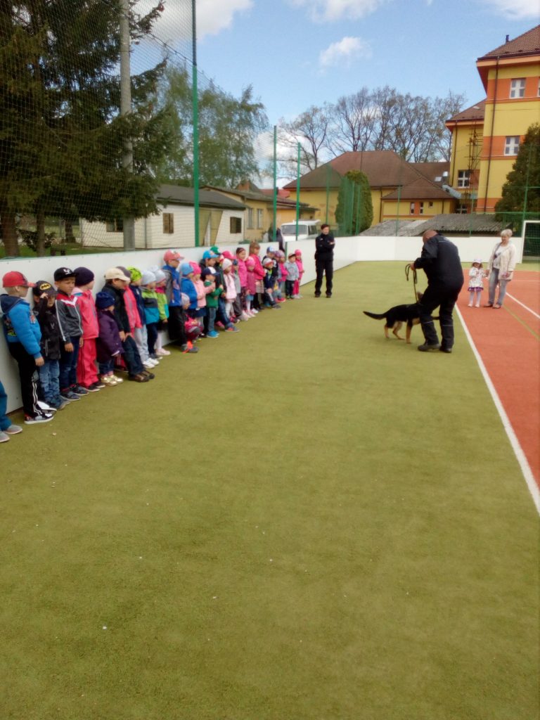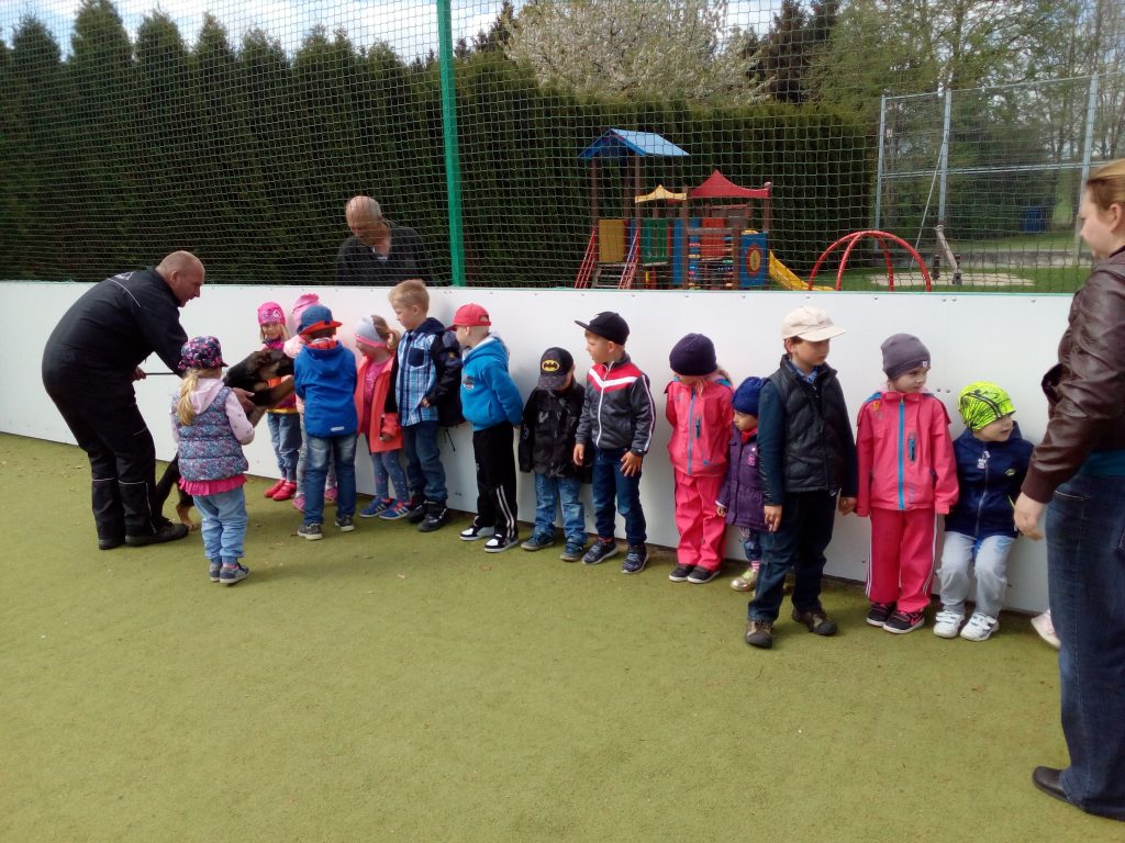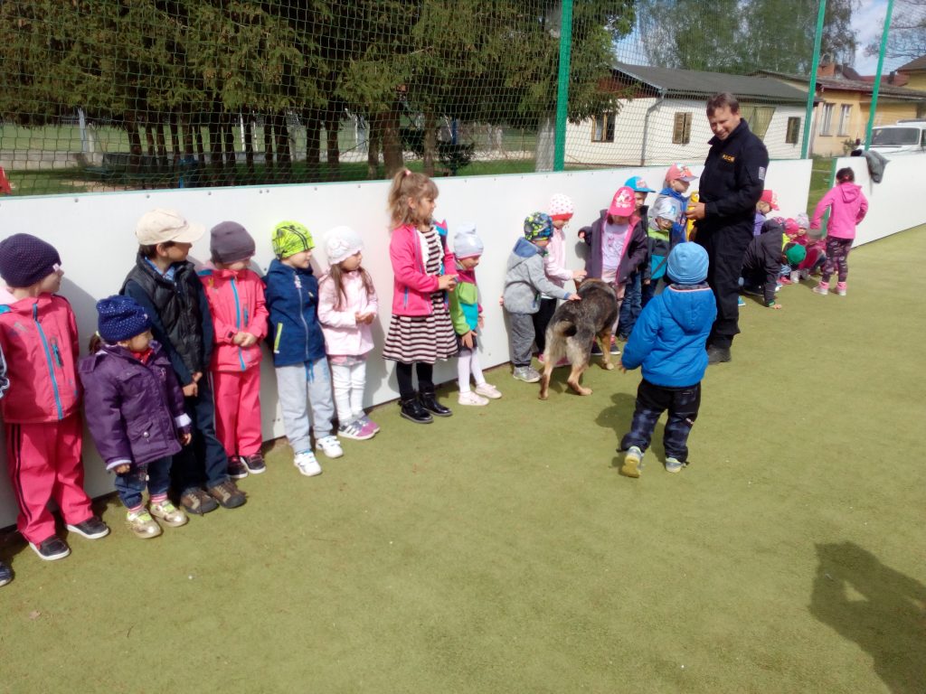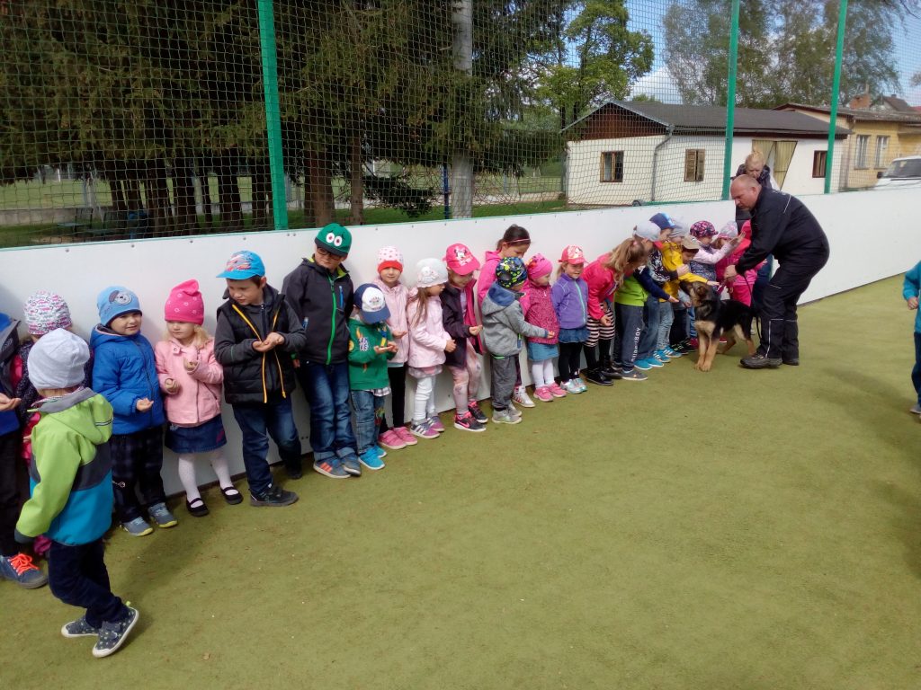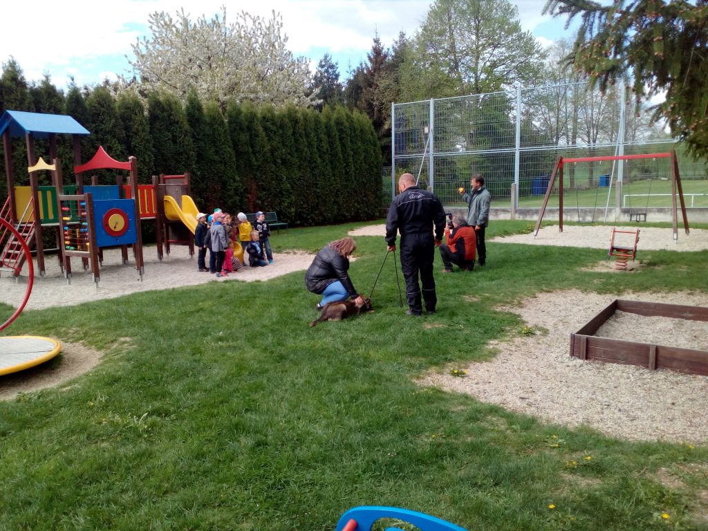 Ve čtvrtek 26. 4. k nám přijeli s ukázkou práce se psy domažličtí psovodi a zároveň probíhalo i focení dětí a předškoláků na tablo.