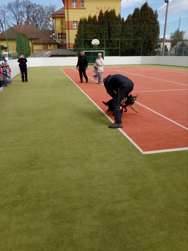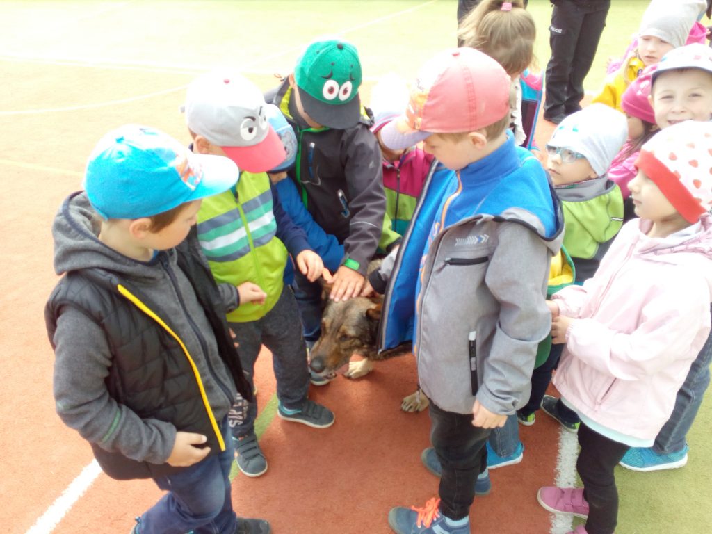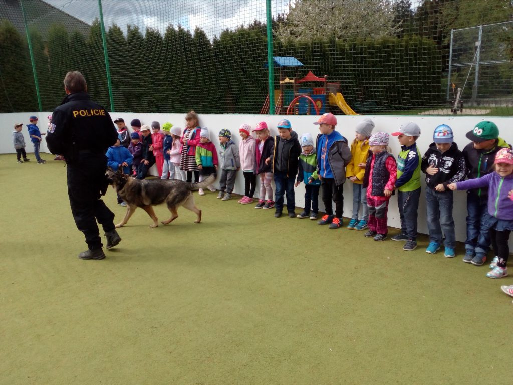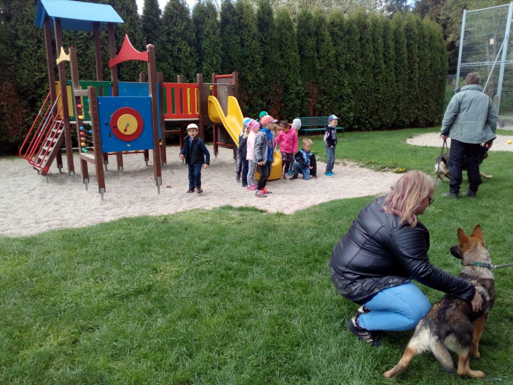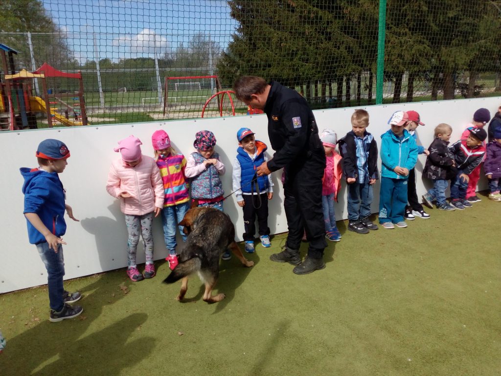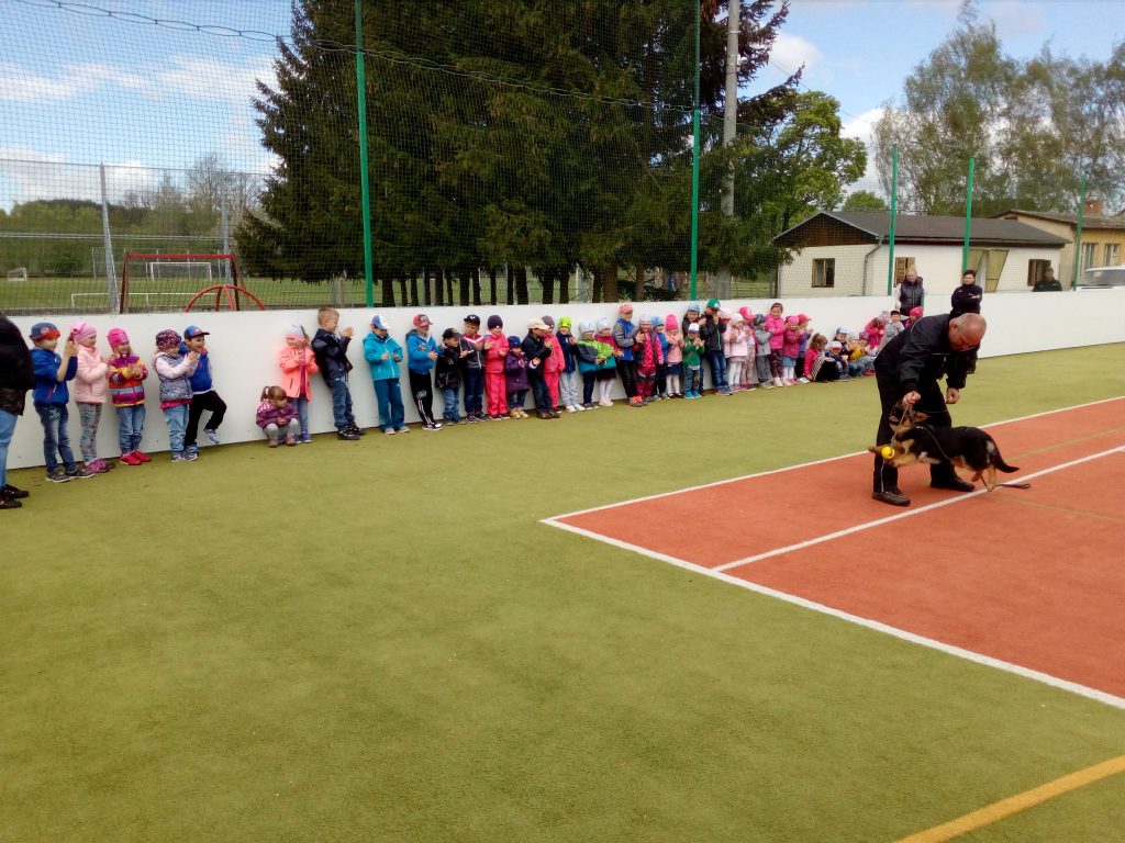 Ve čtvrtek 26. 4. k nám přijeli s ukázkou práce se psy domažličtí psovodi a zároveň probíhalo i focení dětí a předškoláků na tablo.