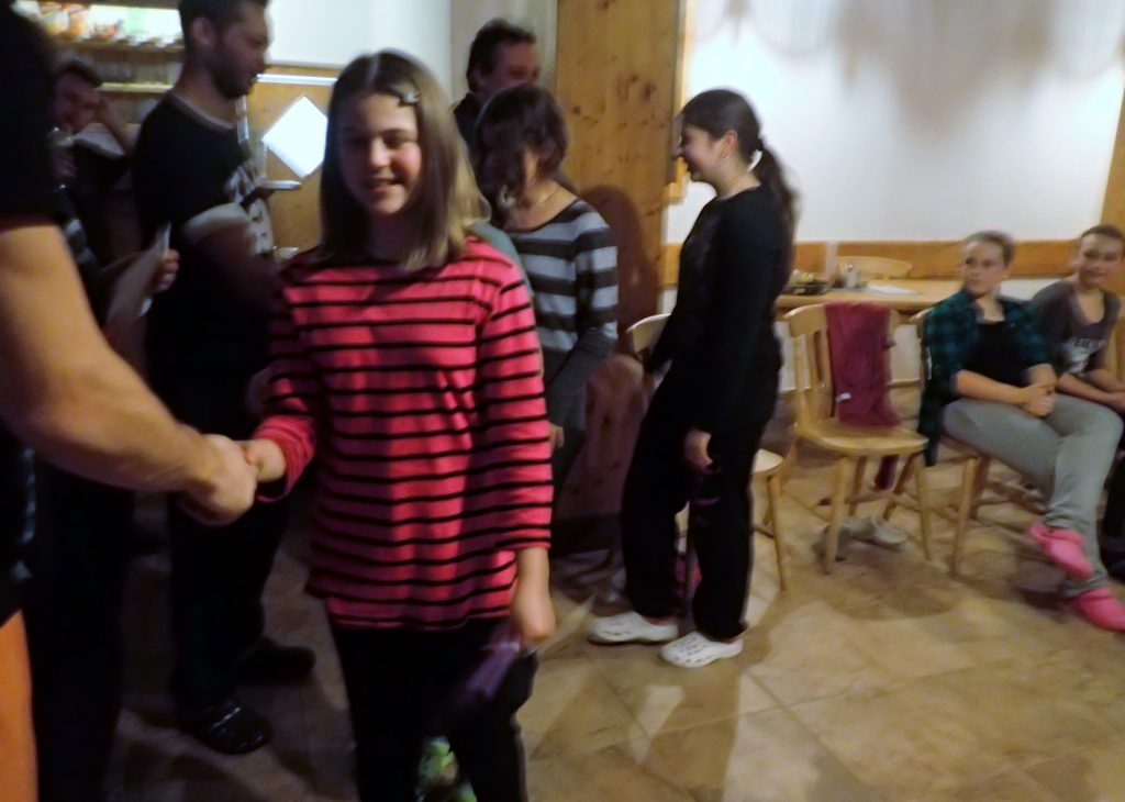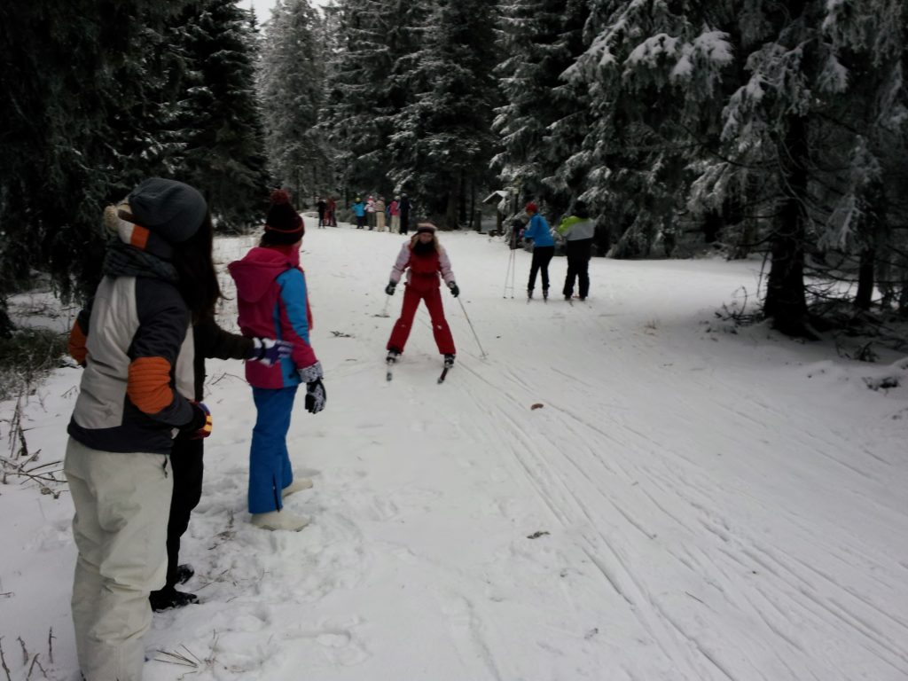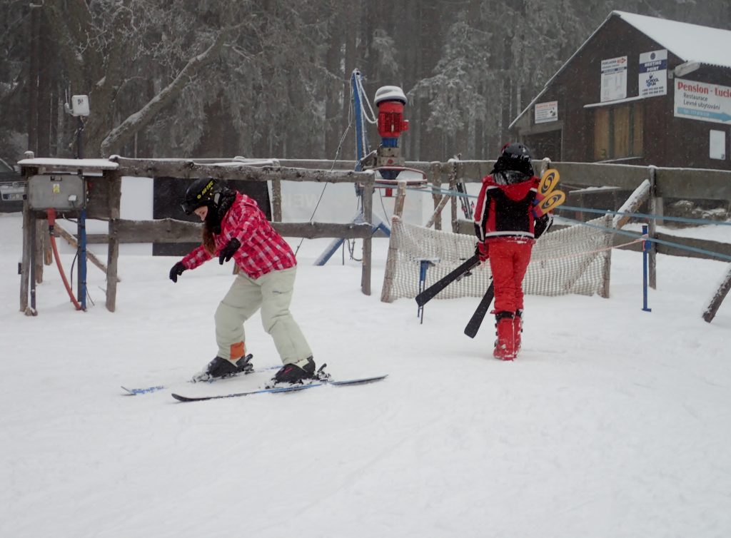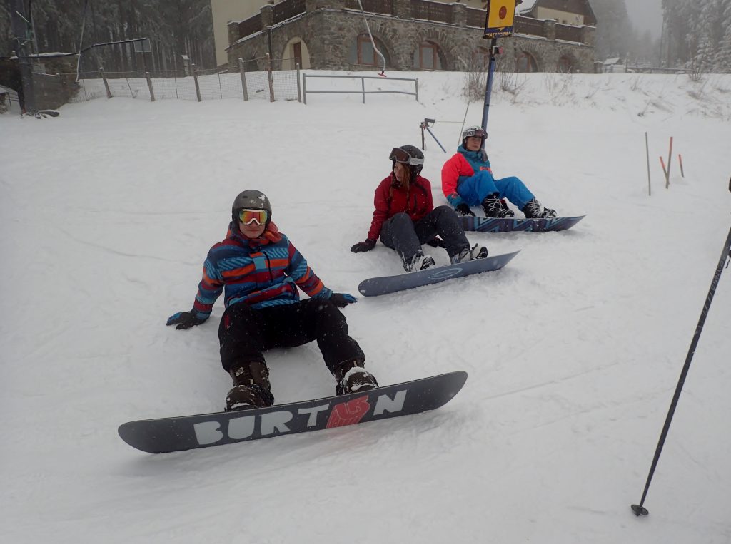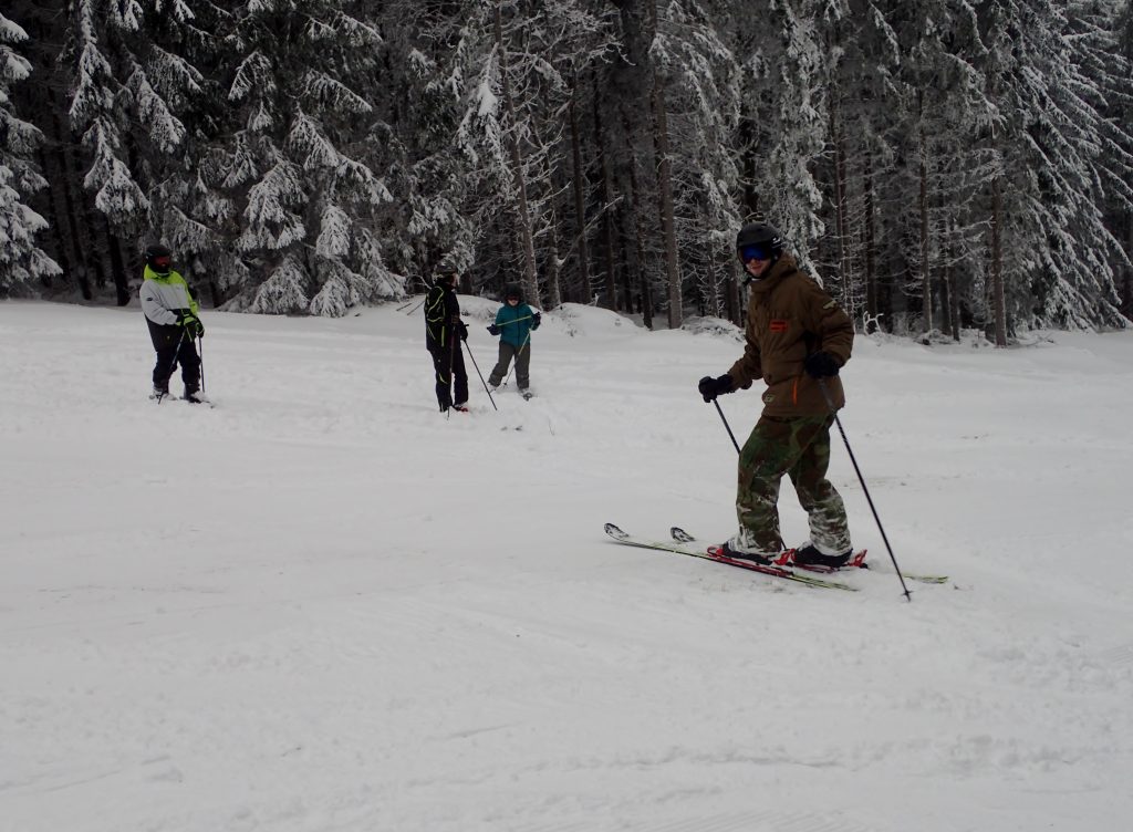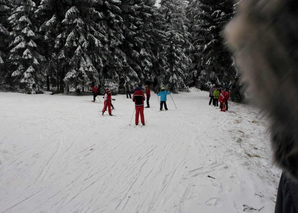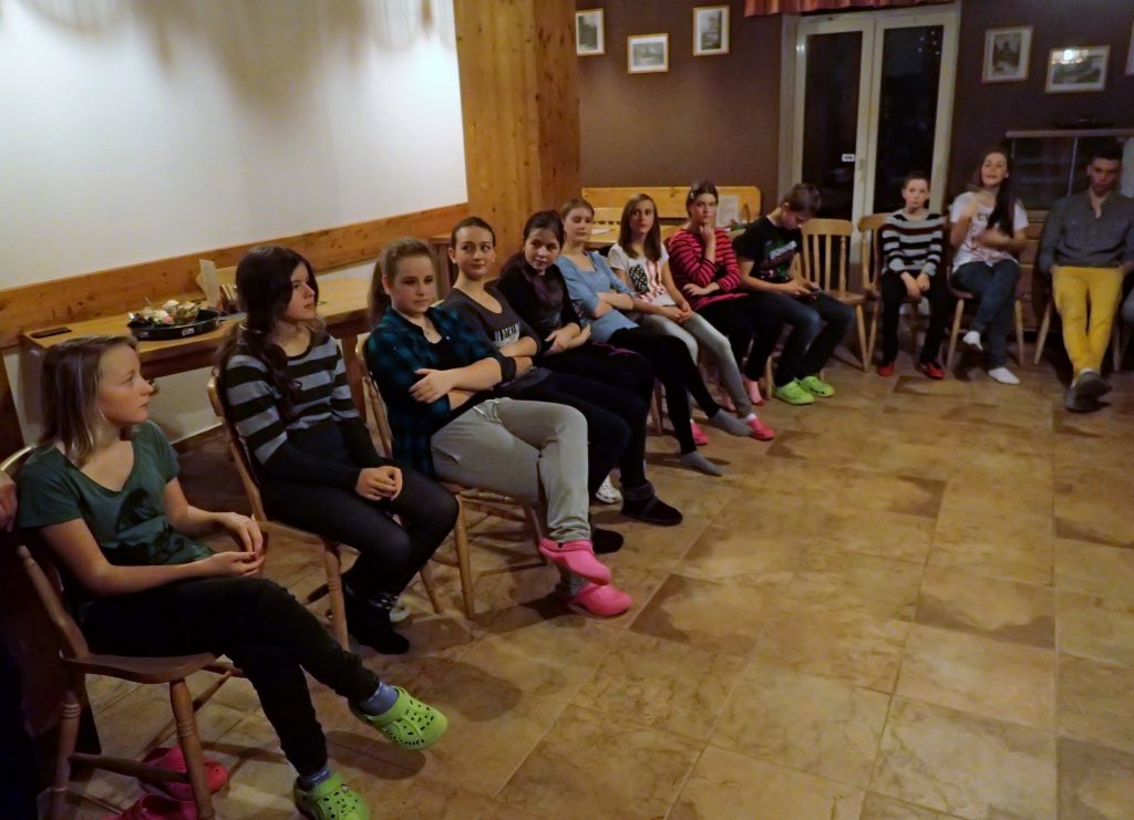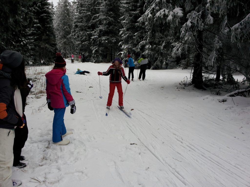 Následoval oběd a první lyžování. Ti lepší z nás jezdili rovnou dole na svahu, my ostatní jsme se nahoře snažili vyjet několik obloučků. Večer, abychom se seznámili s vrstevníky z druhé školy, jsme společně hráli hru Aktivity.