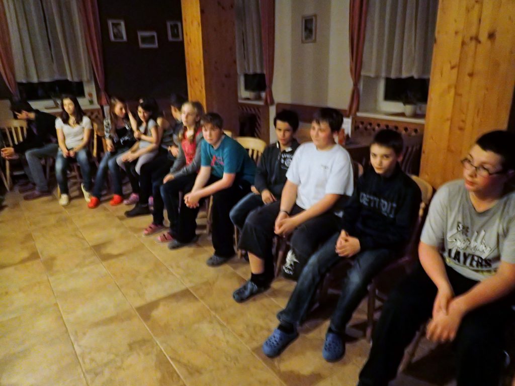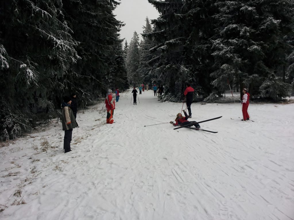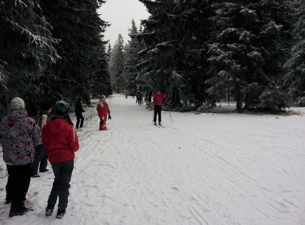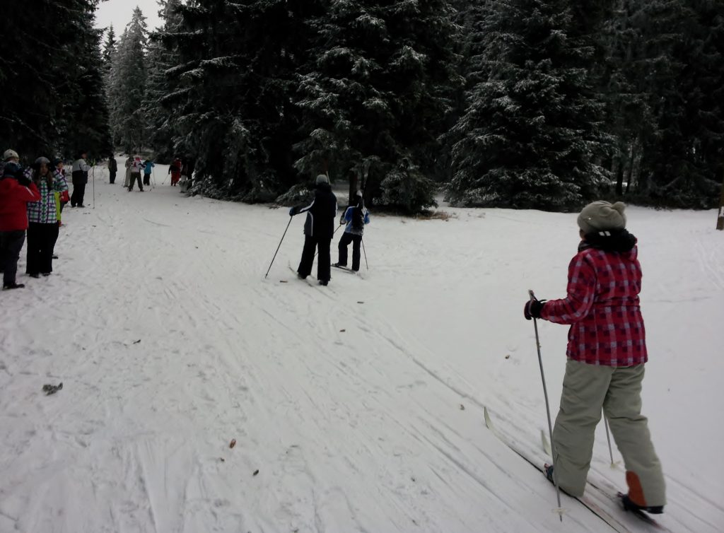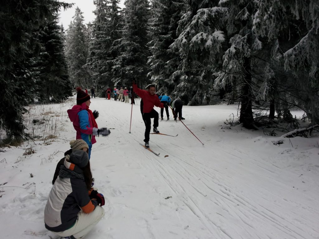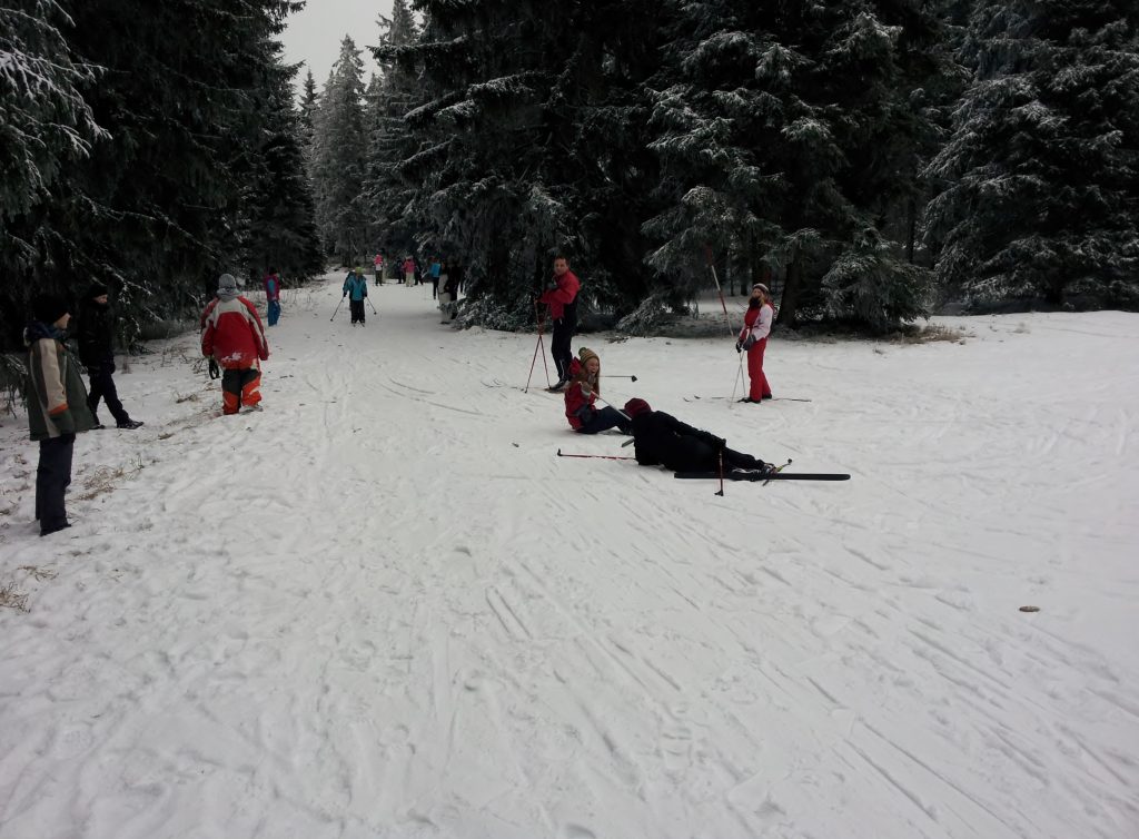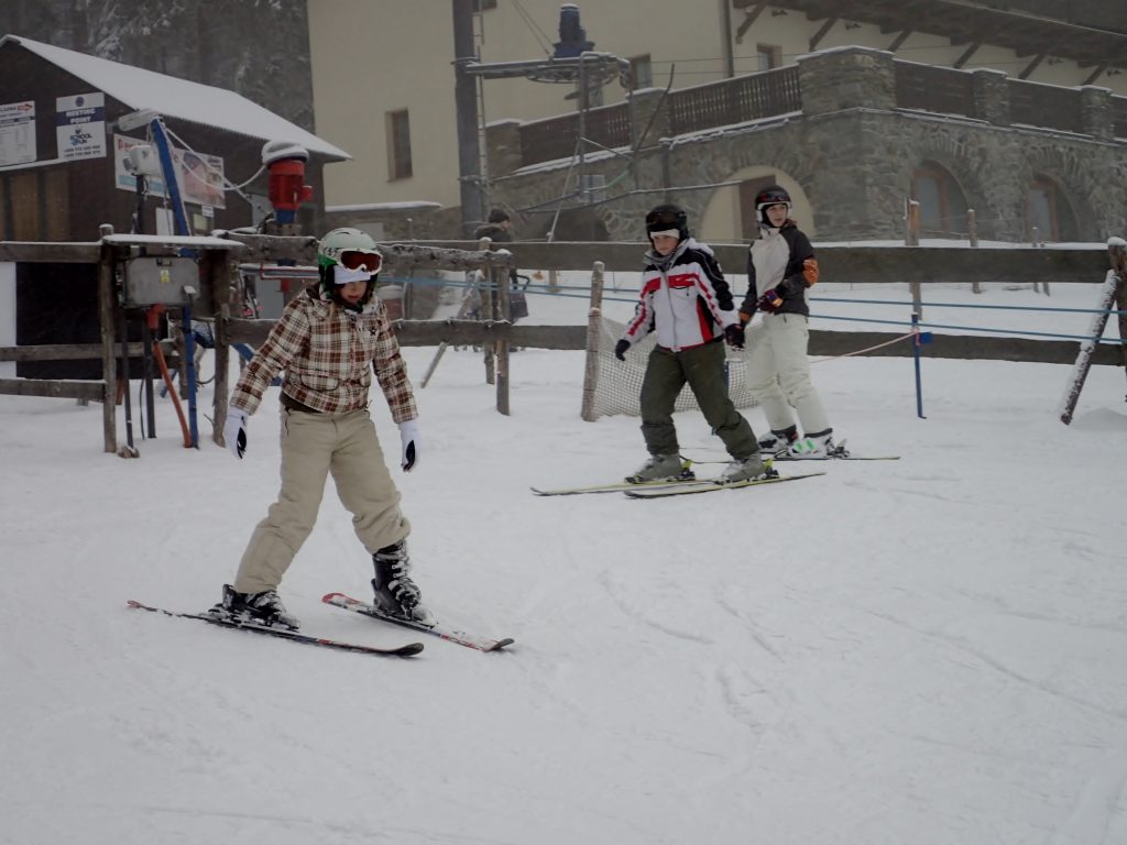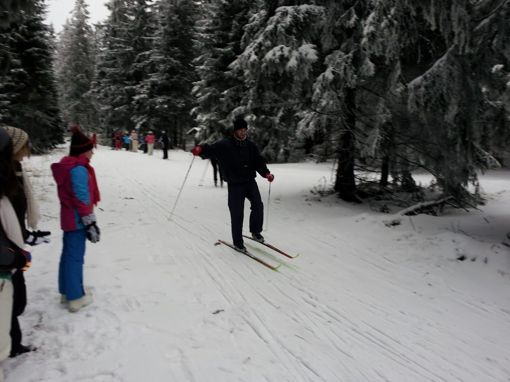 Následoval oběd a první lyžování. Ti lepší z nás jezdili rovnou dole na svahu, my ostatní jsme se nahoře snažili vyjet několik obloučků. Večer, abychom se seznámili s vrstevníky z druhé školy, jsme společně hráli hru Aktivity.