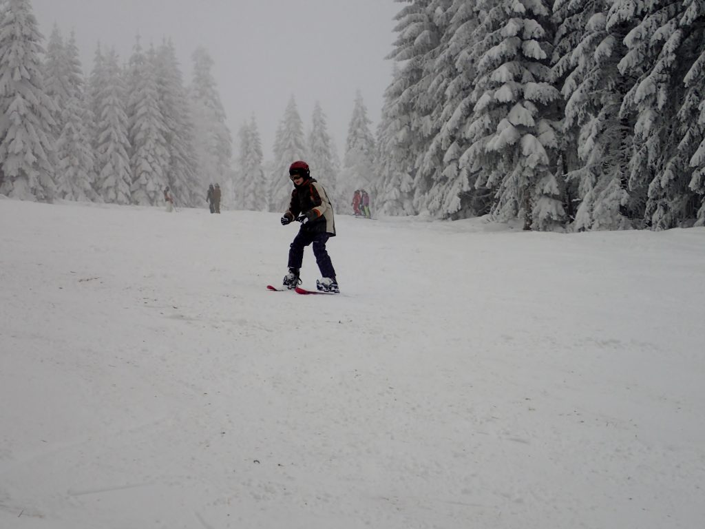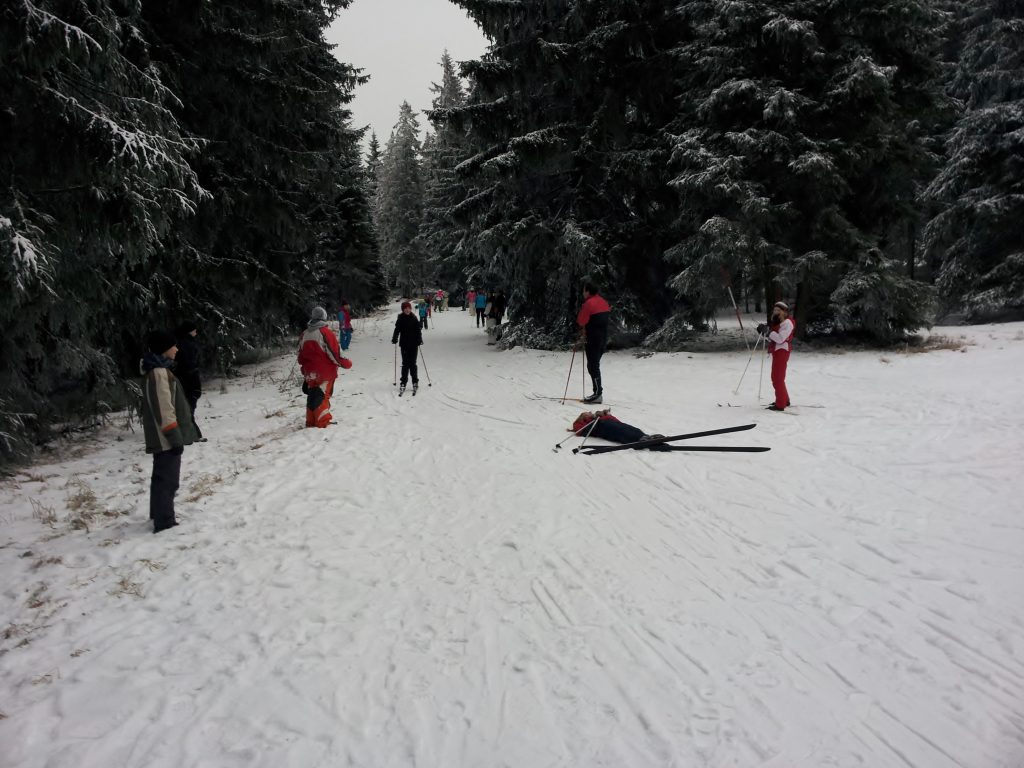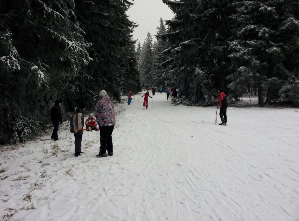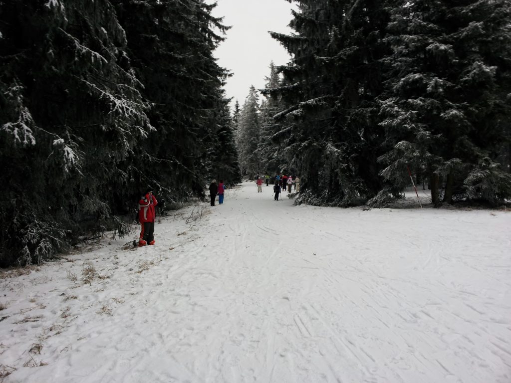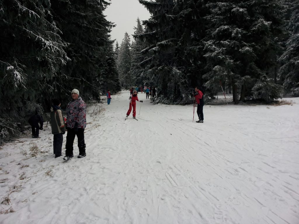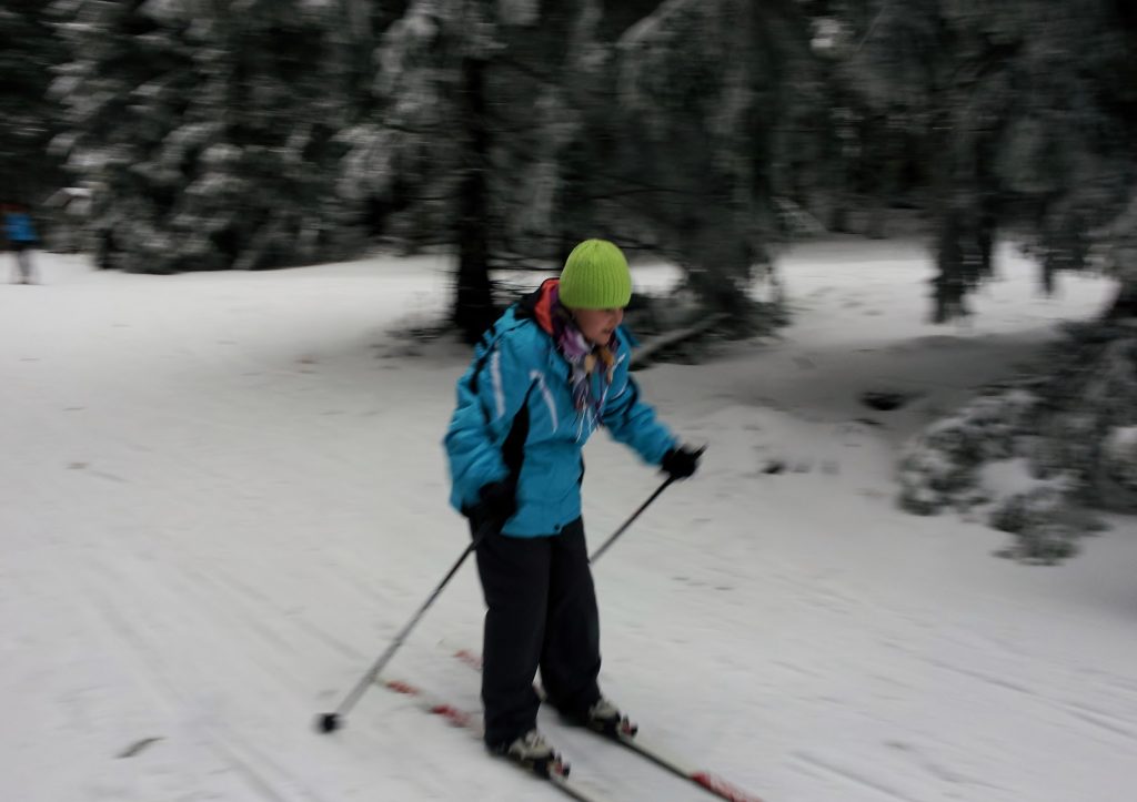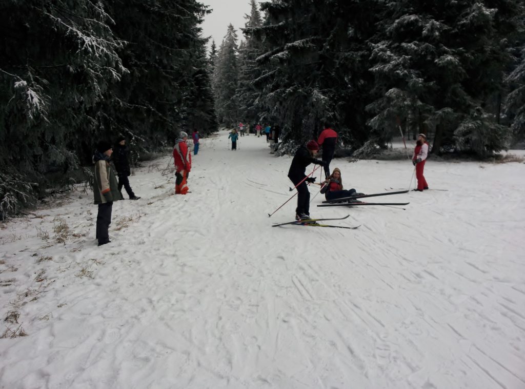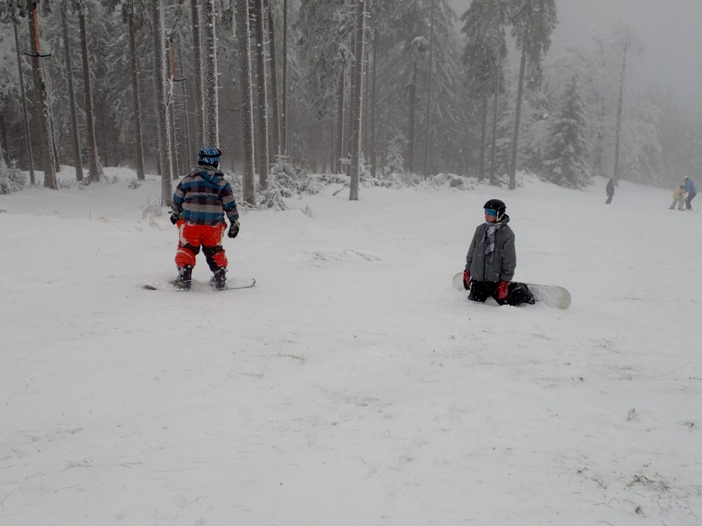 Následoval oběd a první lyžování. Ti lepší z nás jezdili rovnou dole na svahu, my ostatní jsme se nahoře snažili vyjet několik obloučků. Večer, abychom se seznámili s vrstevníky z druhé školy, jsme společně hráli hru Aktivity.