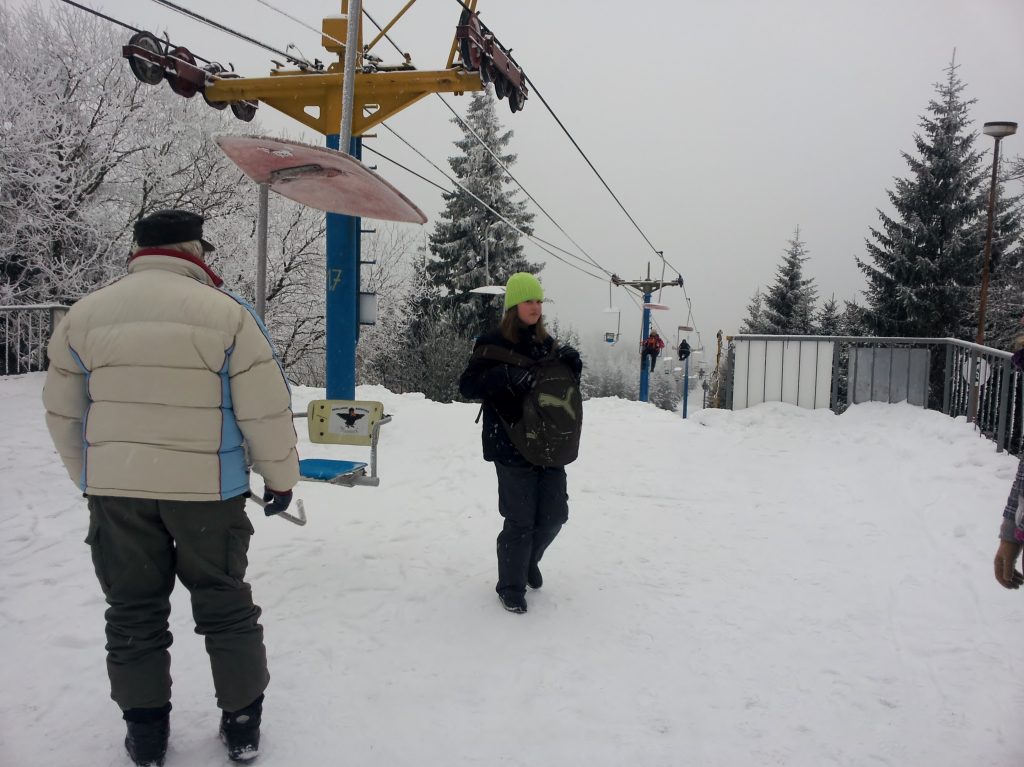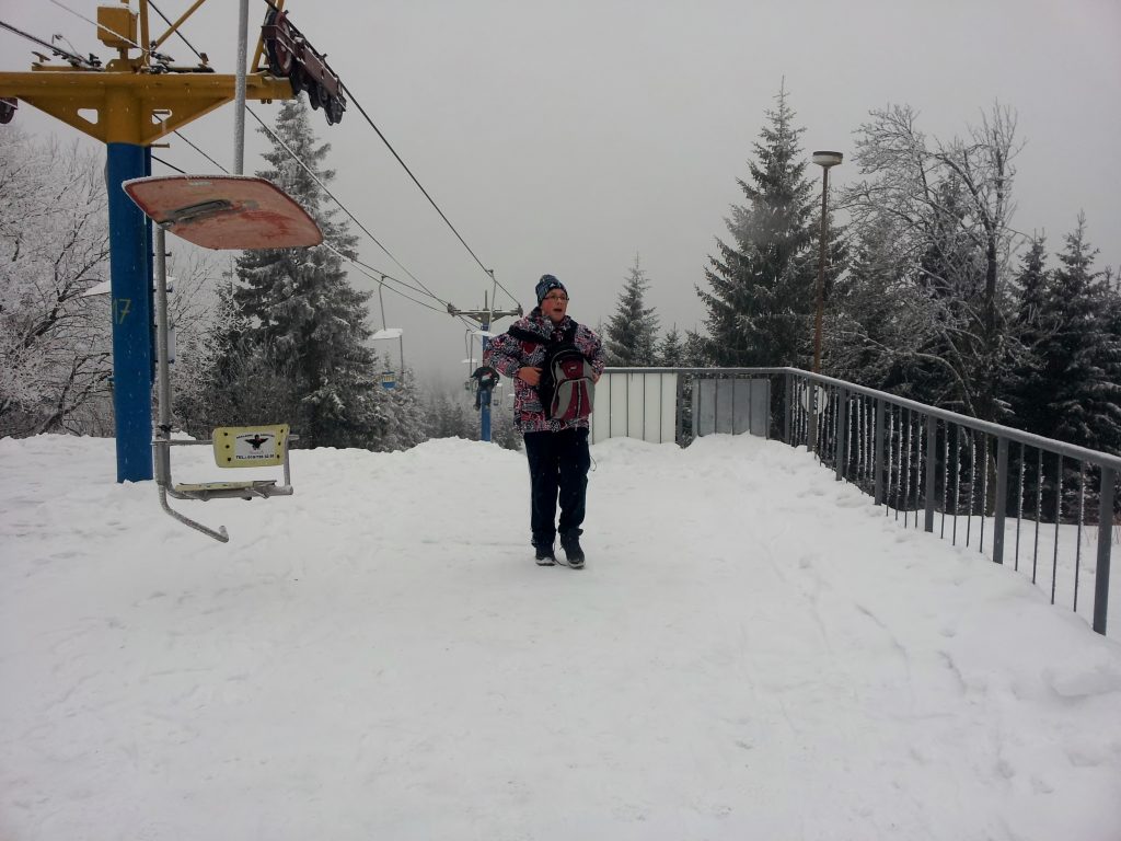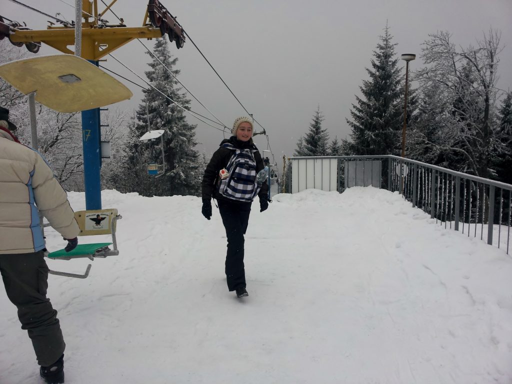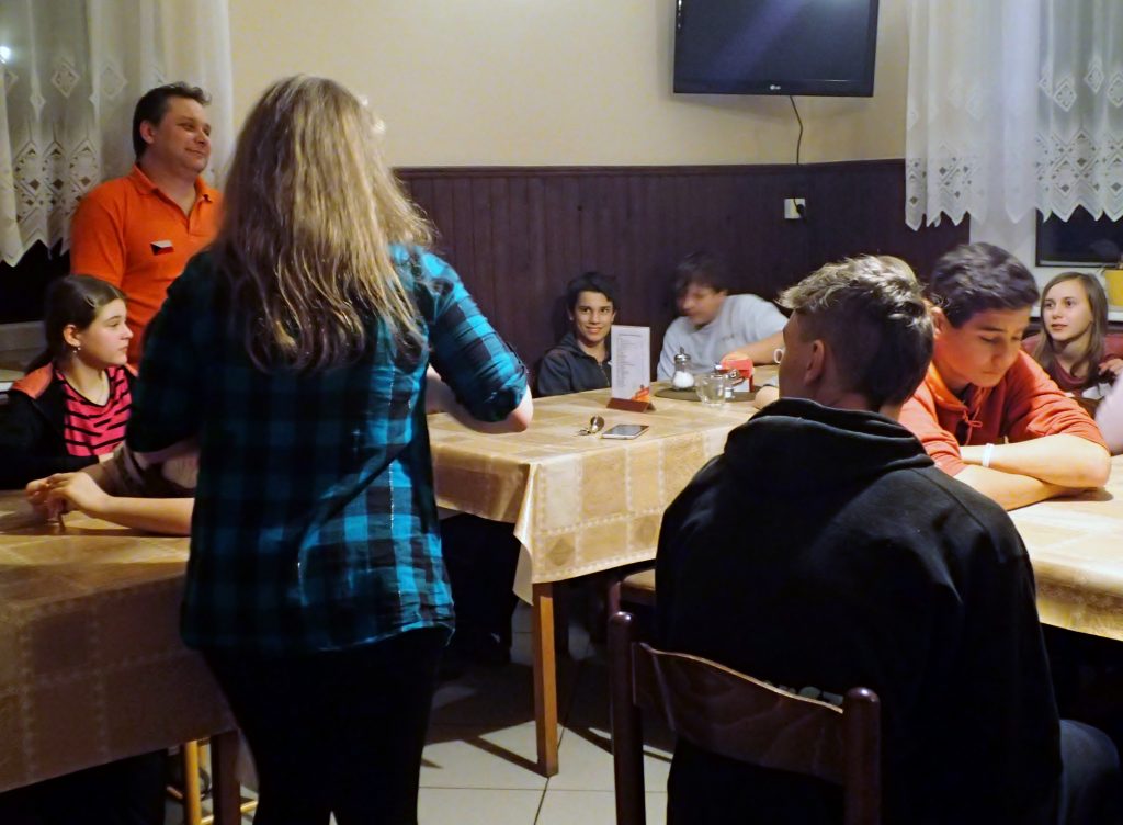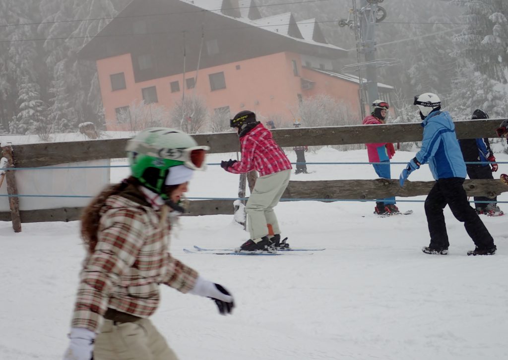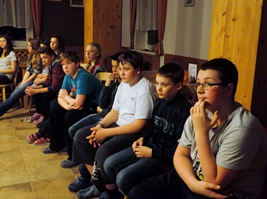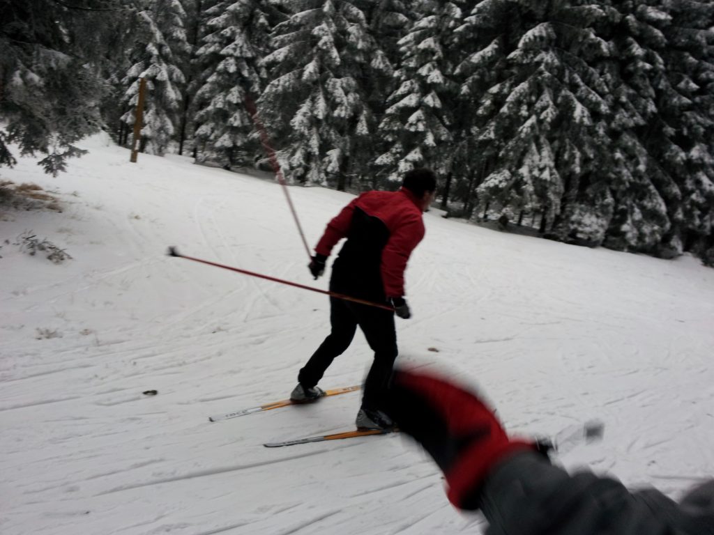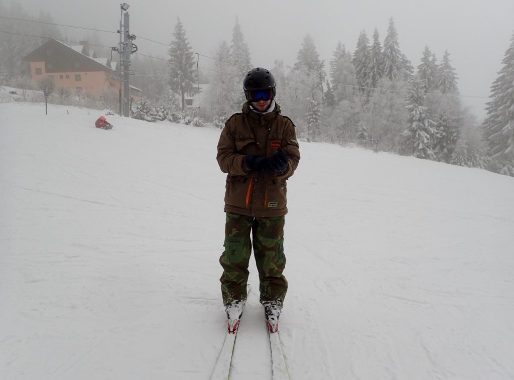 Následoval oběd a první lyžování. Ti lepší z nás jezdili rovnou dole na svahu, my ostatní jsme se nahoře snažili vyjet několik obloučků. Večer, abychom se seznámili s vrstevníky z druhé školy, jsme společně hráli hru Aktivity.
