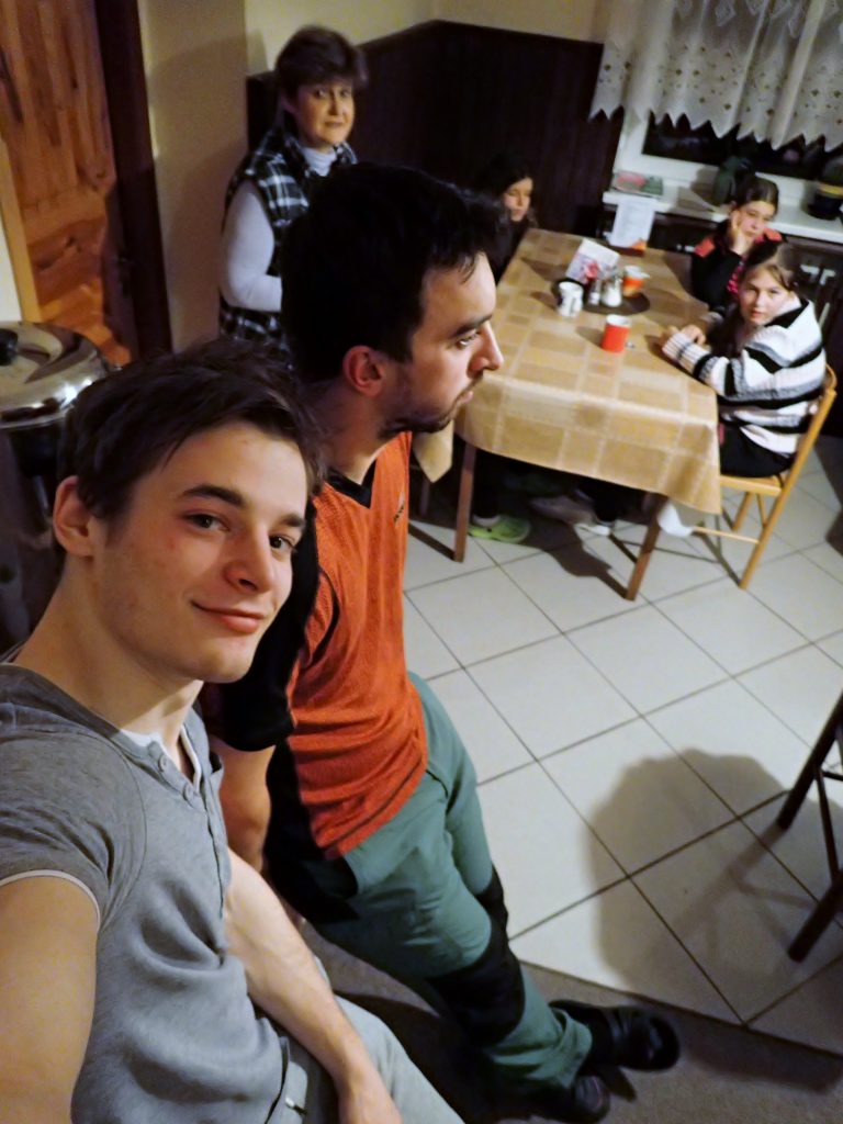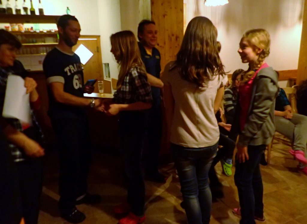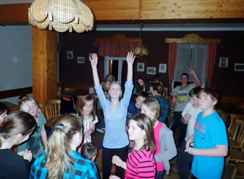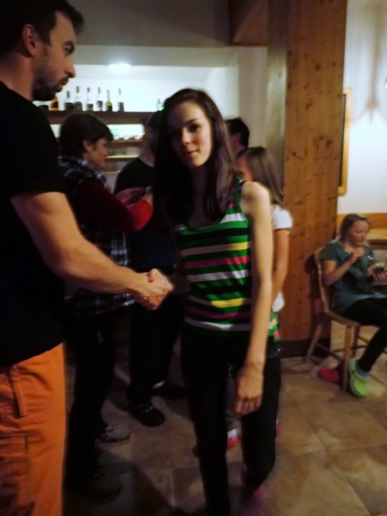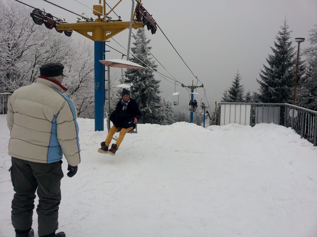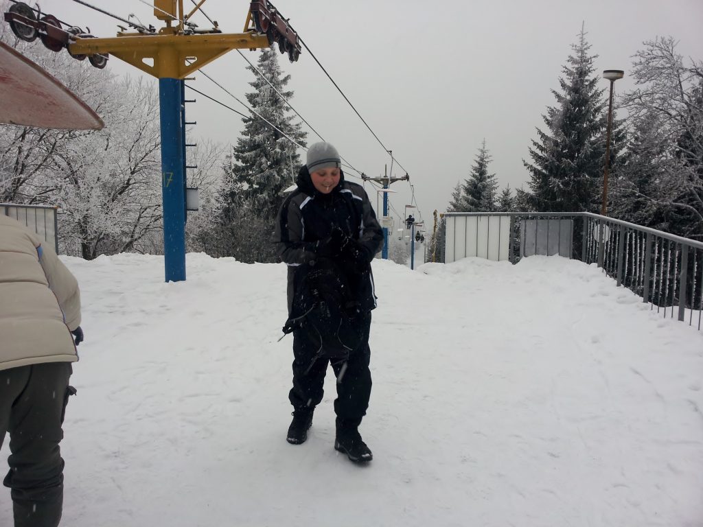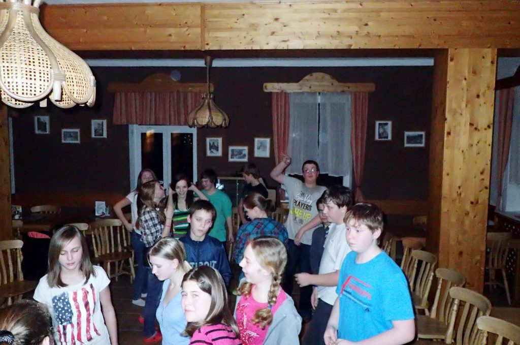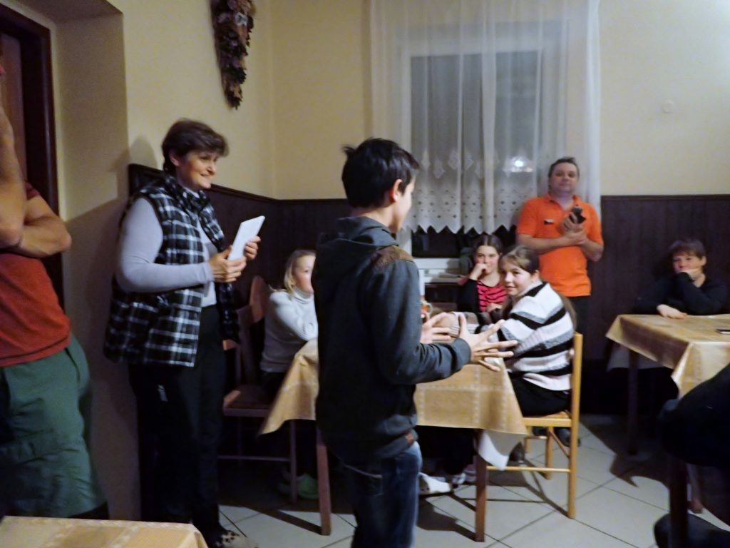 Následoval oběd a první lyžování. Ti lepší z nás jezdili rovnou dole na svahu, my ostatní jsme se nahoře snažili vyjet několik obloučků. Večer, abychom se seznámili s vrstevníky z druhé školy, jsme společně hráli hru Aktivity.