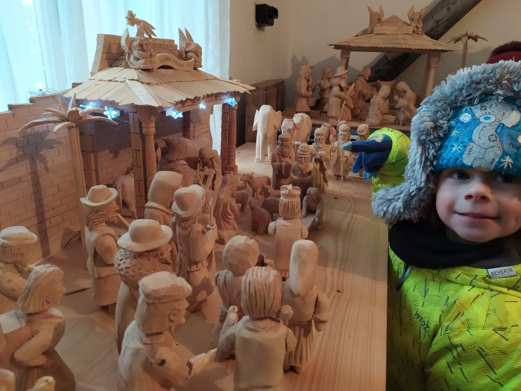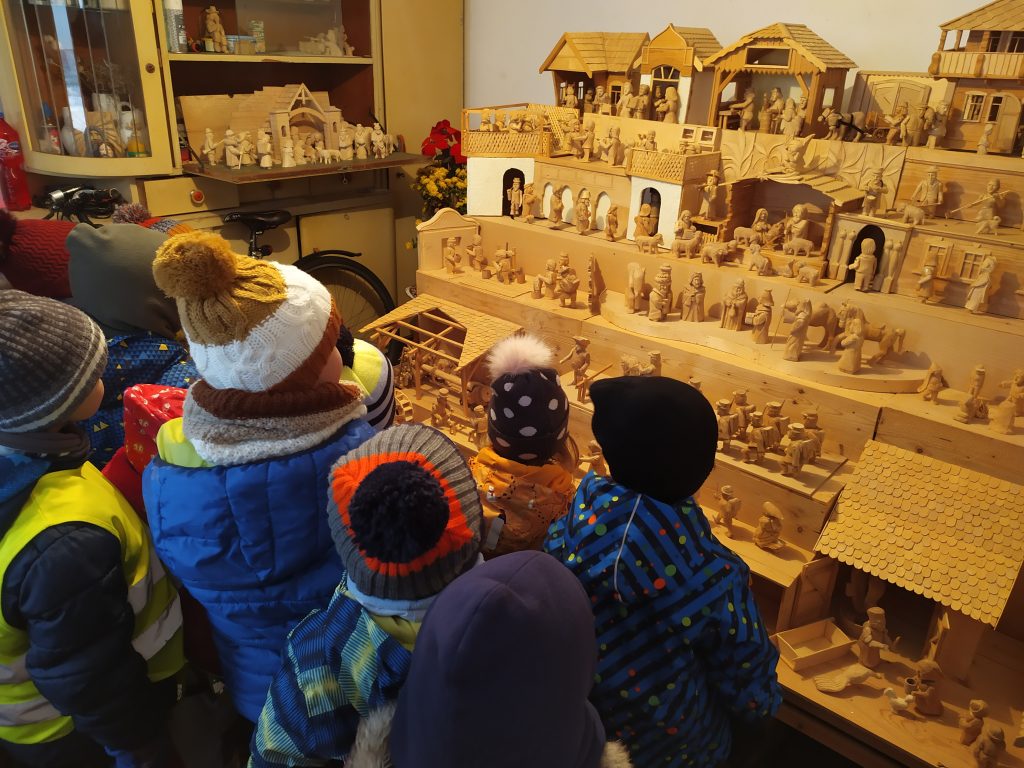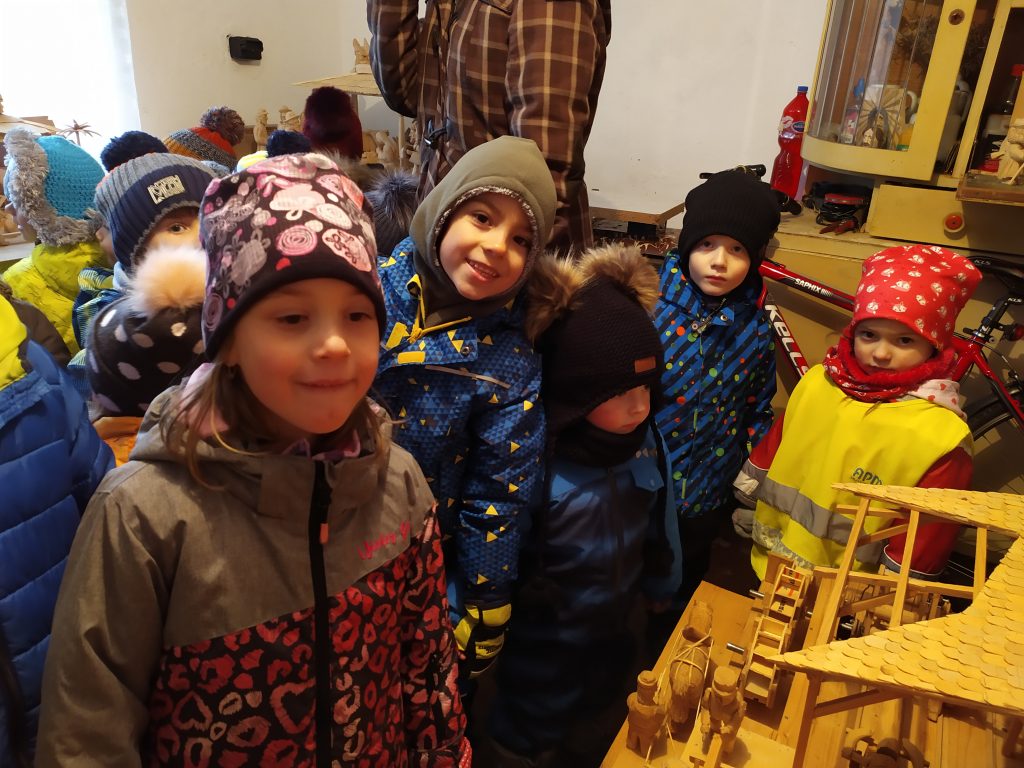 Byla středa, 14. prosince, za okny padal sníh, mráz štípal do tváří a všude kolem nás panovala krásná zima, jakou známe z obrázků Josefa Lady. A uprostřed té krásné zimy jsme se vydali na cestu do Betléma. Nemuseli jsme ale jít moc daleko. Nedaleko naší školky má svoje vyřezávané království pan Hamata, který už spousty let pilně pracuje a tvoří Betlém vyřezávaný z lipového dřeva. Betlém plný krásných figurek s nejmenšími detaily. Zopakovali jsme si příběh o Marii a Josefovi, nasáli vůni dřeva, vánoční atmosféru a do Nového roku popřáli panu Hamatovi, jak se sluší a patří, zdravíčko, štěstí a ještě spousty nových betlémských postaviček.