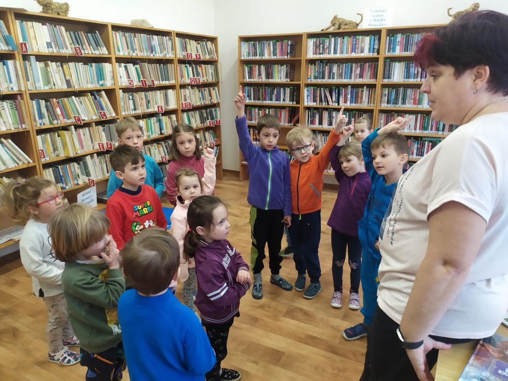 Ve čtvrtek 23. března jsme navštívili naši místní knihovnu. Pro mladší děti to byla vůbec první taková návštěva v životě a s radostí v očích pozorovaly všechny ty barevné obrázky. Starší děti nebyly v knihovně poprvé a dokonce už poznávaly i různá písmenka. Paní knihovnice měla pro děti připravenou zajímavou a poučnou přednášku spojenou s krátkou četbou encyklopedie. Děti pozorně poslouchaly, jaké druhy knih máme, jak s takovou knihou vhodně zacházet a starat se o ni a že kromě knih lze číst i v různých tiskovinách. Nakonec si děti mohly vybrat knihu podle svého přání a měly i dostatek času na její prohlížení. Návštěva se nám moc líbila. Děkujeme paní knihovnici za příjemné dopoledne.