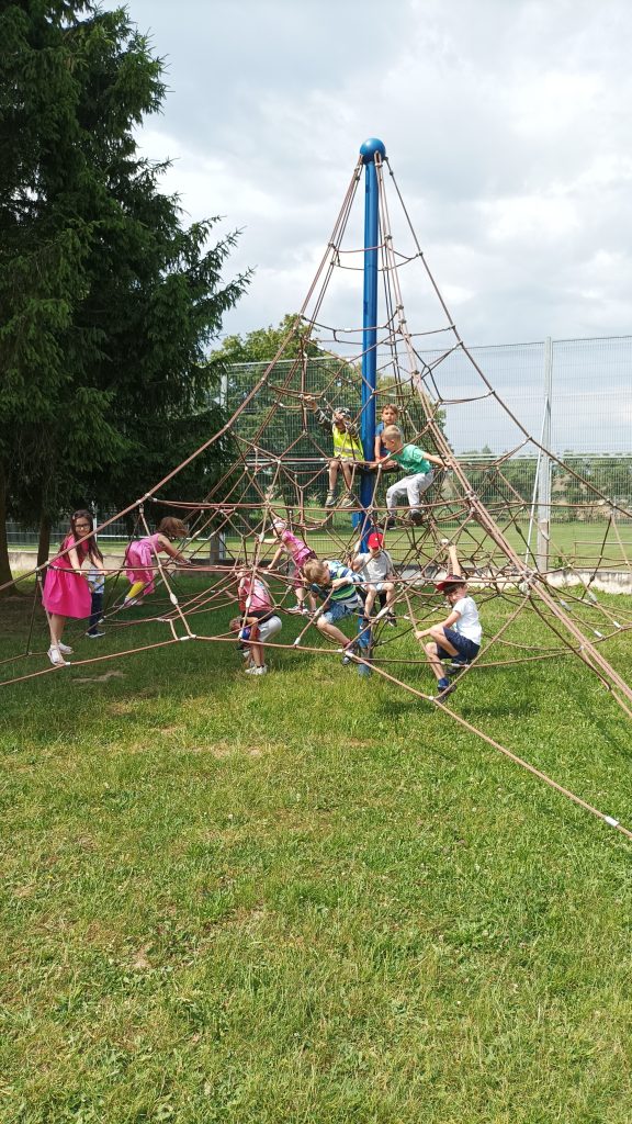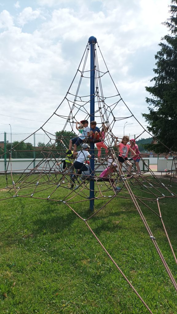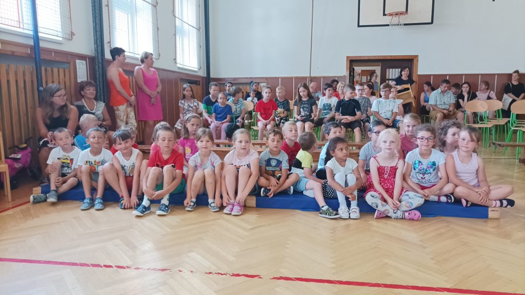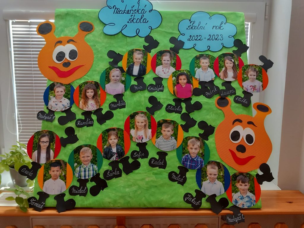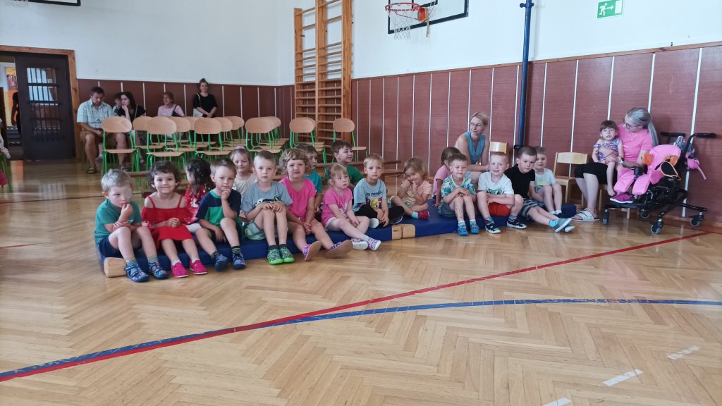 Hry na hřišti, divadelní představení v tělocvičně, tablo předškoláků.