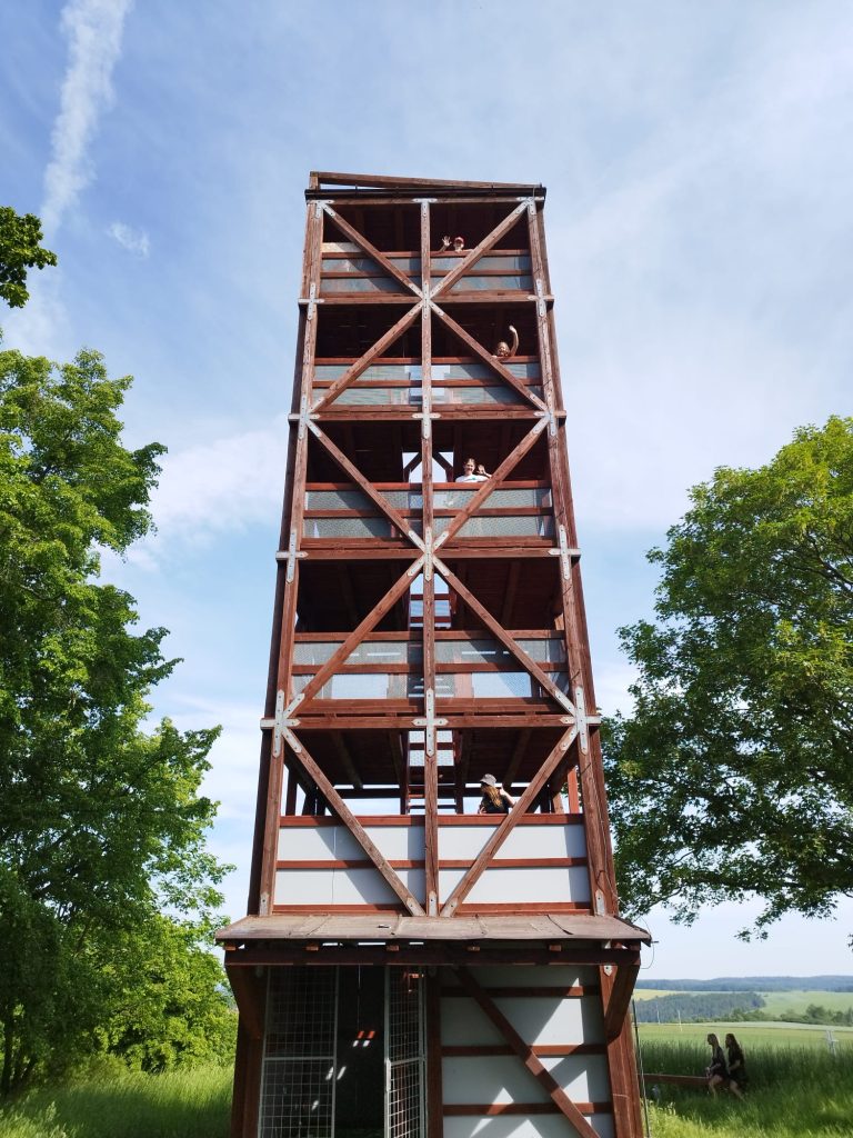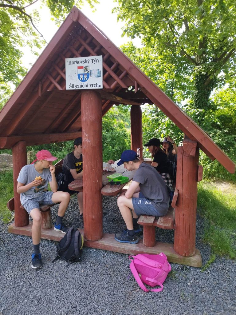 jsme se zastavili na rozhledně Šibeniční vrch, kde jsme měli svačinu. Pak už jsme jen sešli