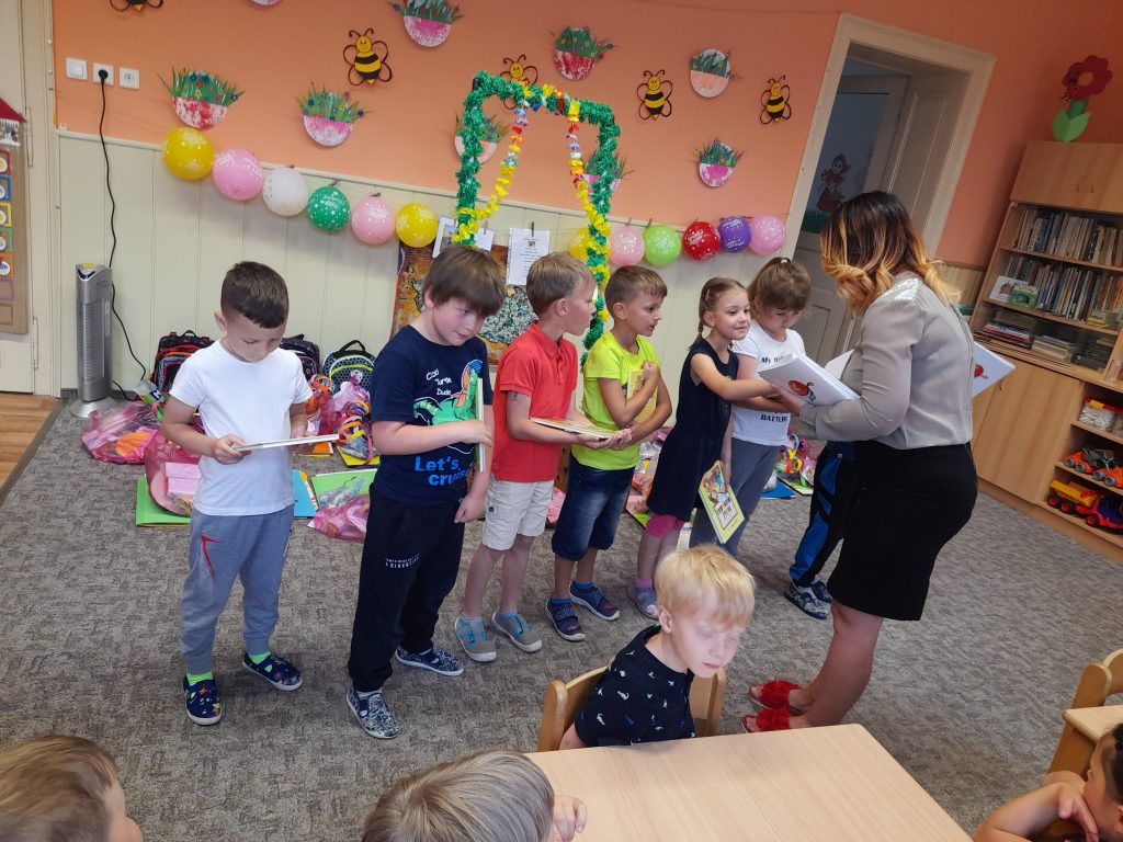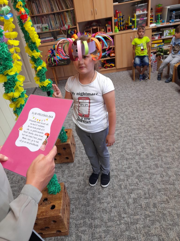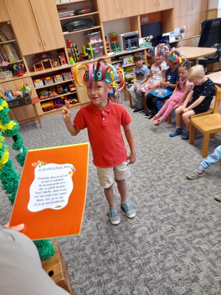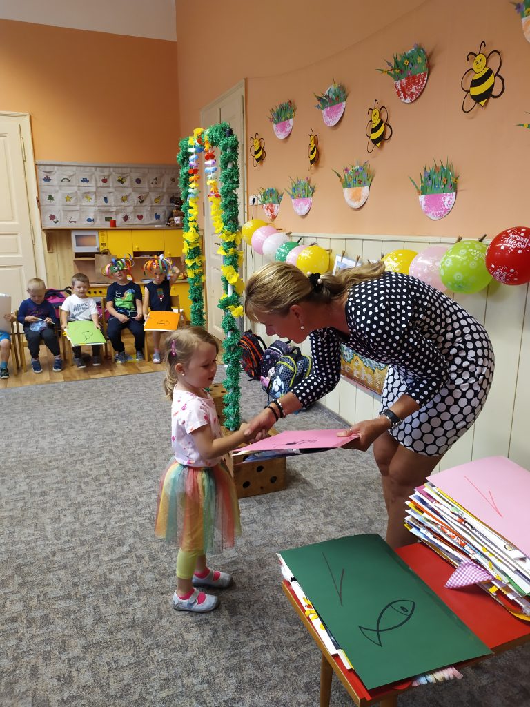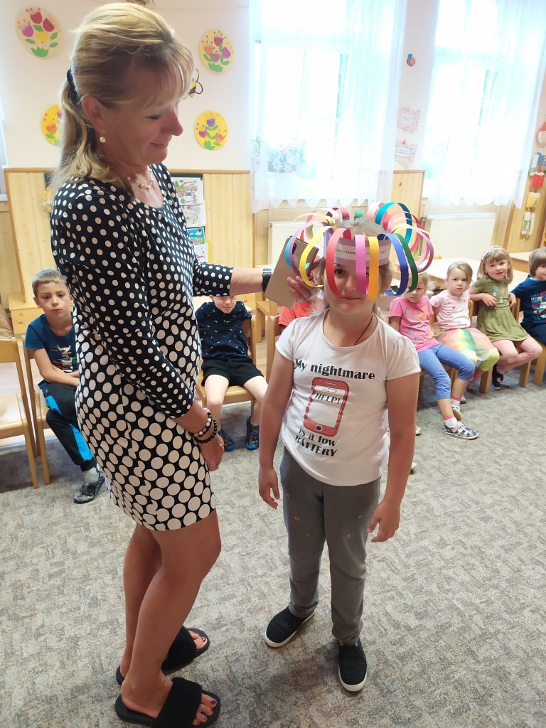 Konec školního roku jsme pojali ve velkém stylu, jak se patří. Rozdávali jsme školková vysvědčení a protože máme samé šikovné děti, byly samé jedničky. Naše nejstarší kamarády, kteří budou odcházet do první třídy, jsme slavnostně pasovali na školáky. Každý jsme si odnesl na památku drobné dárky a na úplný závěr posledního červnového dne jsme si užily hostinu a šmoulí diskotéku ve třídě i na zahradě.