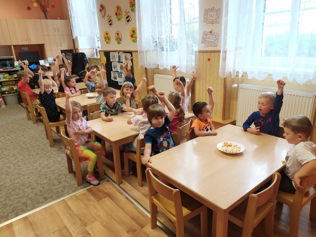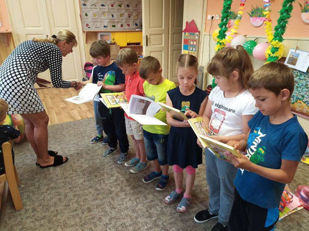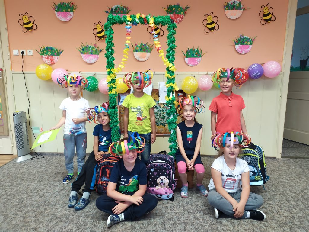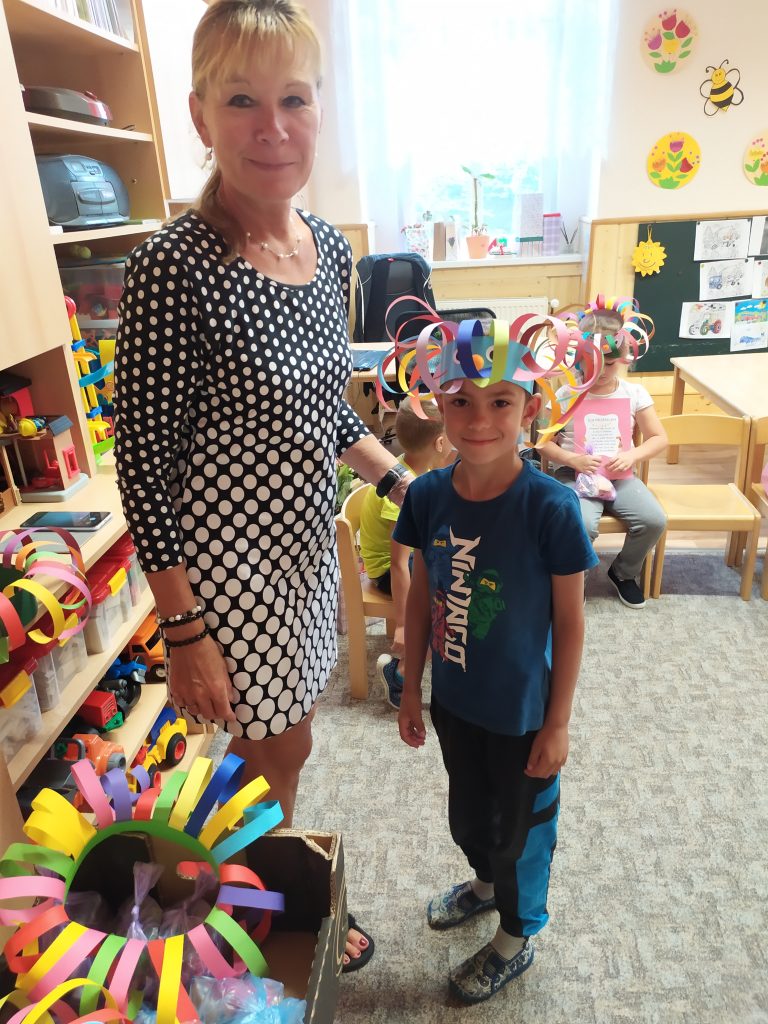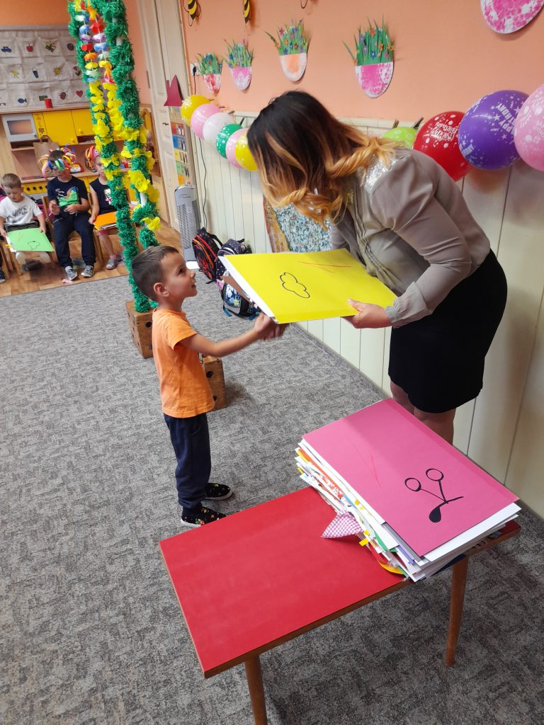 Konec školního roku jsme pojali ve velkém stylu, jak se patří. Rozdávali jsme školková vysvědčení a protože máme samé šikovné děti, byly samé jedničky. Naše nejstarší kamarády, kteří budou odcházet do první třídy, jsme slavnostně pasovali na školáky. Každý jsme si odnesl na památku drobné dárky a na úplný závěr posledního červnového dne jsme si užily hostinu a šmoulí diskotéku ve třídě i na zahradě.