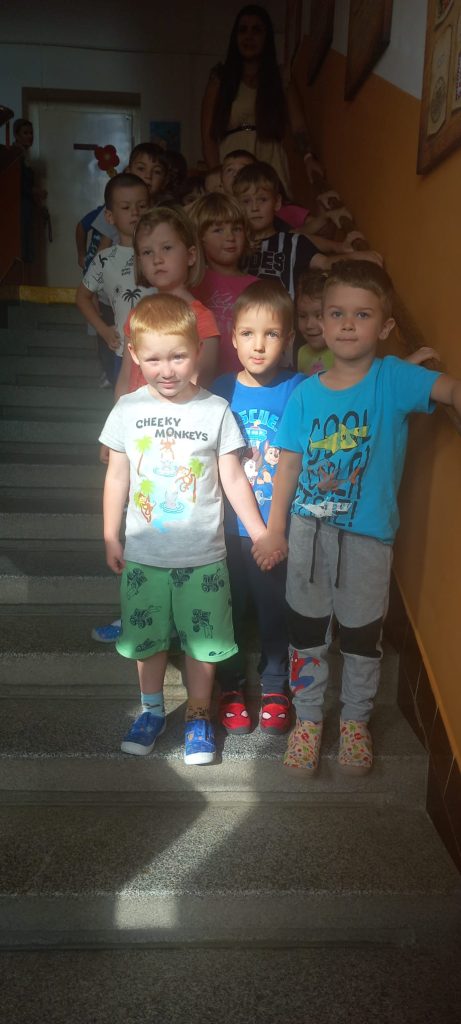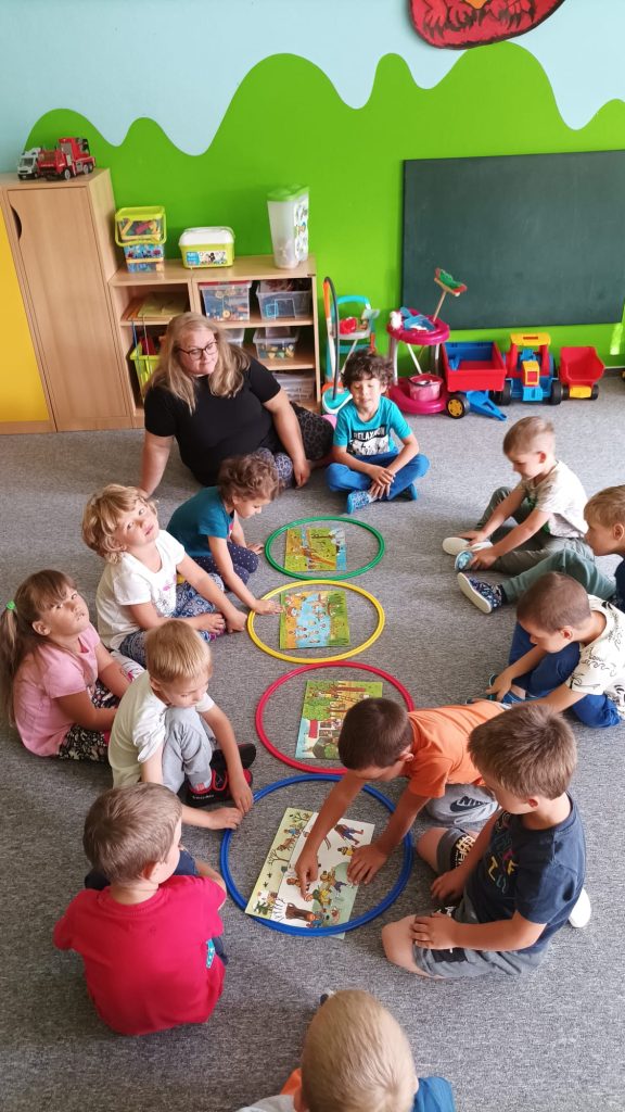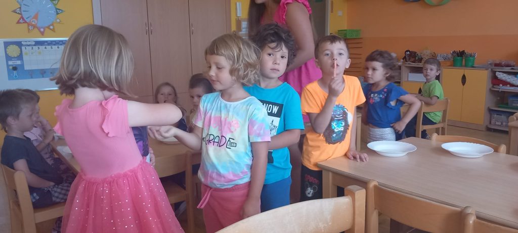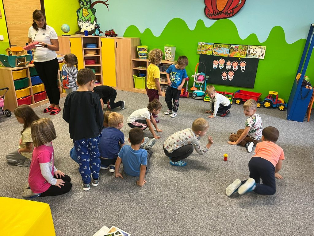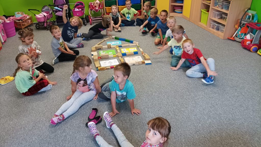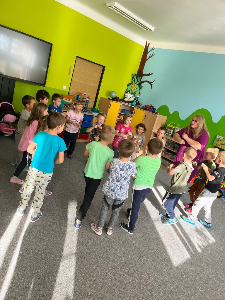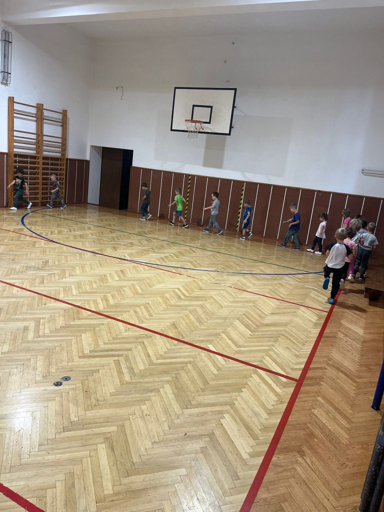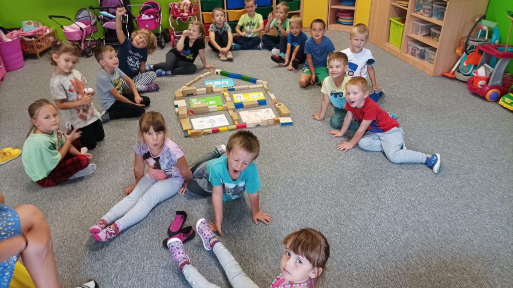 Prohlídli jsme si školu, ředitelnu, kuchyň, jídelnu i tělocvičnu. Postavili jsme školku a zjistili kam co patří. Také malá ukázka ranních her.