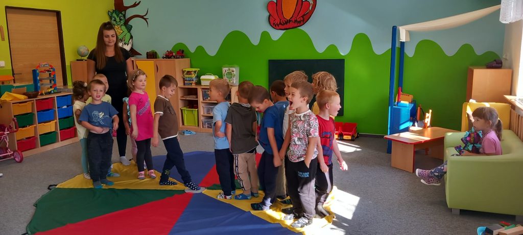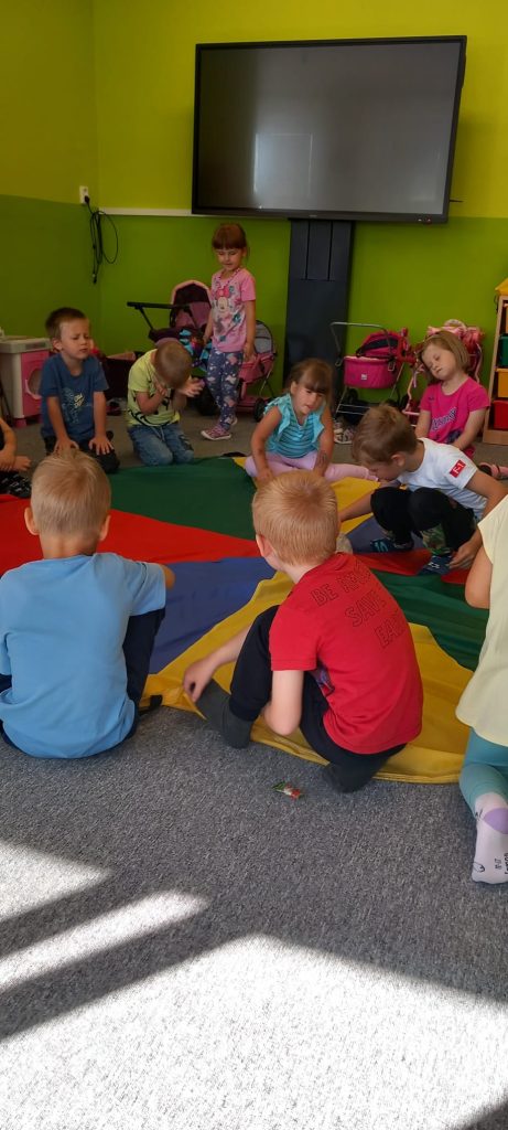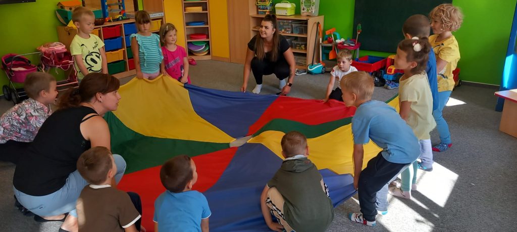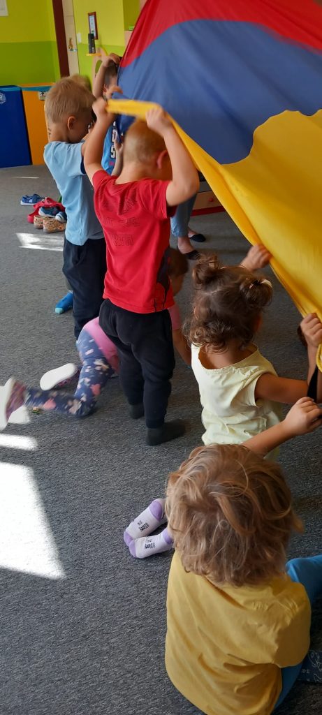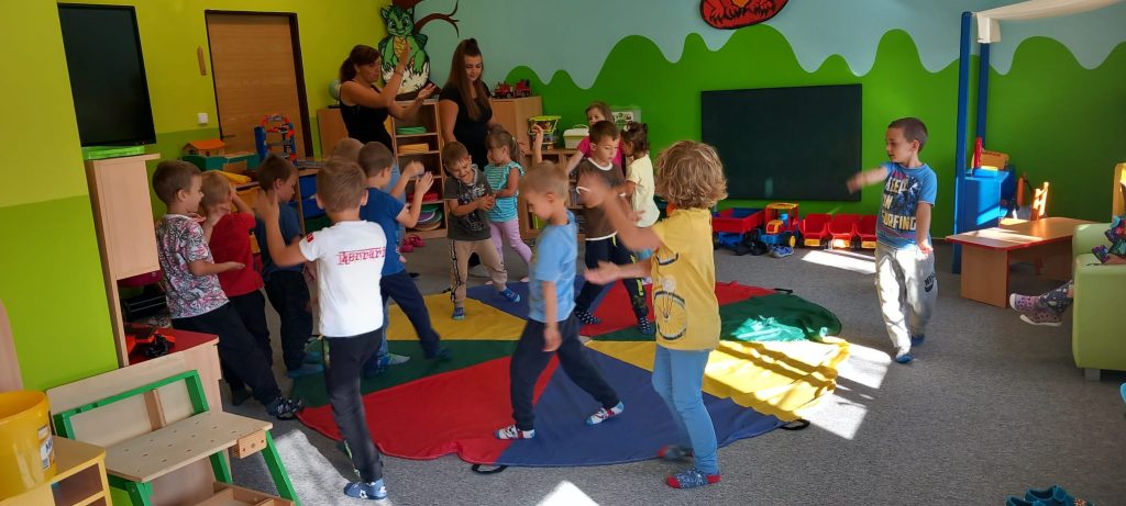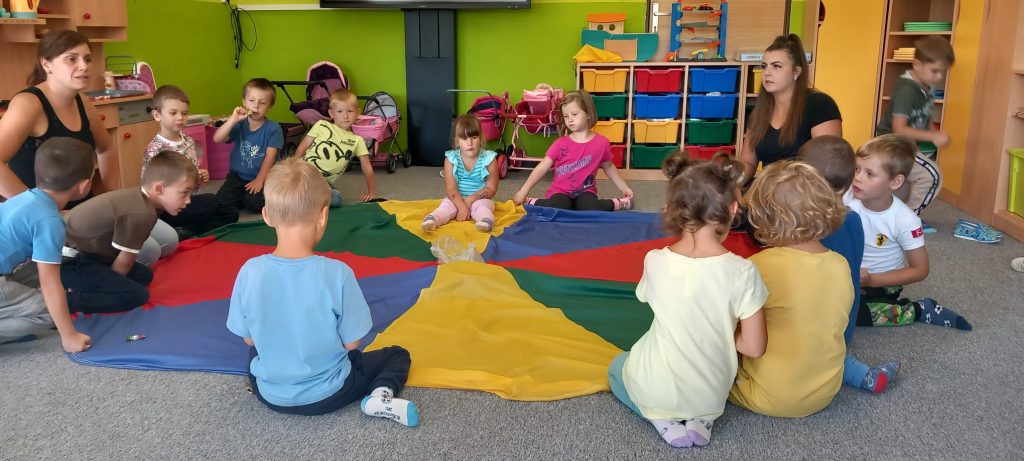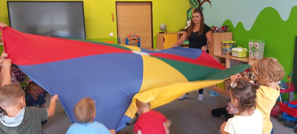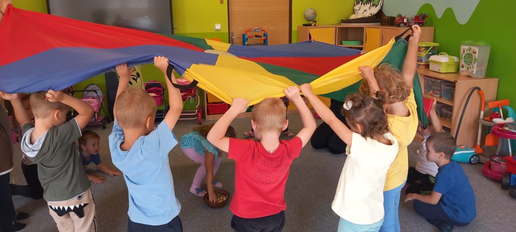Hry s padákem – schovávali jsme kamaráda, poznávali barvy, lovili bonbóny…
