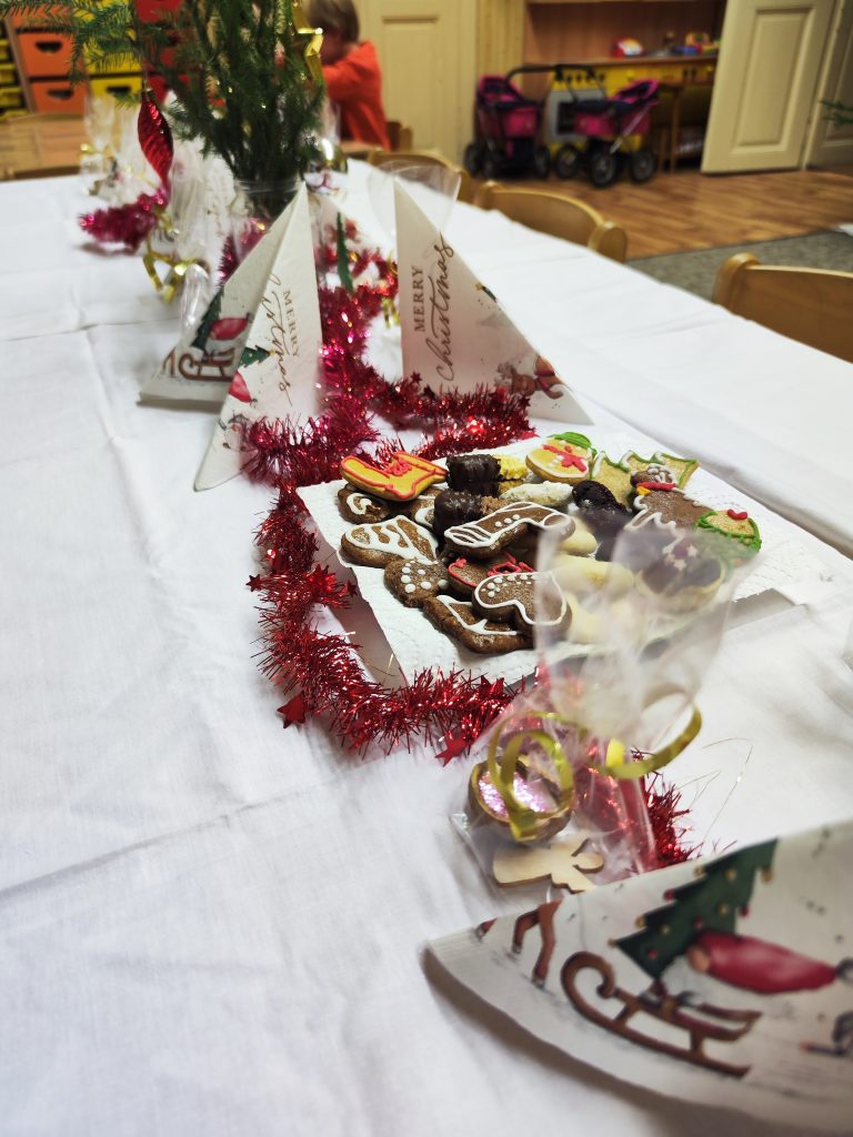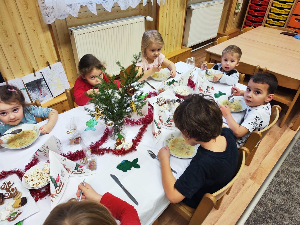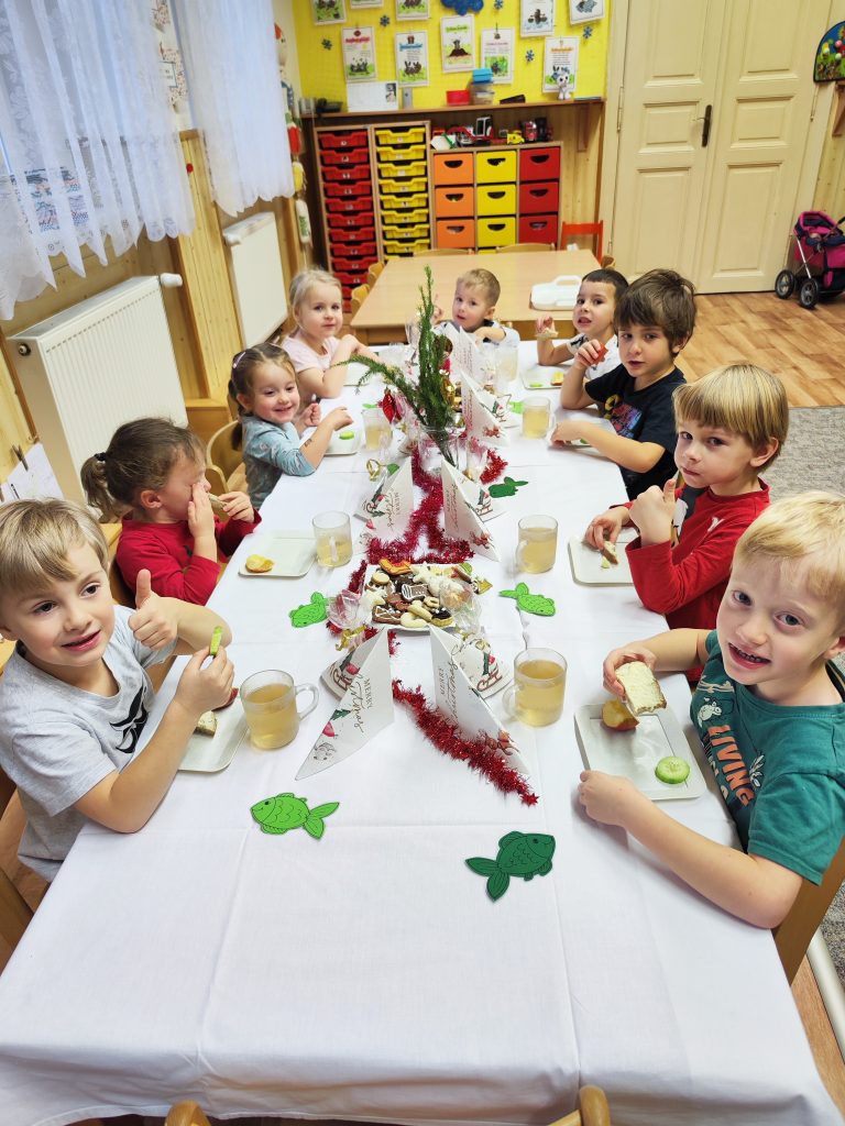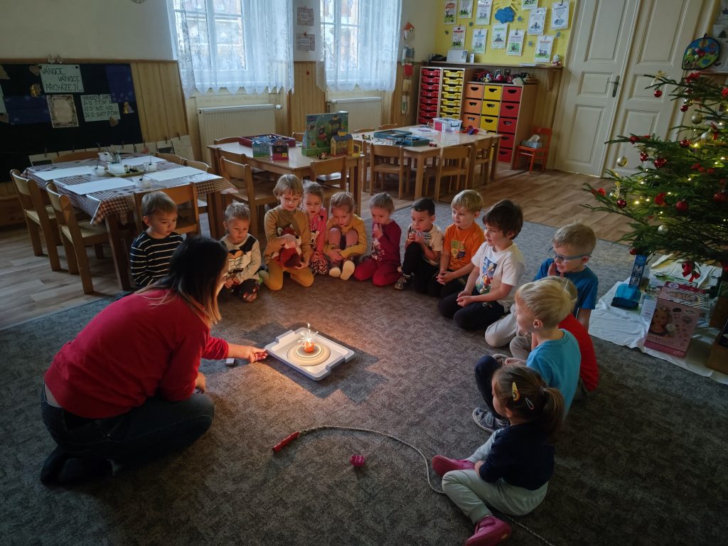 Čekání na Ježíška si krátíme nejrůznějšími aktivitami….. vyrábíme pro radost, kreslíme a malujeme, ochutnáváme cukroví od maminek, hledáme hvězdičky v jablíčkách, zkoušíme pokusy, jako třeba rozsvítit mandarinku prskavkou (funguje to☺️), zpíváme i posloucháme koledy, čteme si vánoční příběhy, prohlížíme Ladovy obrázky, hrajeme vánoční hry, stavíme Betlémy ze stavebnic a tvoříme vánoční ozdoby 🌲 Poslední den před vánočními prázdninami jsme si užili i pravou sváteční tabuli a u slavnostně prostřeného stolu nám moc chutnalo.