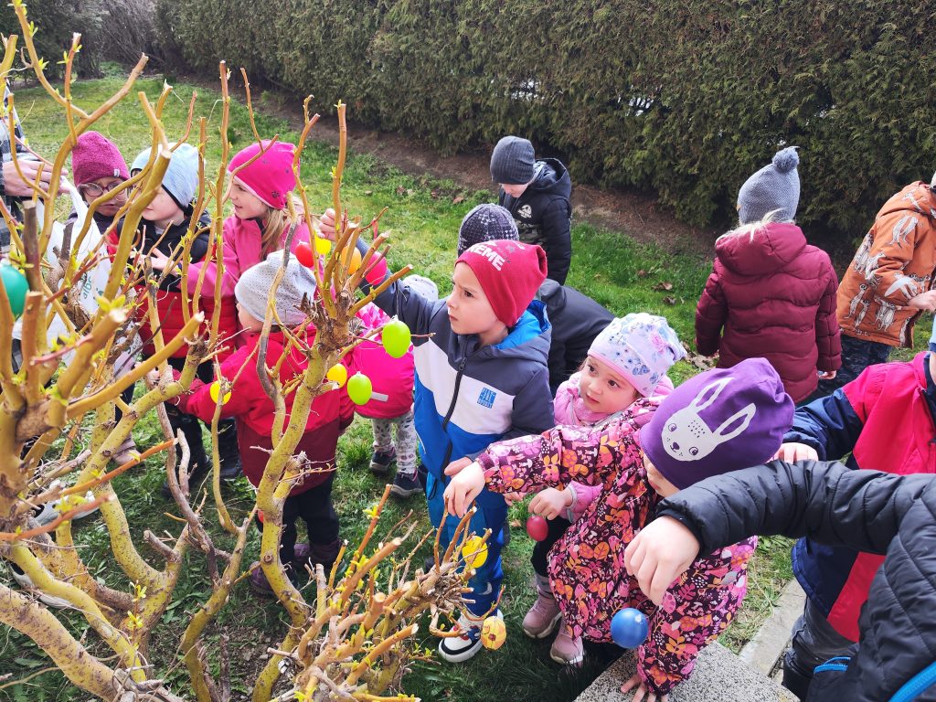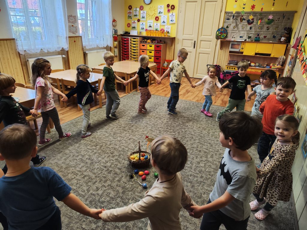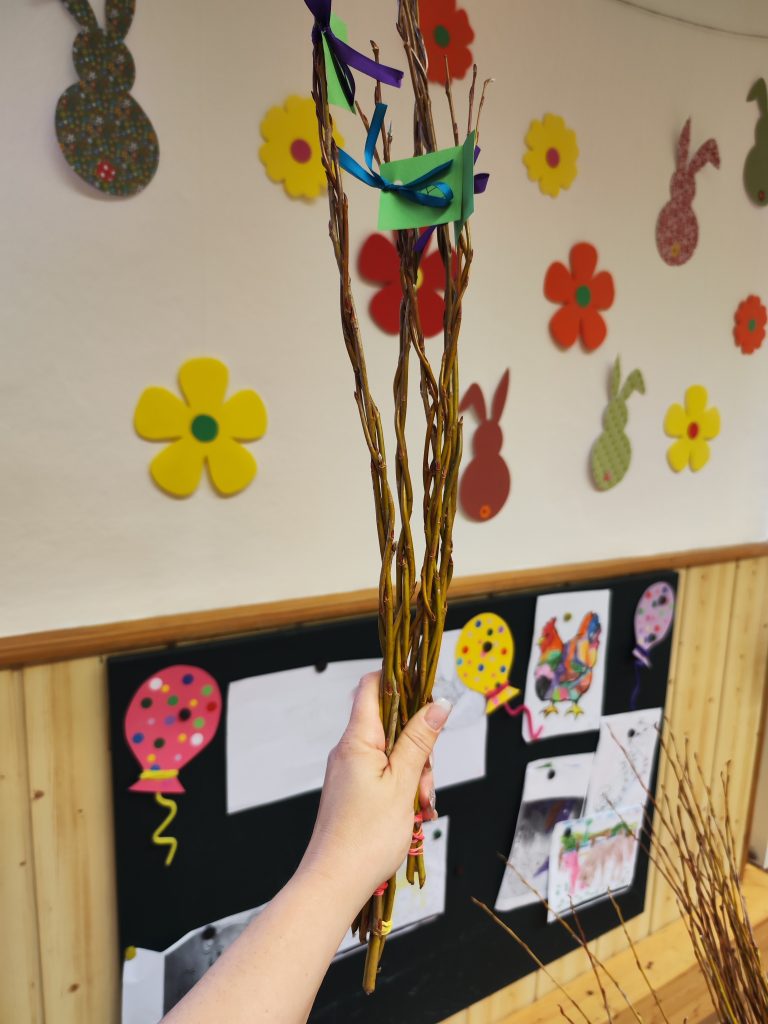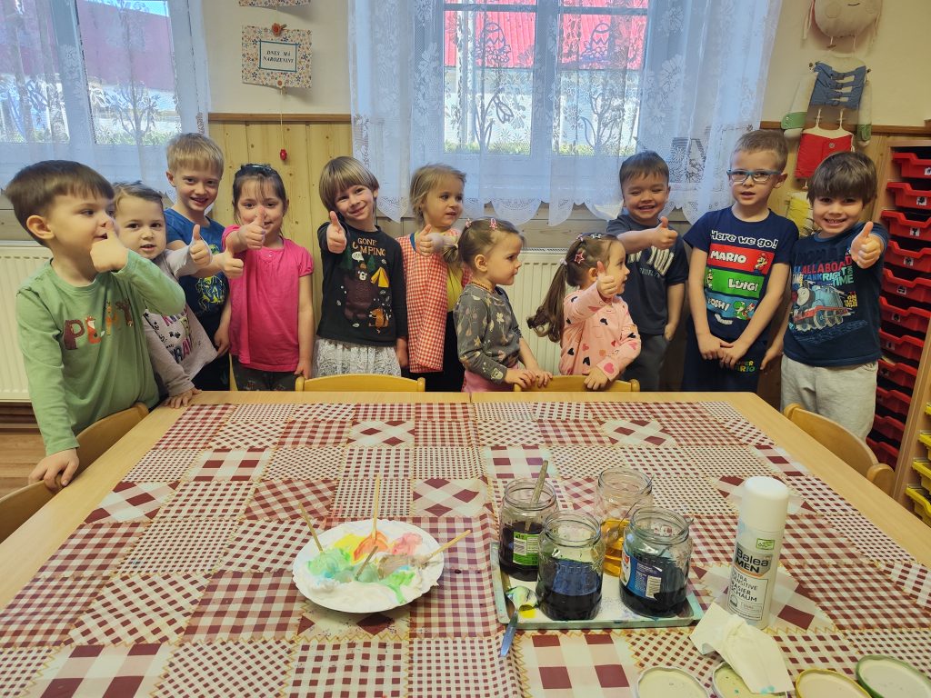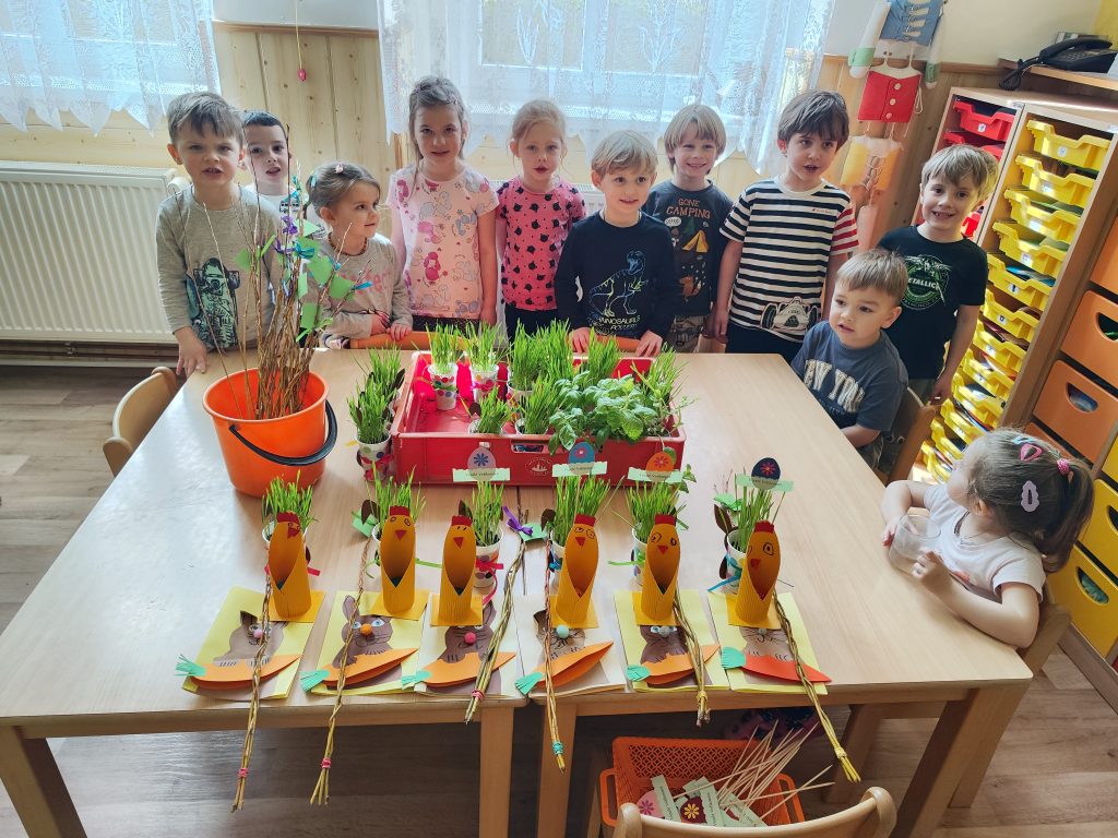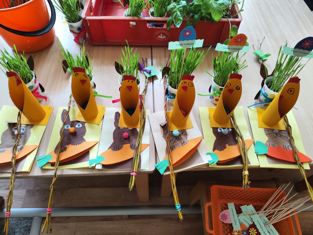 Ve zkráceném týdnu od pondělí 25.3. do čtvrtka 28. 3. 2018 probíhal v naší školce Velikonoční zkrácený týden. Dalo by se říct – čím kratší týden, tím větší plány 😀 My jsme ale šikulky a zvládli jsme vše, co bylo potřeba. Hlavním cílem týdne bylo seznamovat se se zvyky a tradicemi Velikonoc a prohlubovat povědomí o kultuře, v níž žijeme. Velikonoce jsou nejvýznamnějšími svátky jara a my jsme si tento týden s dětmi užili naplno. Zpívali jarní a velikonoční písničky, seznámili se s novými říkadly a koledami. Denně jsme si povídali o zvycích a tradicích a vysvětlovali si významy každého dne pašijoveho týdne. Na Zelený čtvrtek jsme zamávali zvonům na cestu do Říma a z plných plic na ně volali : ,,Štastnou cestu, zvony a v sobotu se nám zase vraťte!“ Shlédli jsme biblický příběh upravený pro dětské diváky, abychom si lépe uměli představit, o čem si to vlastně celý týden povídáme. Velká část týdne také patřila tvoření a vyrábění….. osení zaseté již minulý týden nám k velké radosti krásně roste, velikonoční přáníčka jsou již také připravená, vrba před vchodem ozdobená, vyrobili jsme si slepičky na vajíčka, pletli jsme pomlázky z proutků, které jsme si přinesli z procházky a barvili jsme kraslice, které jsme následně zdobili tradiční technikou malování voskem. Poslední den jsme ještě zvládli pokus s barvami, které nám zůstali po barvení vajíček. Vyzkoušeli jsme propojit celé barevné spektrum, na jehož konci nás překvapila super „bažinová“ barva. Moc jsme si přípravy na Velikonoce užili a teď už nezbývá, než hurá domů prožít krásné a pohodové svátky jara 💚🌞