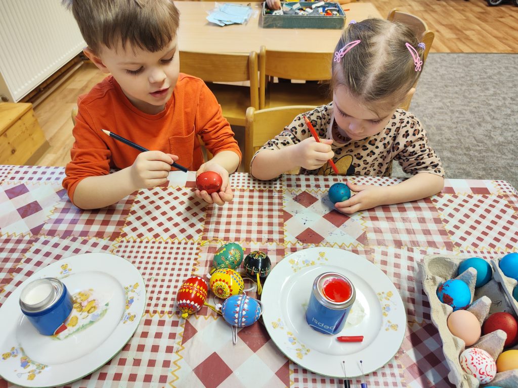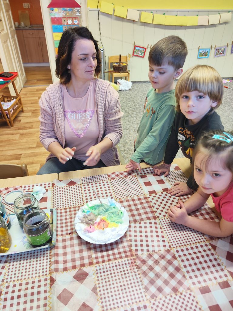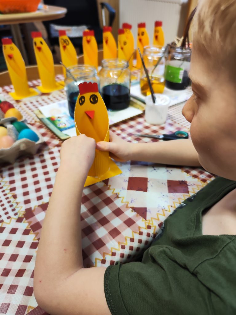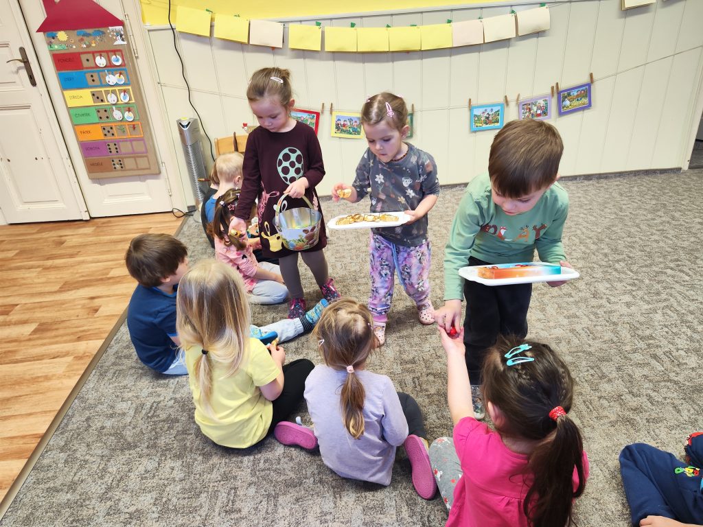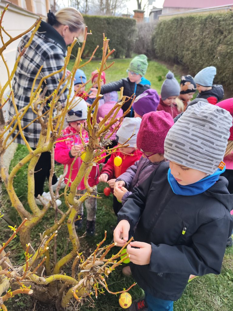 Ve zkráceném týdnu od pondělí 25.3. do čtvrtka 28. 3. 2018 probíhal v naší školce Velikonoční zkrácený týden. Dalo by se říct – čím kratší týden, tím větší plány 😀 My jsme ale šikulky a zvládli jsme vše, co bylo potřeba. Hlavním cílem týdne bylo seznamovat se se zvyky a tradicemi Velikonoc a prohlubovat povědomí o kultuře, v níž žijeme. Velikonoce jsou nejvýznamnějšími svátky jara a my jsme si tento týden s dětmi užili naplno. Zpívali jarní a velikonoční písničky, seznámili se s novými říkadly a koledami. Denně jsme si povídali o zvycích a tradicích a vysvětlovali si významy každého dne pašijoveho týdne. Na Zelený čtvrtek jsme zamávali zvonům na cestu do Říma a z plných plic na ně volali : ,,Štastnou cestu, zvony a v sobotu se nám zase vraťte!“ Shlédli jsme biblický příběh upravený pro dětské diváky, abychom si lépe uměli představit, o čem si to vlastně celý týden povídáme. Velká část týdne také patřila tvoření a vyrábění….. osení zaseté již minulý týden nám k velké radosti krásně roste, velikonoční přáníčka jsou již také připravená, vrba před vchodem ozdobená, vyrobili jsme si slepičky na vajíčka, pletli jsme pomlázky z proutků, které jsme si přinesli z procházky a barvili jsme kraslice, které jsme následně zdobili tradiční technikou malování voskem. Poslední den jsme ještě zvládli pokus s barvami, které nám zůstali po barvení vajíček. Vyzkoušeli jsme propojit celé barevné spektrum, na jehož konci nás překvapila super „bažinová“ barva. Moc jsme si přípravy na Velikonoce užili a teď už nezbývá, než hurá domů prožít krásné a pohodové svátky jara 💚🌞