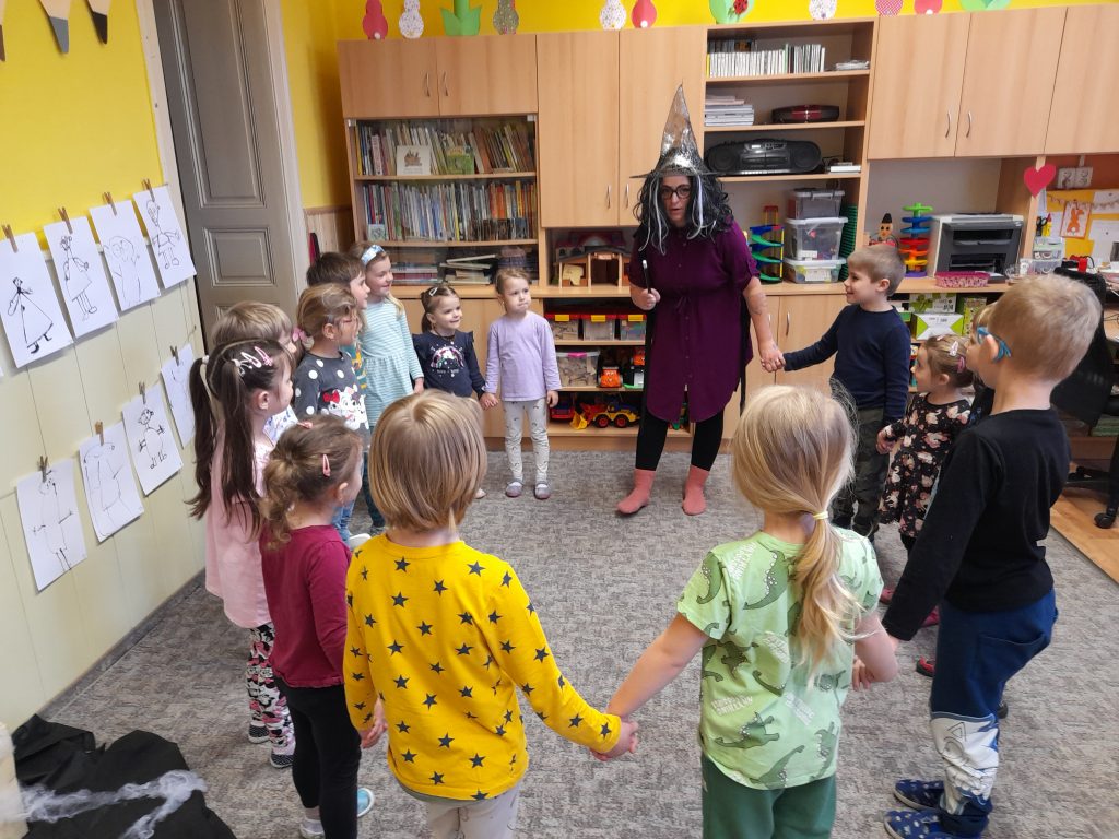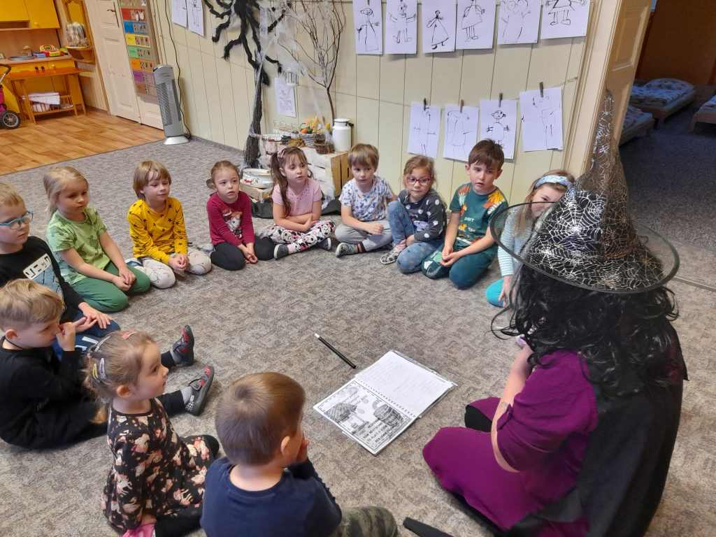 Letí, letí, milé děti, čarodějky na koštěti. Letí, letí, přátelé, čarodějky veselé. Čarodějky přiletěly, pohádky nám vyprávěly. Jak vařily lektvary, kouzlily a volaly: Pojďte s námi, milé děti, pohádky si vyprávěti. O tom, jak jsme kouzlily a lektvary vařily….