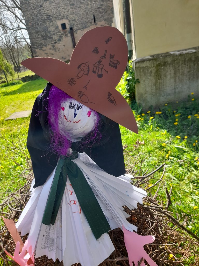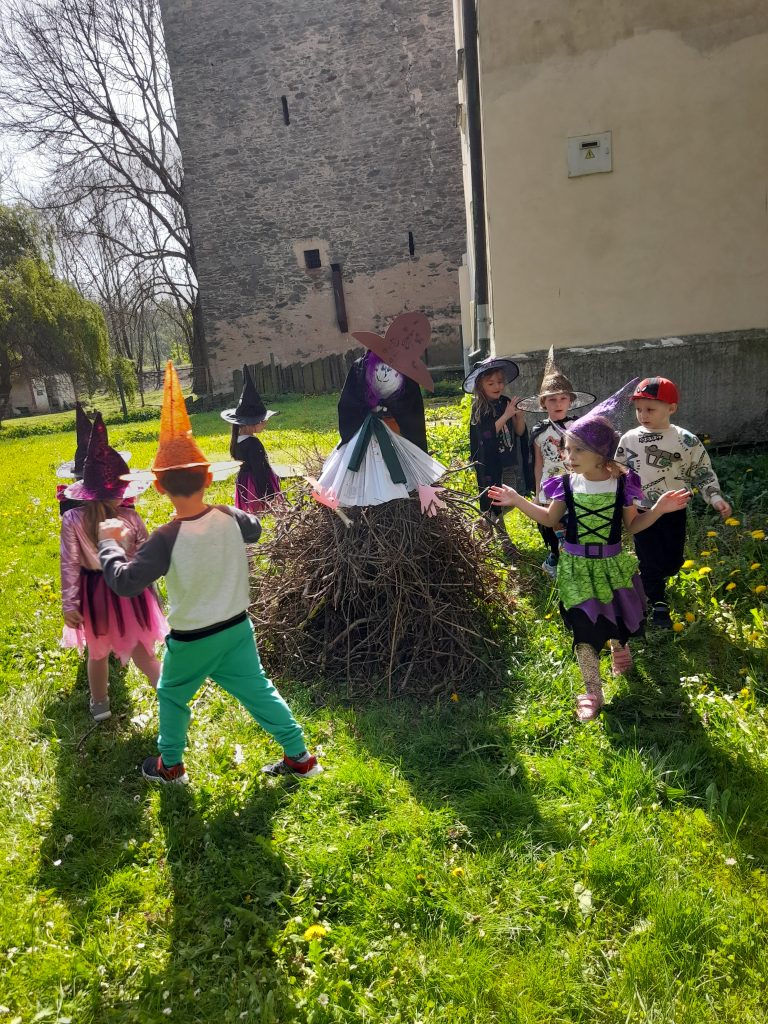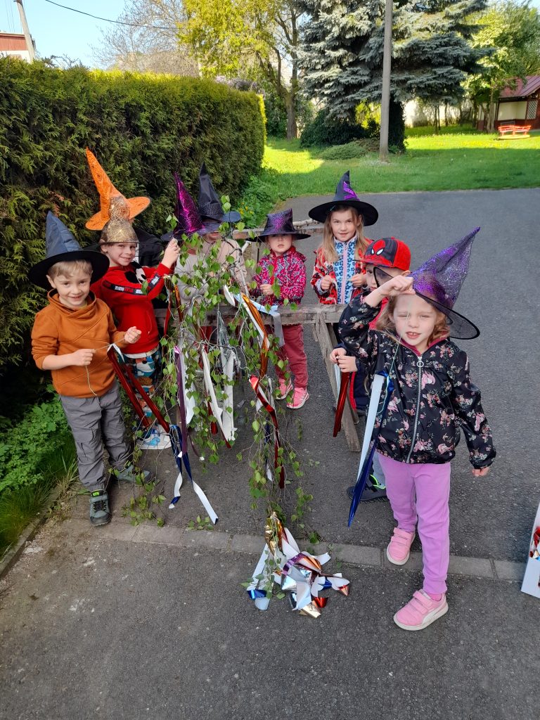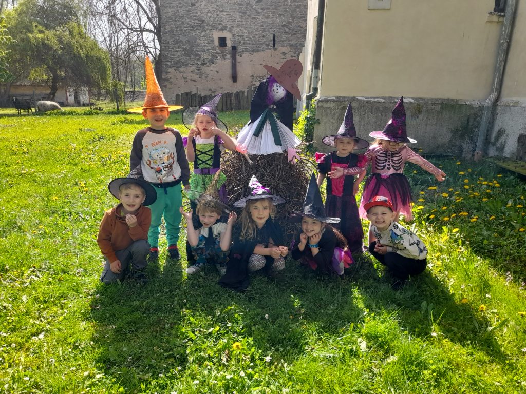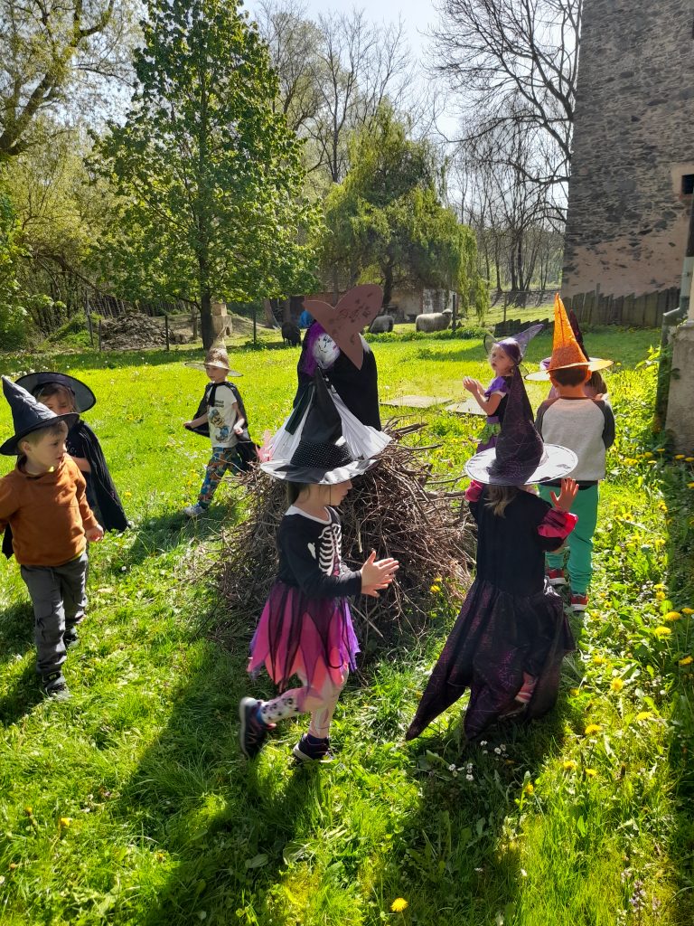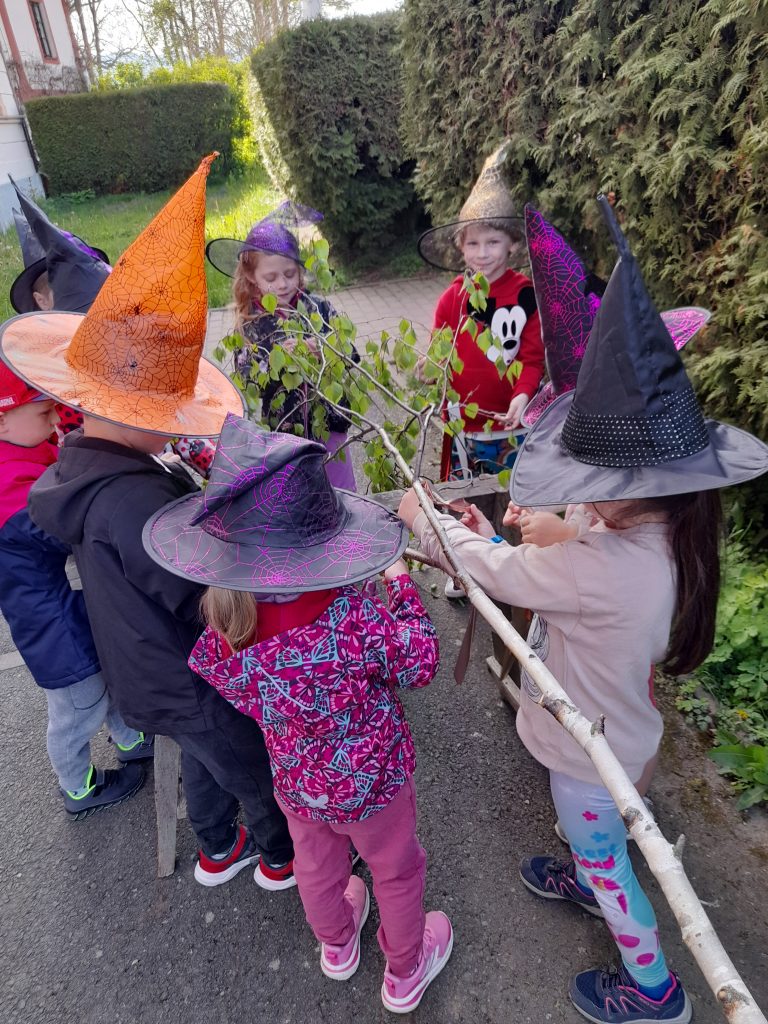 Celé naše školkové čarodějnické dovádění se neslo v duchu dobré nálady. Zpívali jsme, tancovali, povídali, vyprávěli, kouzlili a pekli, pěny z hrnků tekly 🙂 Májku jsme si ozdobily, slavnostně ji postavili. Na zahradě za plotem, po bábě se slehla zem. Celá nám zas shořela, s dýmem pryč odletěla.