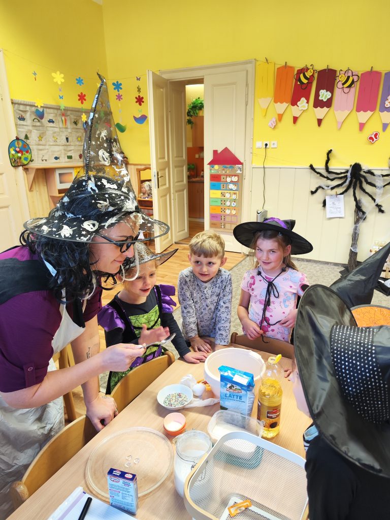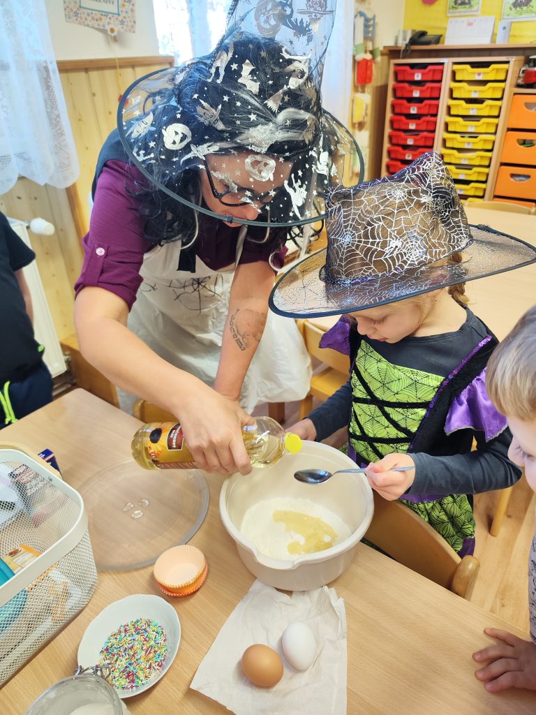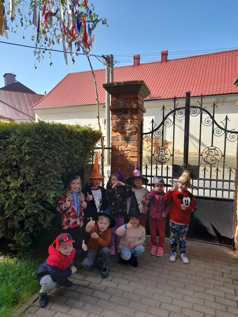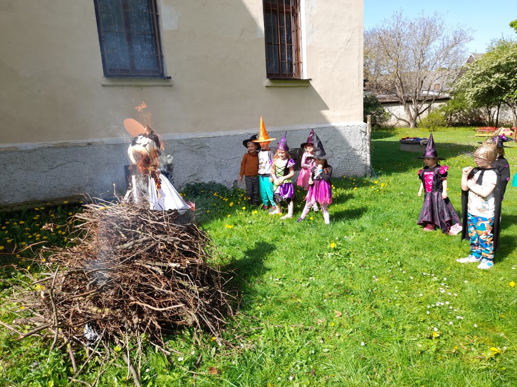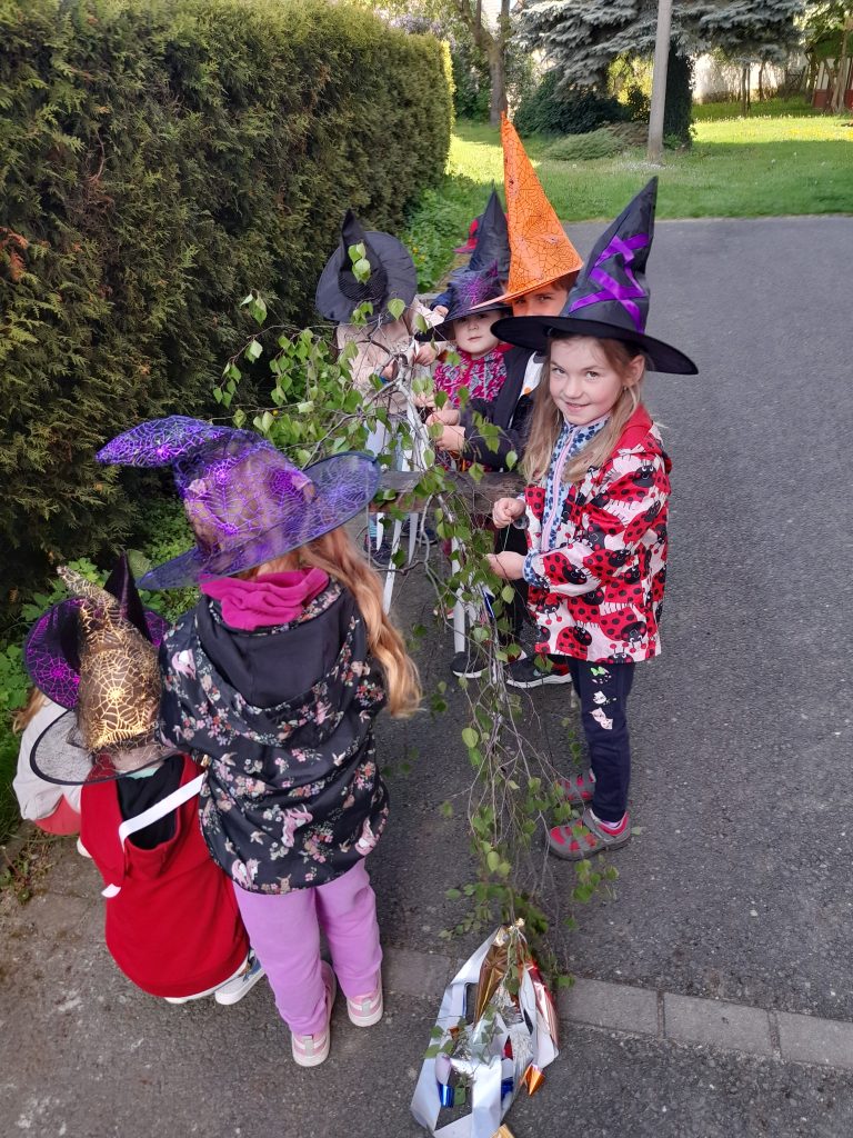 Celé naše školkové čarodějnické dovádění se neslo v duchu dobré nálady. Zpívali jsme, tancovali, povídali, vyprávěli, kouzlili a pekli, pěny z hrnků tekly 🙂 Májku jsme si ozdobily, slavnostně ji postavili. Na zahradě za plotem, po bábě se slehla zem. Celá nám zas shořela, s dýmem pryč odletěla.