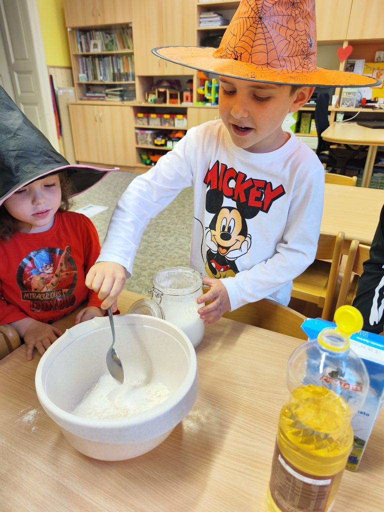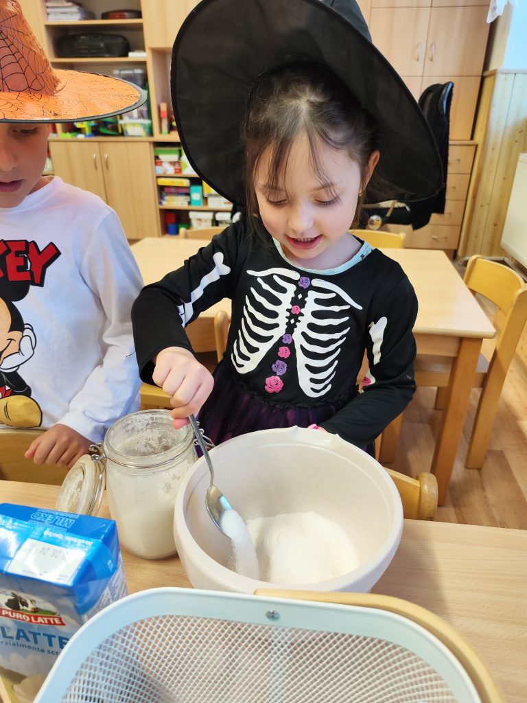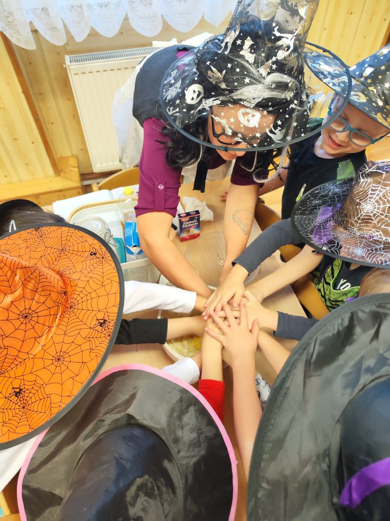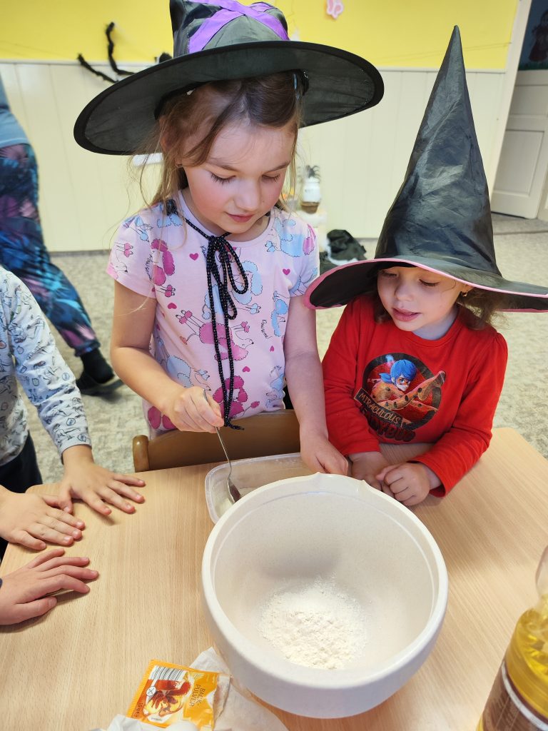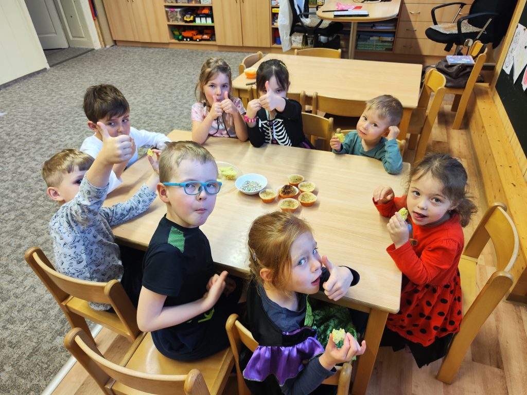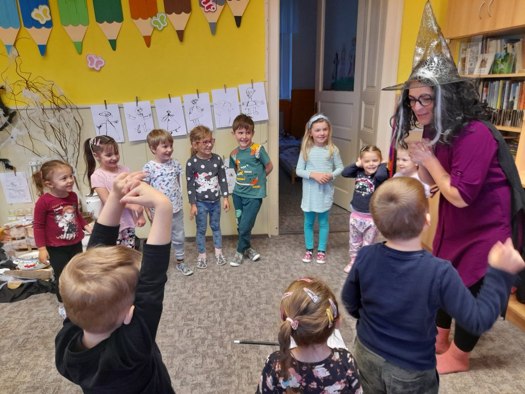 Celé naše školkové čarodějnické dovádění se neslo v duchu dobré nálady. Zpívali jsme, tancovali, povídali, vyprávěli, kouzlili a pekli, pěny z hrnků tekly 🙂 Májku jsme si ozdobily, slavnostně ji postavili. Na zahradě za plotem, po bábě se slehla zem. Celá nám zas shořela, s dýmem pryč odletěla.