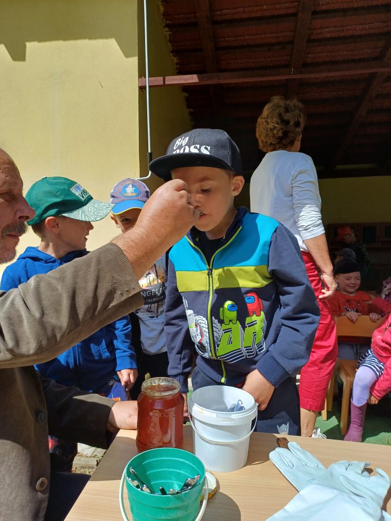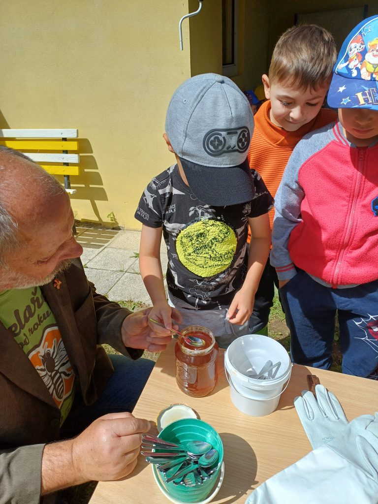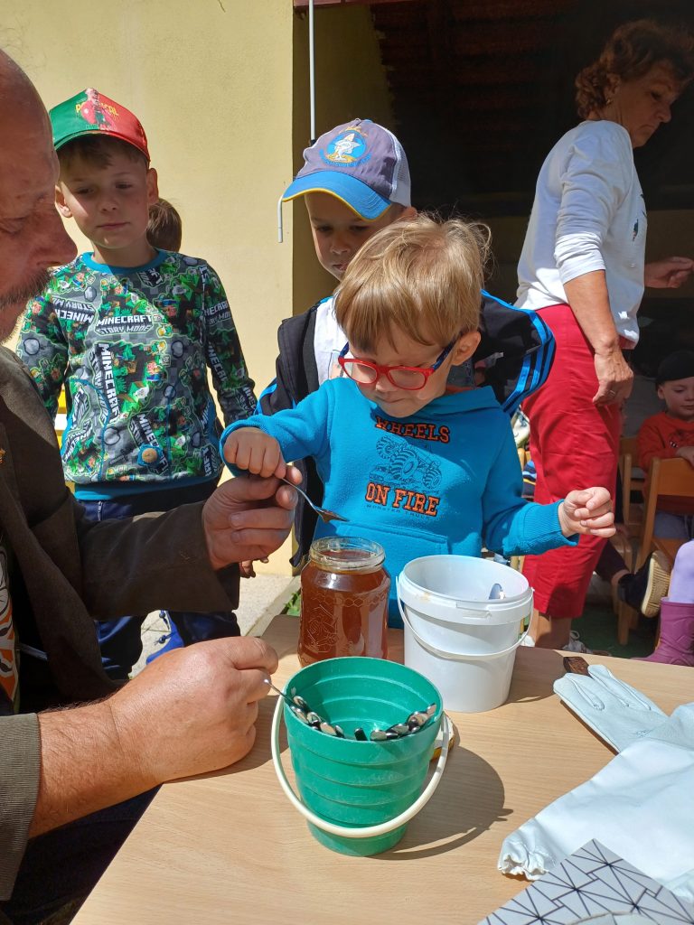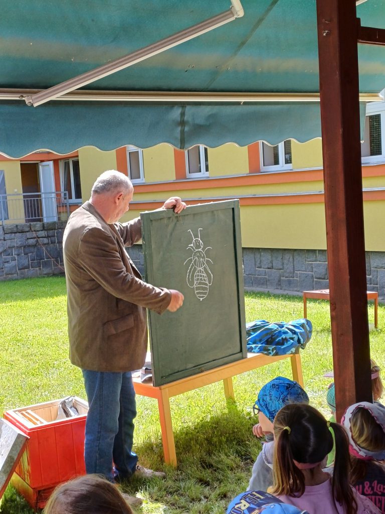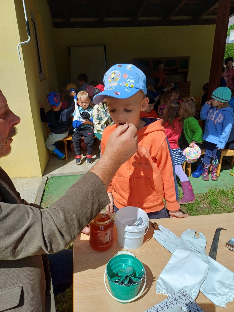 21. 5. oslavily svůj svátek všechny včelky a včeličky. K té příležitosti nás navštívil místní pan včelař a pověděl nám, proč jsou včely pro svět tak důležité a nepostradatelné. Také jsme se dozvěděli, jak to vypadá v úlu a co je všechno potřeba vědět a dělat, aby nás na konci čekala sladká odměna v podobě medu. Celá ukázka byla velmi přínosná a moc se nám líbila.