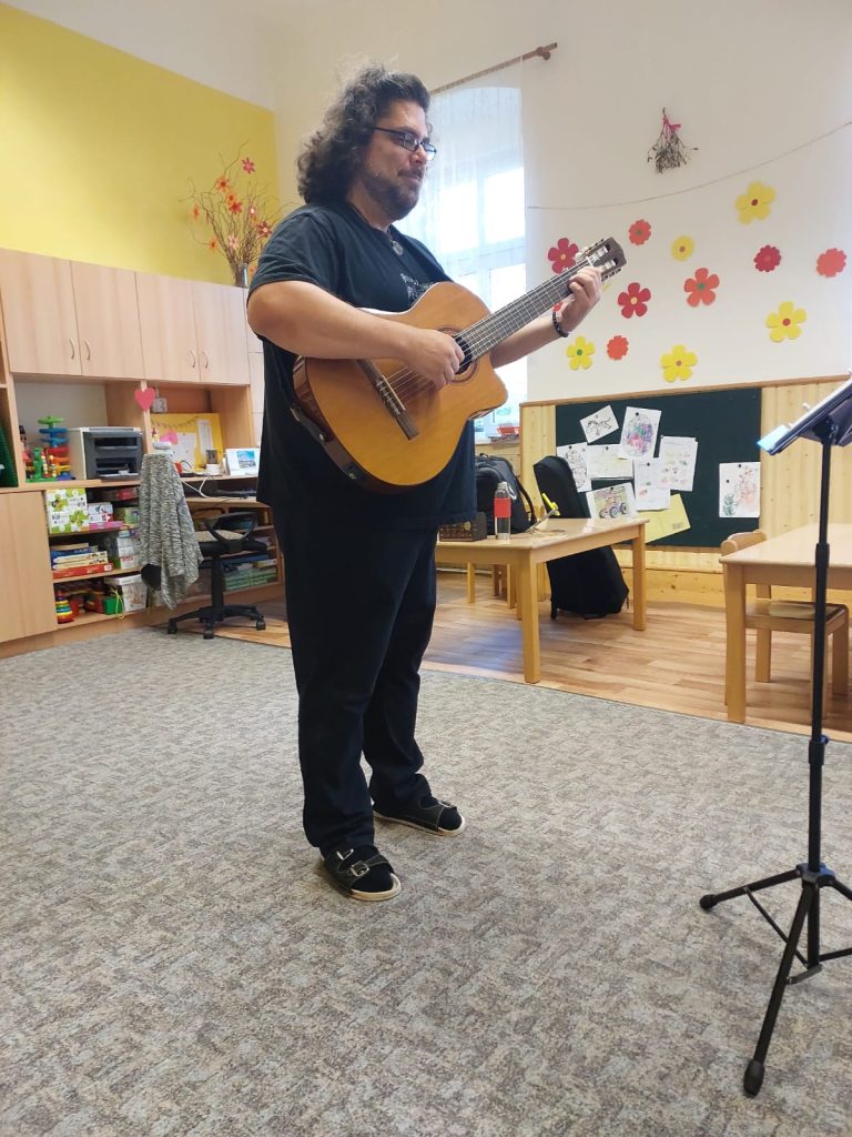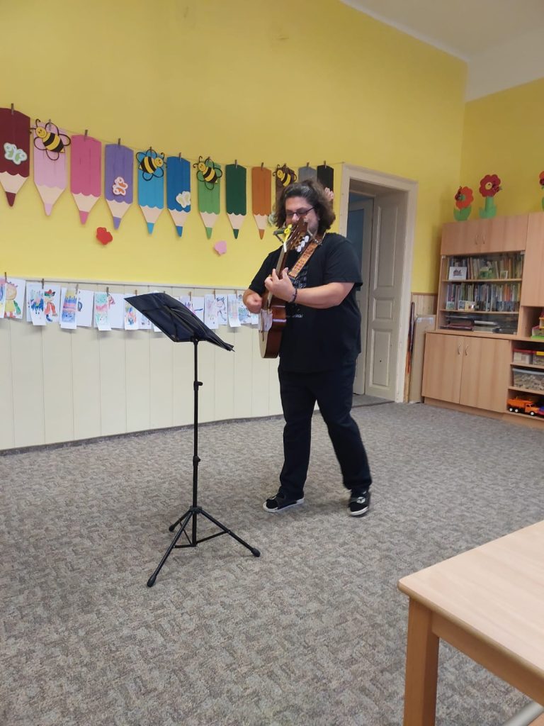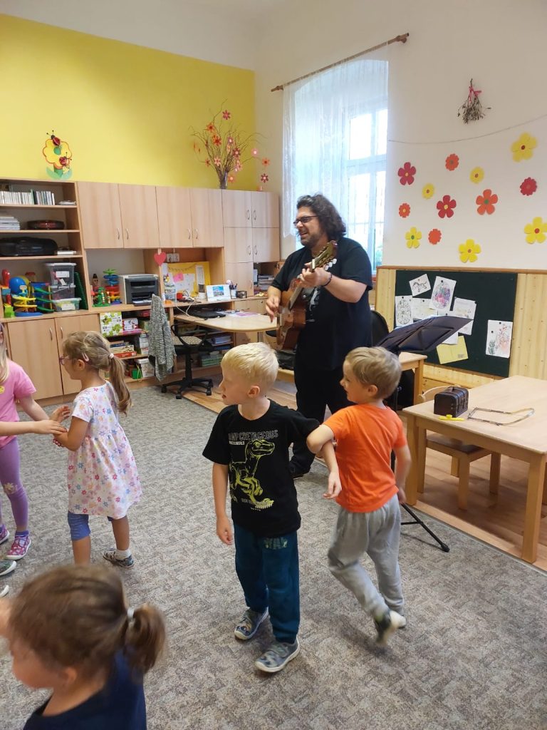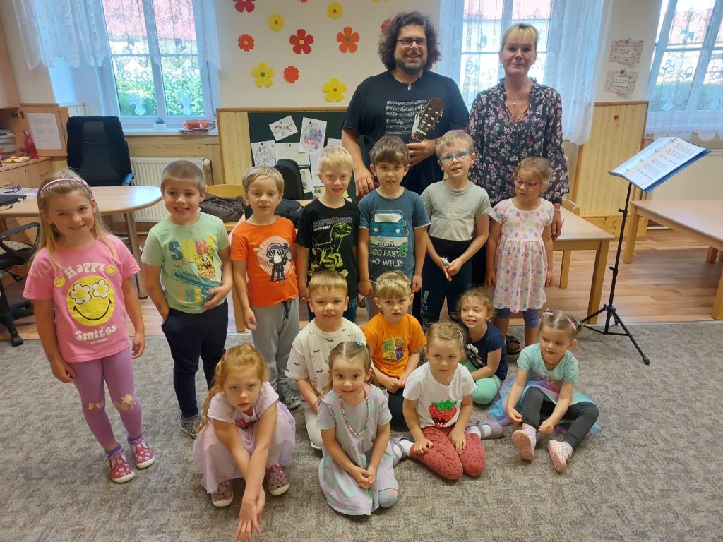 Ve čtvrtek 6.6. do naší školky zavítal nám známý hudebník a písničkář pan Fryč. Hudební představení bylo jako vždy plné pohody, zpěvu a všeobecného veselí. V rámci jeho vystoupení jsme si mohli také sami zahrát a zazpívat. Připravil si pro nás hudební kvíz a jelikož jsme chytré hlavičky, měli jsme spoustu správných odpovědí. Na závěr byl čas užít si ještě pár disco rytmů a zvesela si zatancovat.