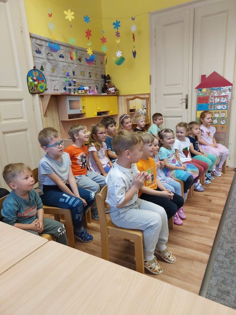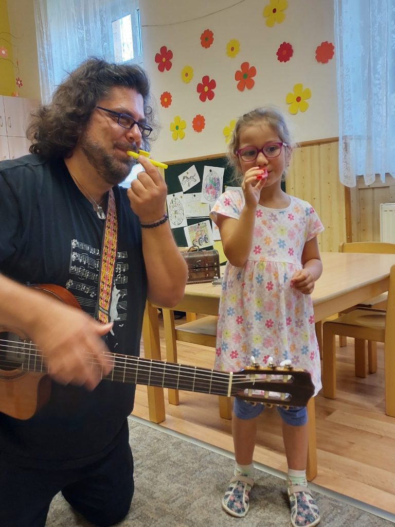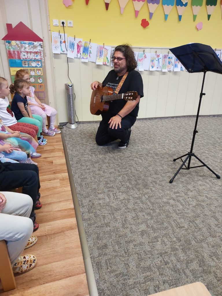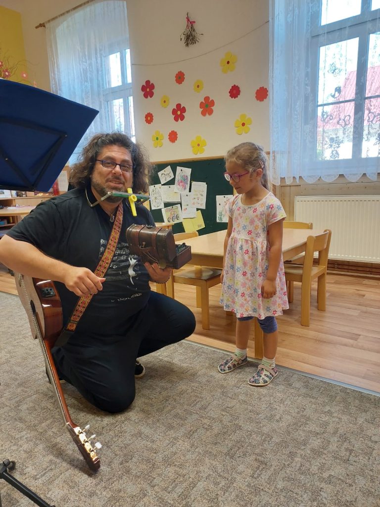 Ve čtvrtek 6.6. do naší školky zavítal nám známý hudebník a písničkář pan Fryč. Hudební představení bylo jako vždy plné pohody, zpěvu a všeobecného veselí. V rámci jeho vystoupení jsme si mohli také sami zahrát a zazpívat. Připravil si pro nás hudební kvíz a jelikož jsme chytré hlavičky, měli jsme spoustu správných odpovědí. Na závěr byl čas užít si ještě pár disco rytmů a zvesela si zatancovat.