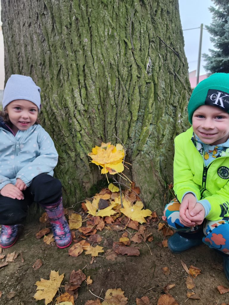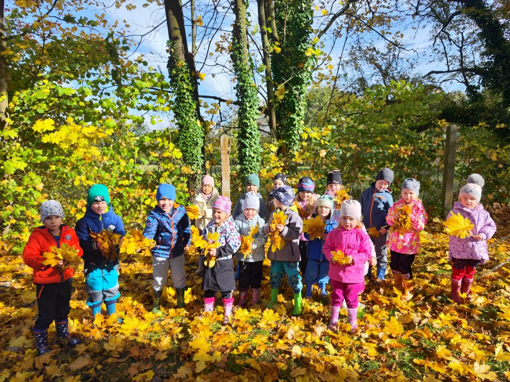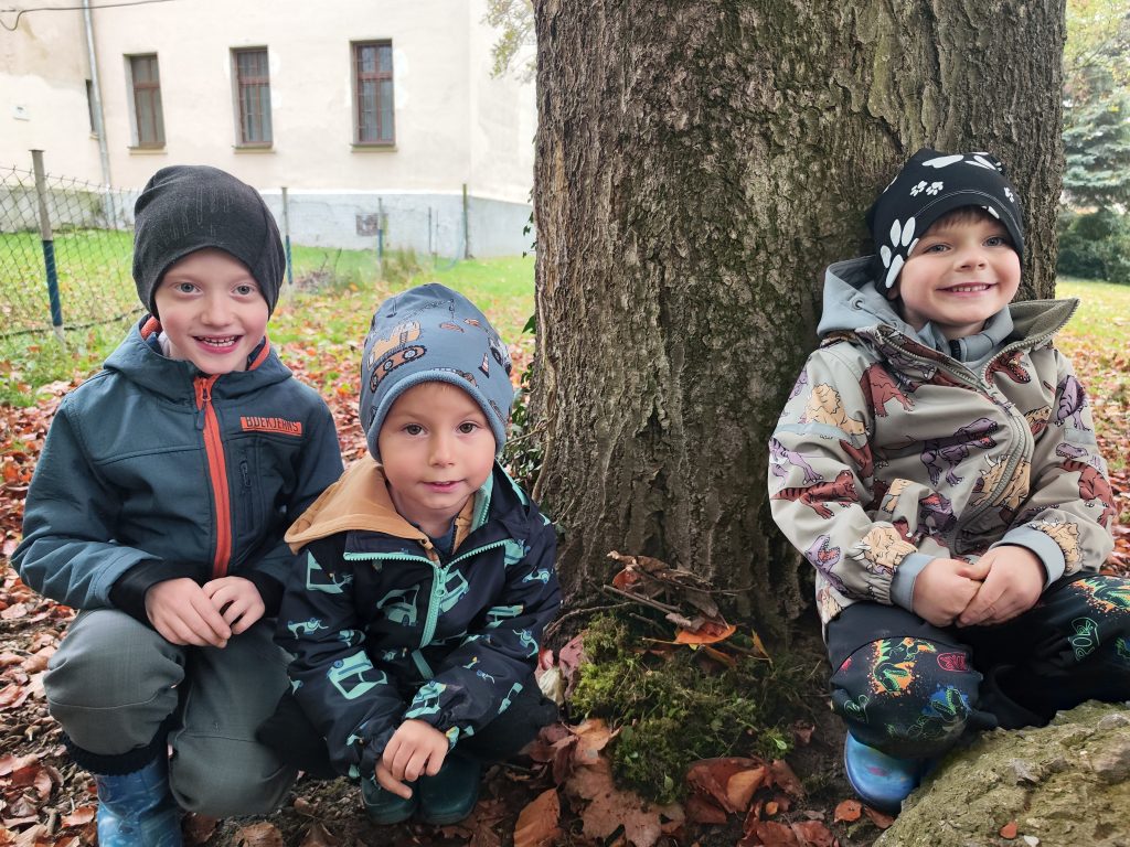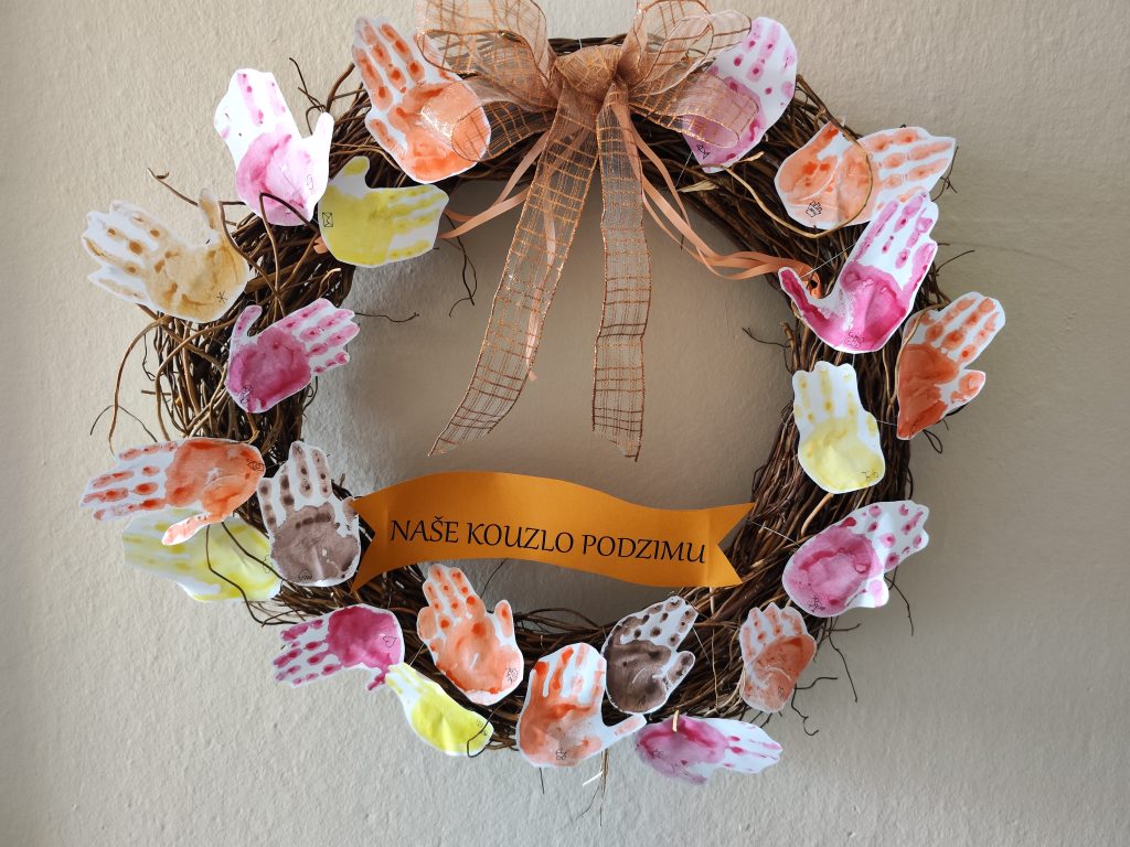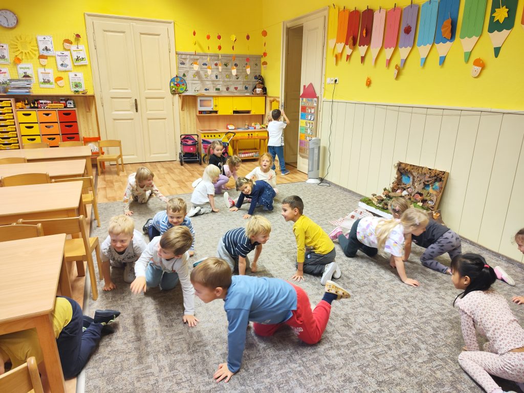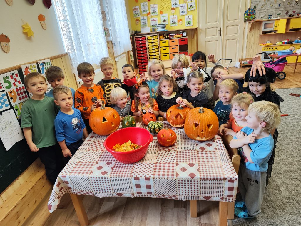 A jaký byl ten náš podzim? Byl plný barevného listí, kaštanů, šišek a nejrůznějších přírodnin, ze kterých jsme vyráběli podzimní palety a domečky pro veverky. Náš podzim také voněl houbami a chutnal jako čerstvě vymačkaný jablečný mošt. Ukazovali jsme si a učili se, jak se úroda ze zahrádky uchovává na zimu. Zvláštní pozornost jsme věnovali jabloním a připomněli si, že jabloň je nejrozšířenější ovocný strom na planetě, jablko je symbolem králů, dokáže zahnat žízeň a že je to zdroj našeho zdraví. Na procházkách jsme sbírali jablíčka naším kamarádkám ovečkám a rozdělili jsme se s nimi i o zbytky z moštování. Draci v mracích s námi zopakovali a procvičili geometrické tvary a rozvíjeli předmatematické představy. Prostorovou a vizuomotorickou orientaci jsme rozvíjeli také během puzzlíkové olympiády a vítězem byl každý, kdo dostavěl obrázek do zdárného konce. Na zahradě jsme častokrát hledali ty nejkrásnější barevné listy, porovnávali, který je menší či větší a stavěli jsme z nich hmyzí domečky. Jaké bylo nadšení, když jsme v nich druhý den opravdu našli broučka, šneka, žížalu nebo můru. Na obrázcích i na procházkách jsme rozlišovali listnaté a jehličnaté stromy a povídali si o tom, jak se zvířátka připravují na zimu a jak bychom jim měli pomáhat. Dušičkové období jsme trávili přípravou na lampiónový průvod a společnými silami jsme vytvořili spoustu kouzelně strašidelných dýňových luceren, jak bychom řekli při angličtině ,,Jack O’Lantern“. Náš podzim byl vlastně takový, jaký by měl být….. barevný, kouzelný a pestrý.