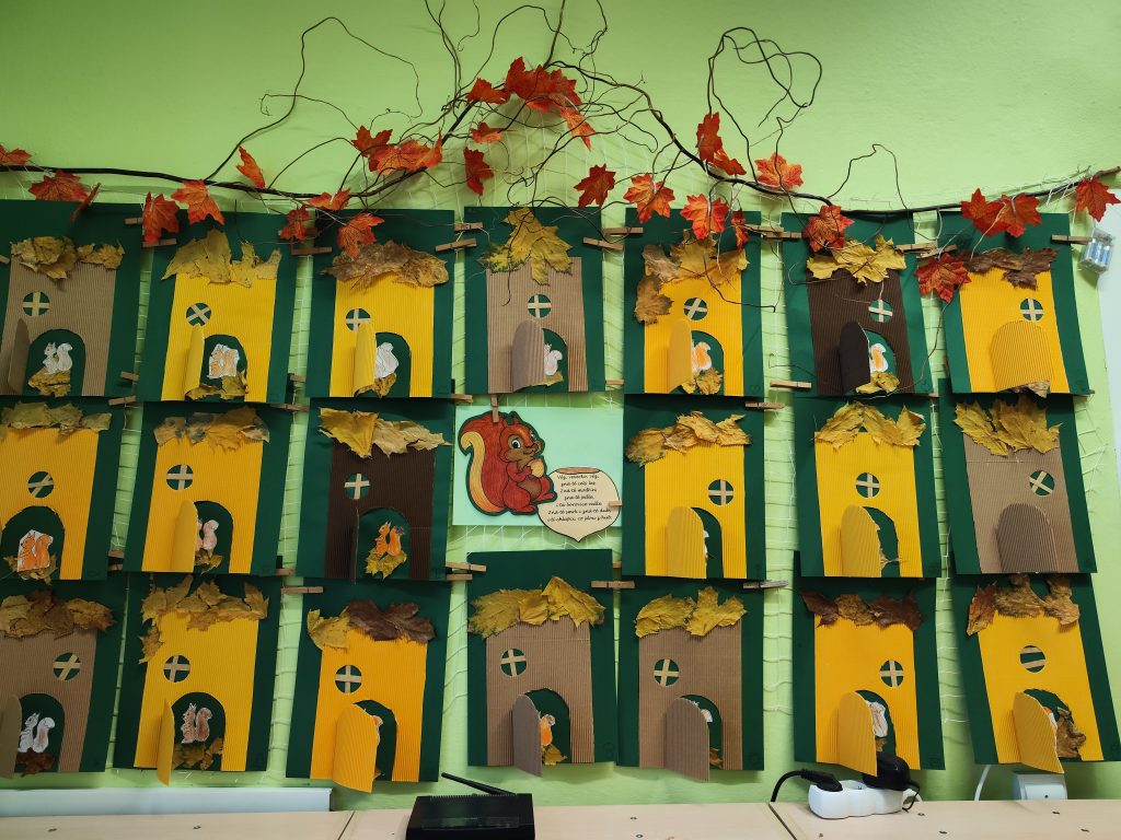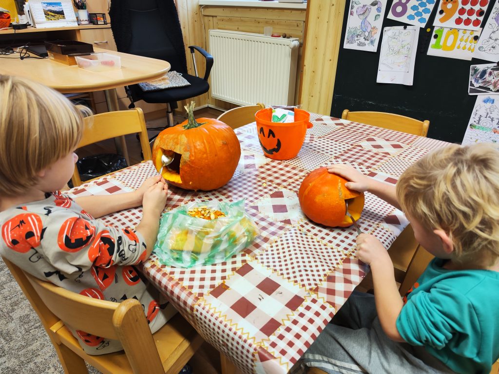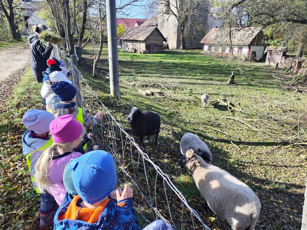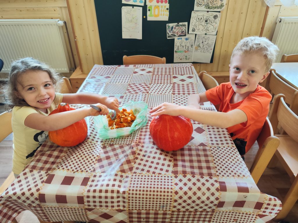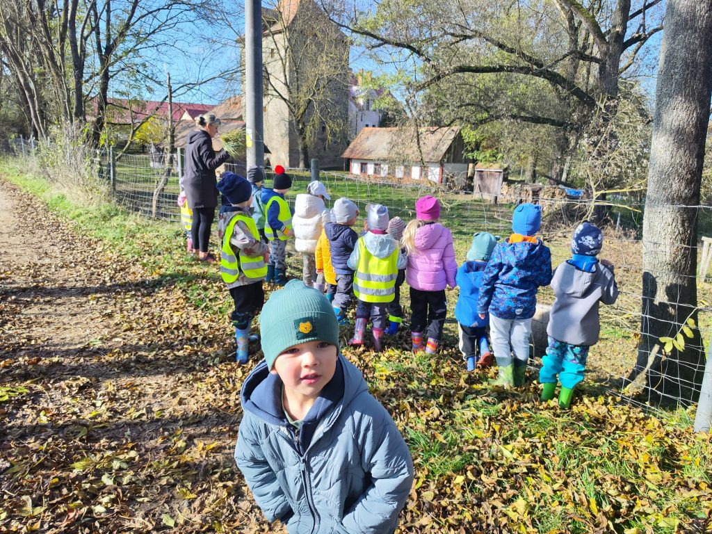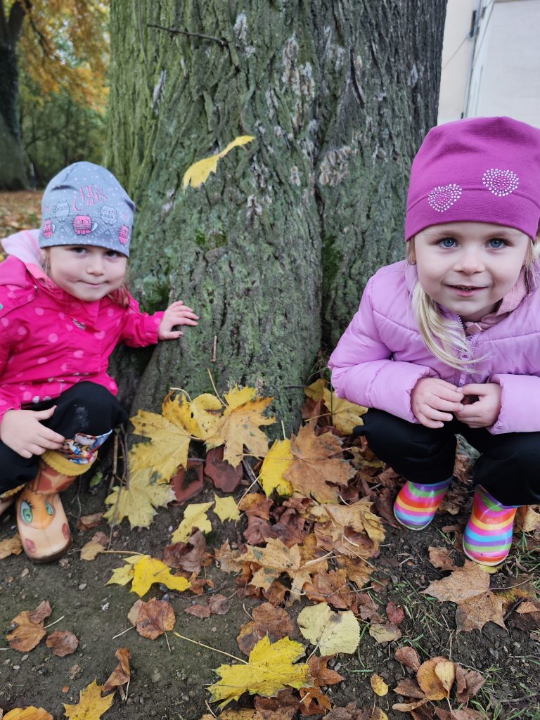A jaký byl ten náš podzim? Byl plný barevného listí, kaštanů, šišek a nejrůznějších přírodnin, ze kterých jsme vyráběli podzimní palety a domečky pro veverky. Náš podzim také voněl houbami a chutnal jako čerstvě vymačkaný jablečný mošt. Ukazovali jsme si a učili se, jak se úroda ze zahrádky uchovává na zimu. Zvláštní pozornost jsme věnovali jabloním a připomněli si, že jabloň je nejrozšířenější ovocný strom na planetě, jablko je symbolem králů, dokáže zahnat žízeň a že je to zdroj našeho zdraví. Na procházkách jsme sbírali jablíčka naším kamarádkám ovečkám a rozdělili jsme se s nimi i o zbytky z moštování. Draci v mracích s námi zopakovali a procvičili geometrické tvary a rozvíjeli předmatematické představy. Prostorovou a vizuomotorickou orientaci jsme rozvíjeli také během puzzlíkové olympiády a vítězem byl každý, kdo dostavěl obrázek do zdárného konce. Na zahradě jsme častokrát hledali ty nejkrásnější barevné listy, porovnávali, který je menší či větší a stavěli jsme z nich hmyzí domečky. Jaké bylo nadšení, když jsme v nich druhý den opravdu našli broučka, šneka, žížalu nebo můru. Na obrázcích i na procházkách jsme rozlišovali listnaté a jehličnaté stromy a povídali si o tom, jak se zvířátka připravují na zimu a jak bychom jim měli pomáhat. Dušičkové období jsme trávili přípravou na lampiónový průvod a společnými silami jsme vytvořili spoustu kouzelně strašidelných dýňových luceren, jak bychom řekli při angličtině ,,Jack O’Lantern“. Náš podzim byl vlastně takový, jaký by měl být….. barevný, kouzelný a pestrý.