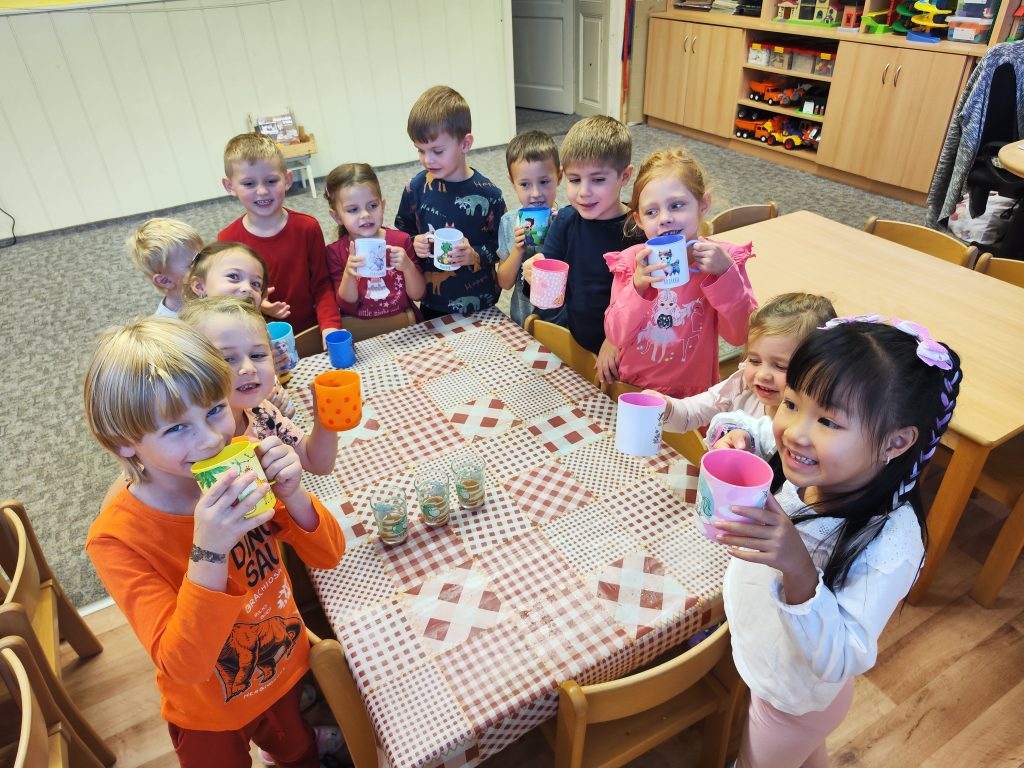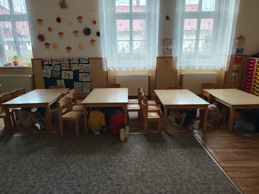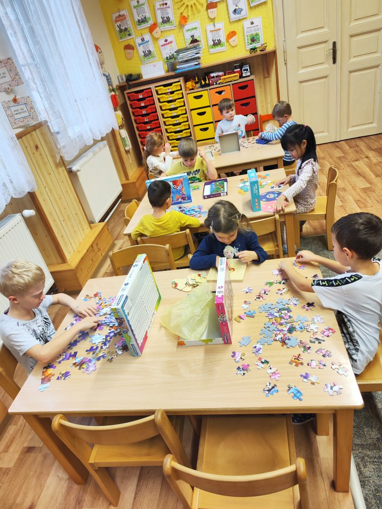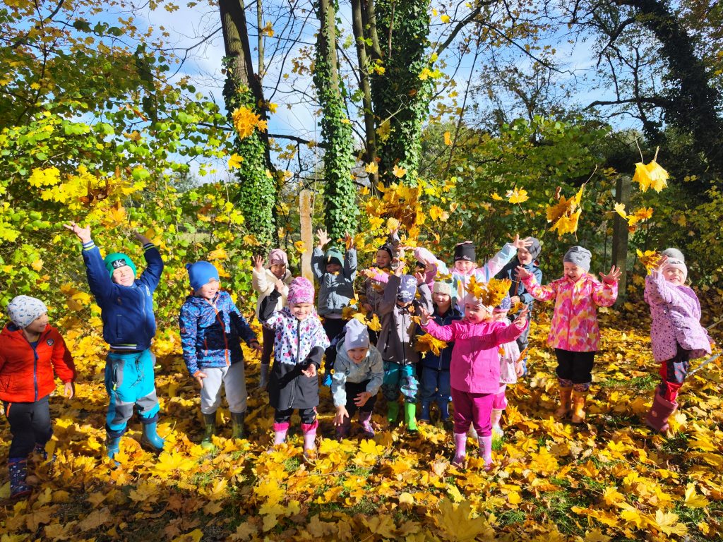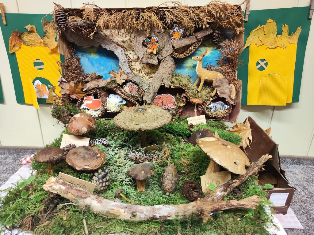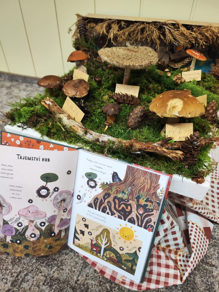 A jaký byl ten náš podzim? Byl plný barevného listí, kaštanů, šišek a nejrůznějších přírodnin, ze kterých jsme vyráběli podzimní palety a domečky pro veverky. Náš podzim také voněl houbami a chutnal jako čerstvě vymačkaný jablečný mošt. Ukazovali jsme si a učili se, jak se úroda ze zahrádky uchovává na zimu. Zvláštní pozornost jsme věnovali jabloním a připomněli si, že jabloň je nejrozšířenější ovocný strom na planetě, jablko je symbolem králů, dokáže zahnat žízeň a že je to zdroj našeho zdraví. Na procházkách jsme sbírali jablíčka naším kamarádkám ovečkám a rozdělili jsme se s nimi i o zbytky z moštování. Draci v mracích s námi zopakovali a procvičili geometrické tvary a rozvíjeli předmatematické představy. Prostorovou a vizuomotorickou orientaci jsme rozvíjeli také během puzzlíkové olympiády a vítězem byl každý, kdo dostavěl obrázek do zdárného konce. Na zahradě jsme častokrát hledali ty nejkrásnější barevné listy, porovnávali, který je menší či větší a stavěli jsme z nich hmyzí domečky. Jaké bylo nadšení, když jsme v nich druhý den opravdu našli broučka, šneka, žížalu nebo můru. Na obrázcích i na procházkách jsme rozlišovali listnaté a jehličnaté stromy a povídali si o tom, jak se zvířátka připravují na zimu a jak bychom jim měli pomáhat. Dušičkové období jsme trávili přípravou na lampiónový průvod a společnými silami jsme vytvořili spoustu kouzelně strašidelných dýňových luceren, jak bychom řekli při angličtině ,,Jack O’Lantern“. Náš podzim byl vlastně takový, jaký by měl být….. barevný, kouzelný a pestrý.