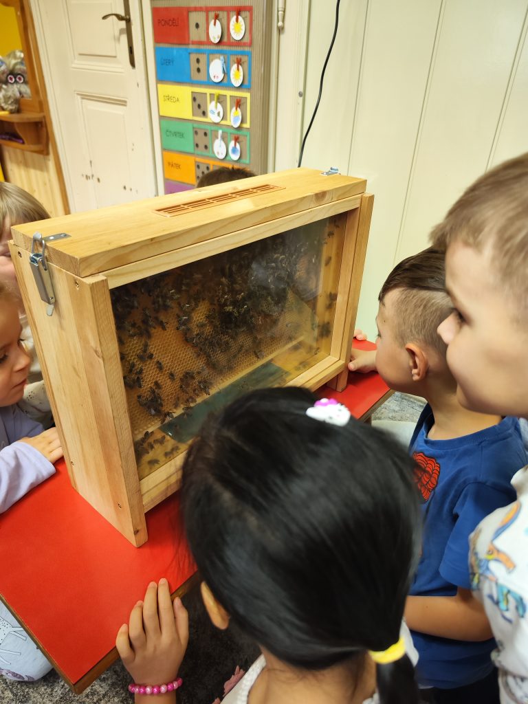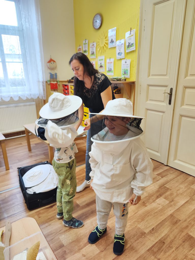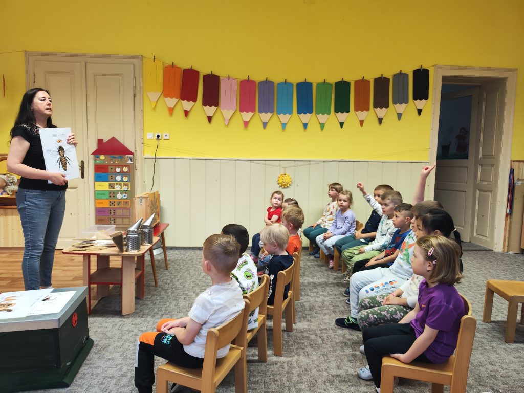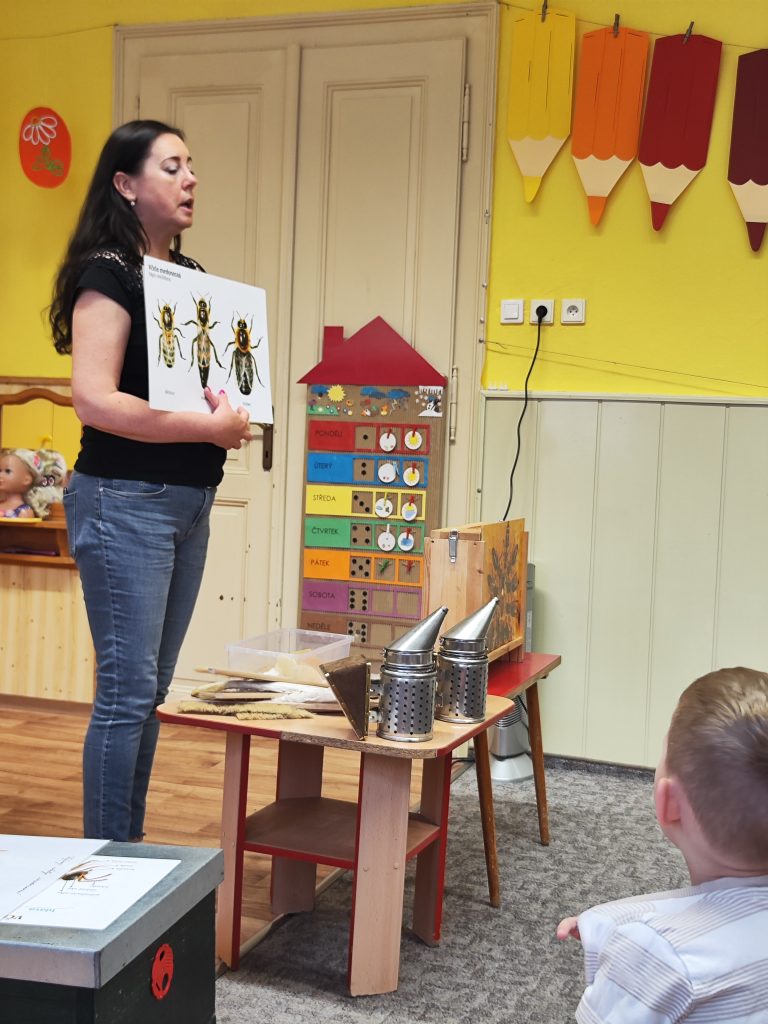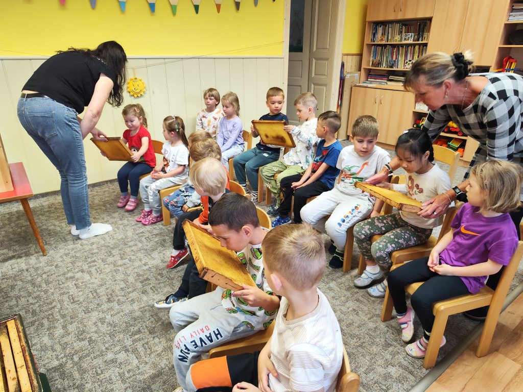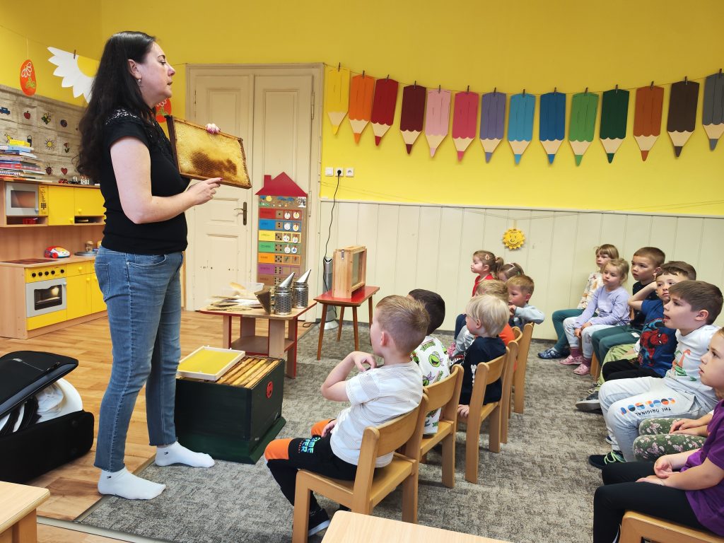 V pátek, 16. května, jsme přivítali v naší školce paní včelařku, která k nám přicestovala až z dalekého Včelařství pod Buchlovem. Připravila si pro nás velmi zajímavou přednášku zaměřenou na svět včel. Děti si vyzkoušely veselé včelařské oblečení a opravdové pomůcky včelaře, ochutnaly med i lahodný a velmi zdravý rouskový pyl. Úžasná a pro děti velmi poutavá byla podívaná na opravdové včely v proskleném úlu. Někteří si je takto zblízka v roji mohli prohlédnout a poslechnout poprvé v životě. Na památku a pro štěstí dostaly od paní včelařky voskové včeličky. Bylo to krásné a velmi zajímavé povídání, ze kterého jsme si odnesli i spoustu nových a zajímavých informací.