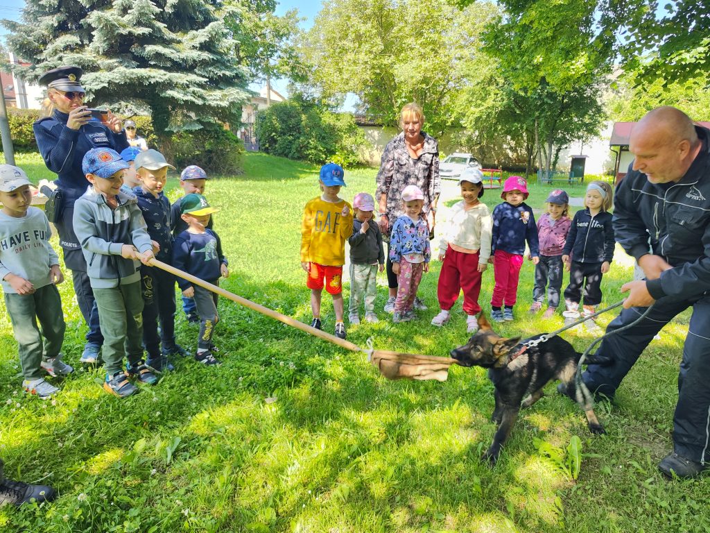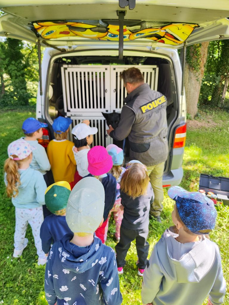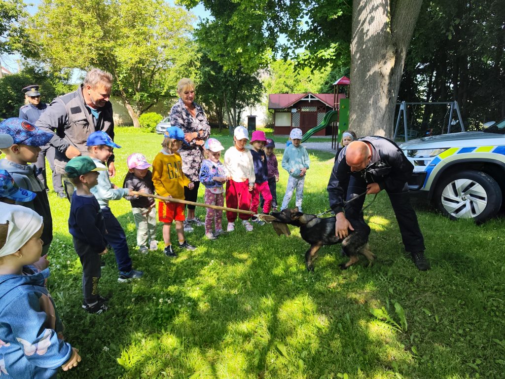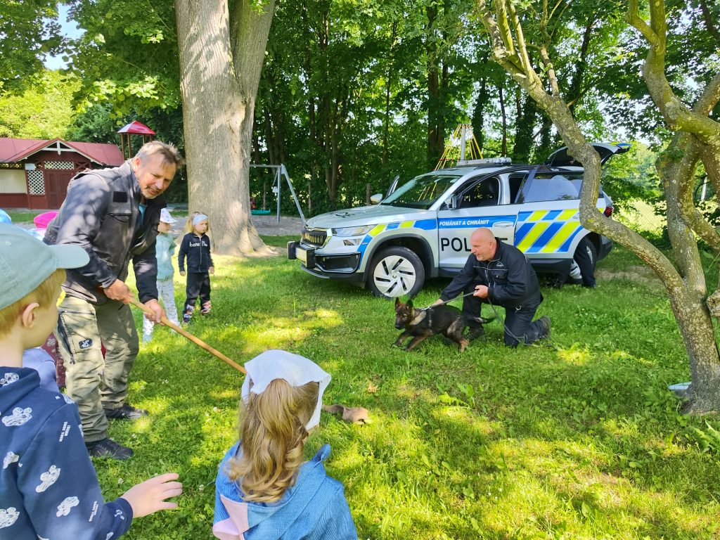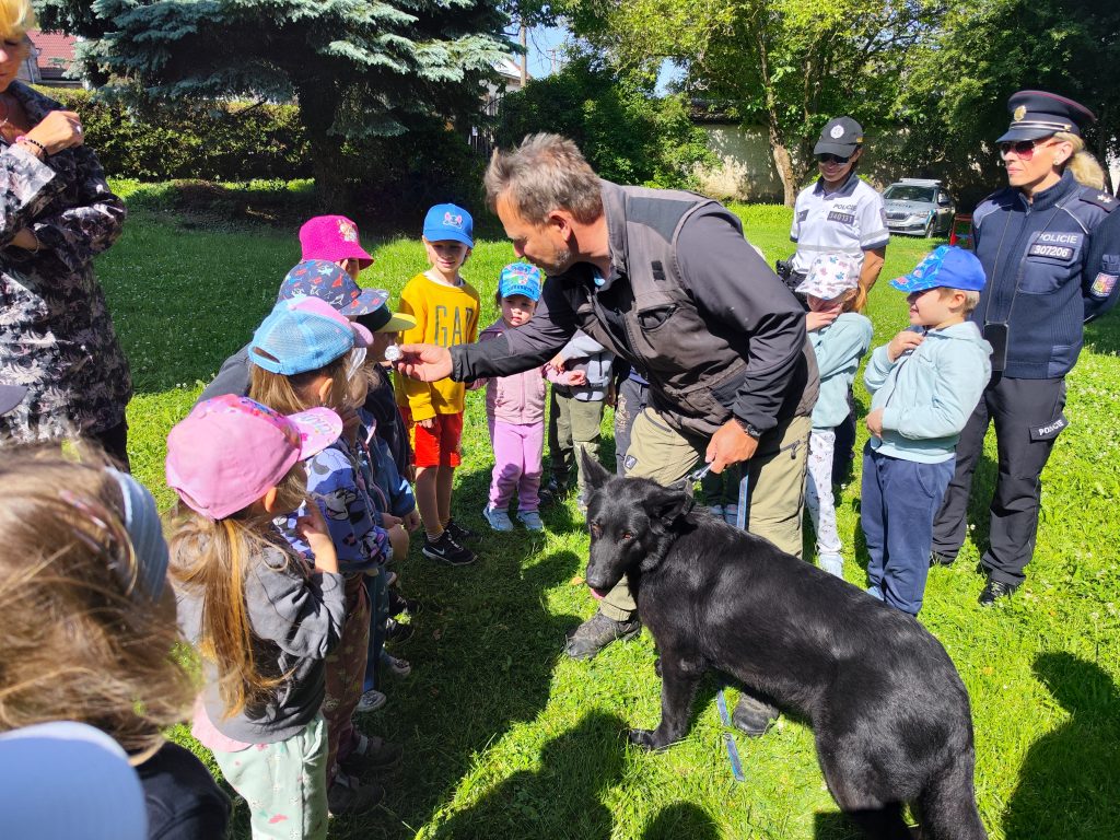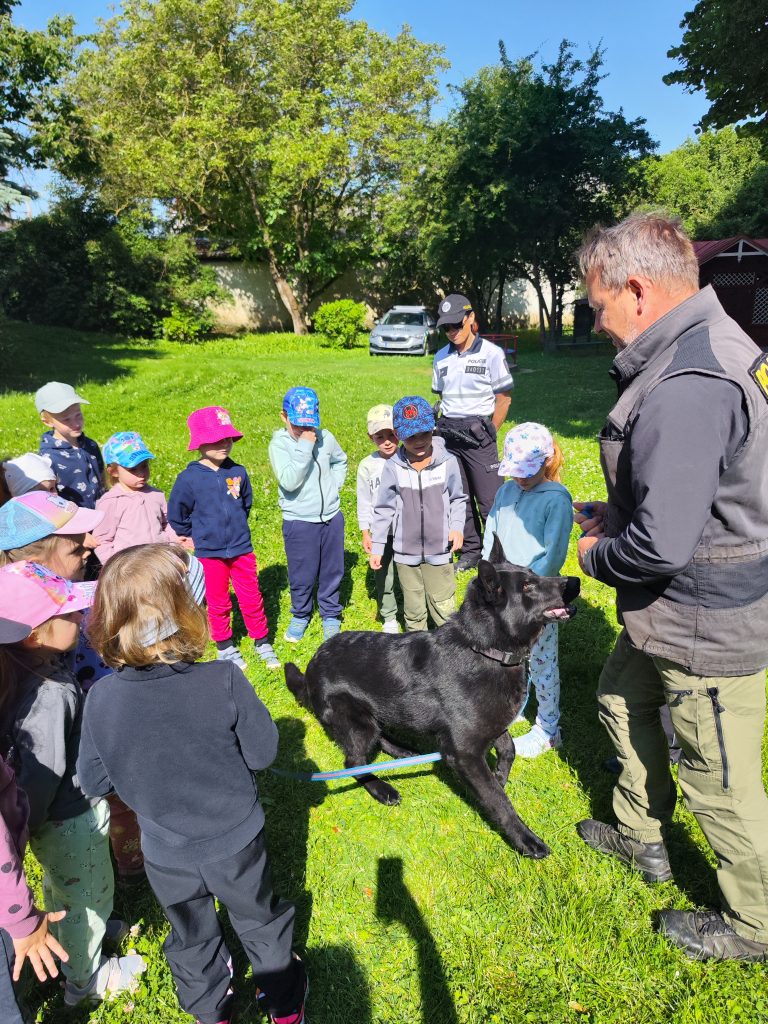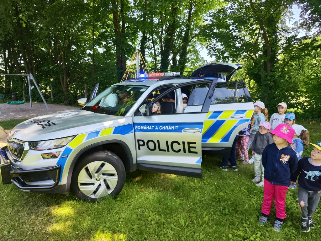 Ve čtvrtek 12. června jsme v naší školce přivítali policejní návštěvu. Páni policisti a paní policistky s sebou přivezli také své vycvičené pejsky, kteří nám předvedli hru s míčkem, přetahování i vyhledávání předmětů. Za odměnu si pejsci pochutnali na piškotech, které jsme jim všichni donesli a s radostí je nakrmili. Prohlédli jsme si také policejní vozidlo a dokonce jsme mohli usednout za volant a na opravdové policisty si tak zahrát. Na památku jsme dostali spoustu upomínkových předmětů včetně památečního stromu s našimi otisky. Celé dopoledne jsme si náramně užili.