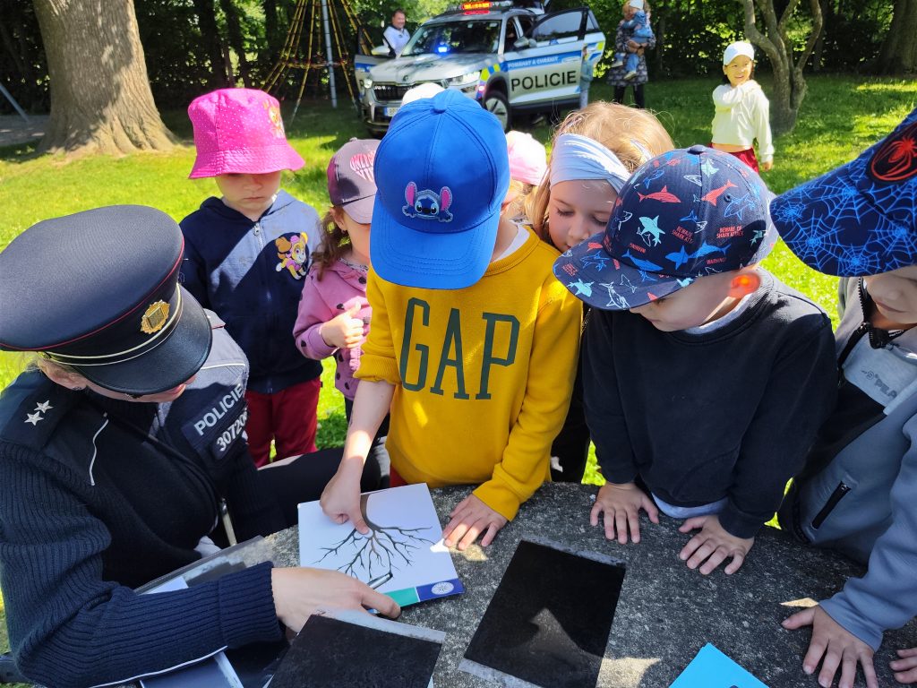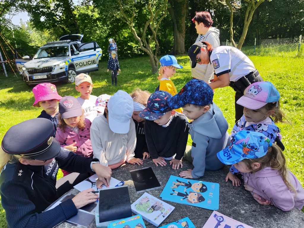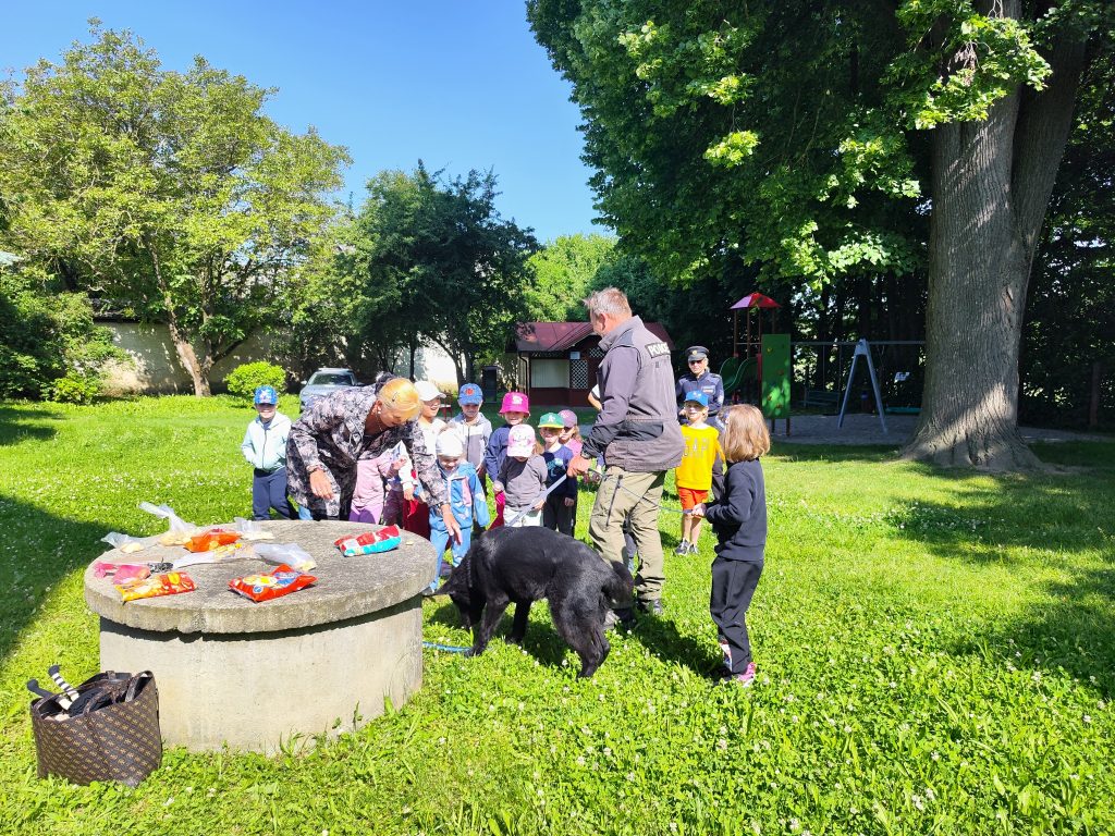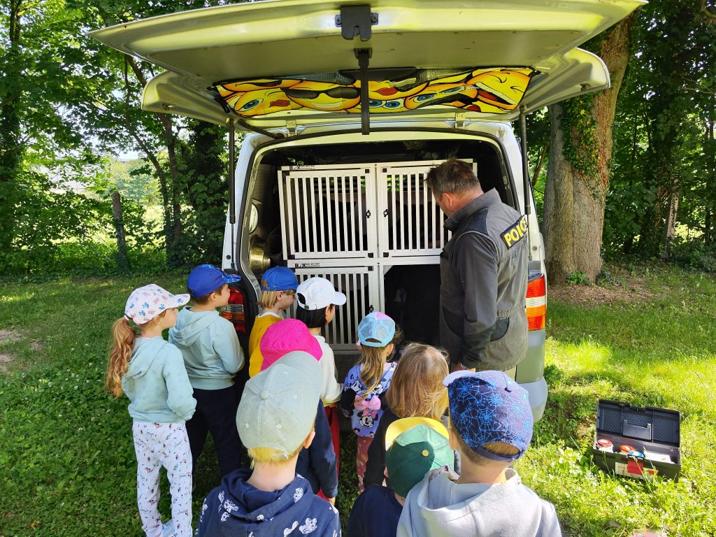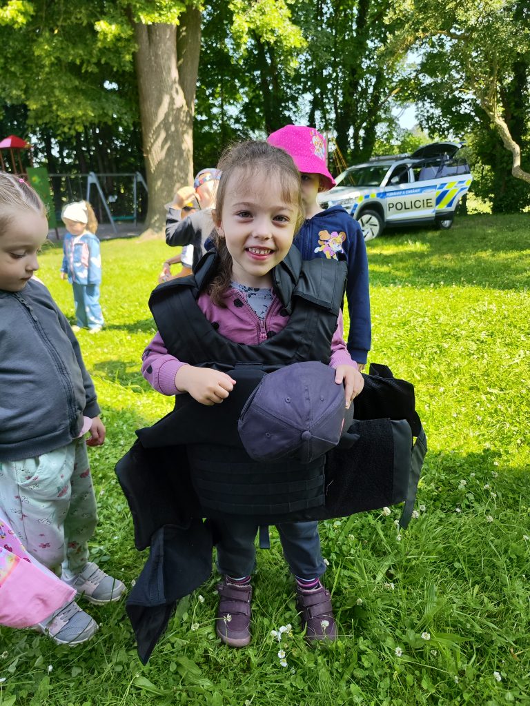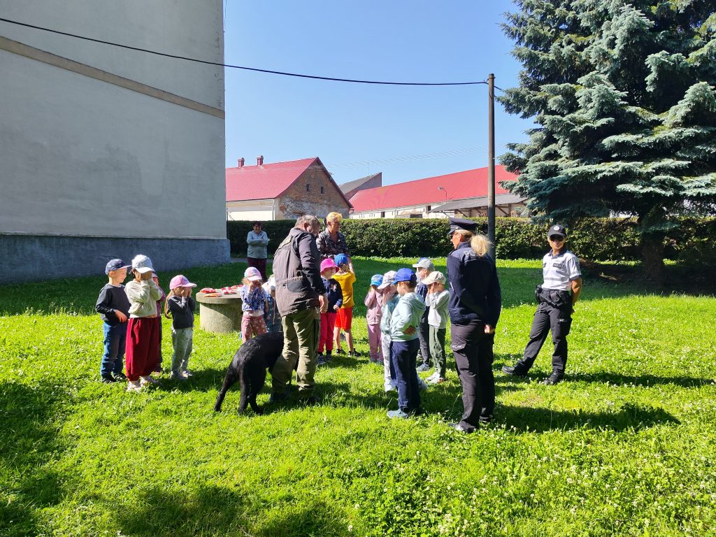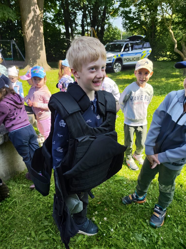 Ve čtvrtek 12. června jsme v naší školce přivítali policejní návštěvu. Páni policisti a paní policistky s sebou přivezli také své vycvičené pejsky, kteří nám předvedli hru s míčkem, přetahování i vyhledávání předmětů. Za odměnu si pejsci pochutnali na piškotech, které jsme jim všichni donesli a s radostí je nakrmili. Prohlédli jsme si také policejní vozidlo a dokonce jsme mohli usednout za volant a na opravdové policisty si tak zahrát. Na památku jsme dostali spoustu upomínkových předmětů včetně památečního stromu s našimi otisky. Celé dopoledne jsme si náramně užili.