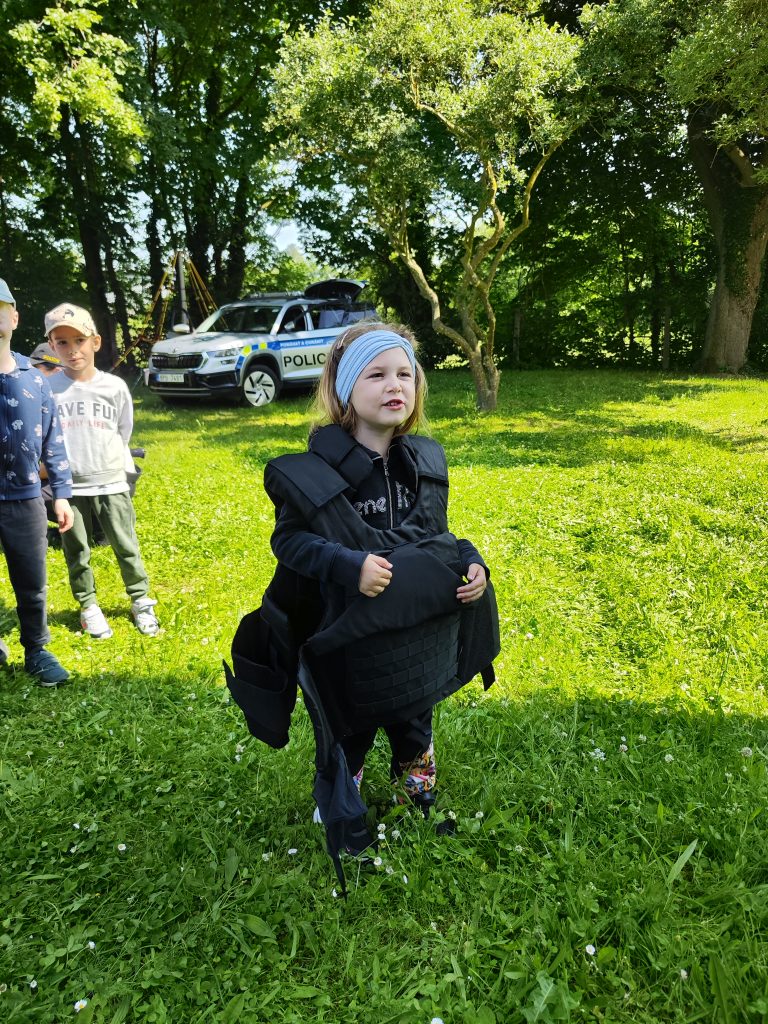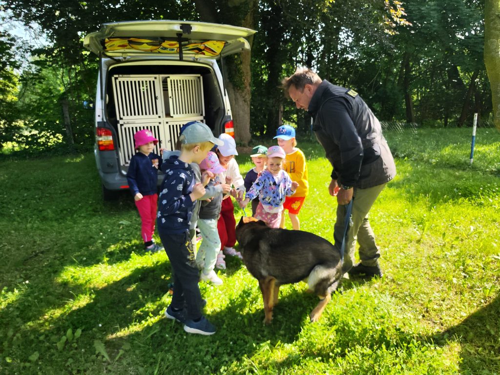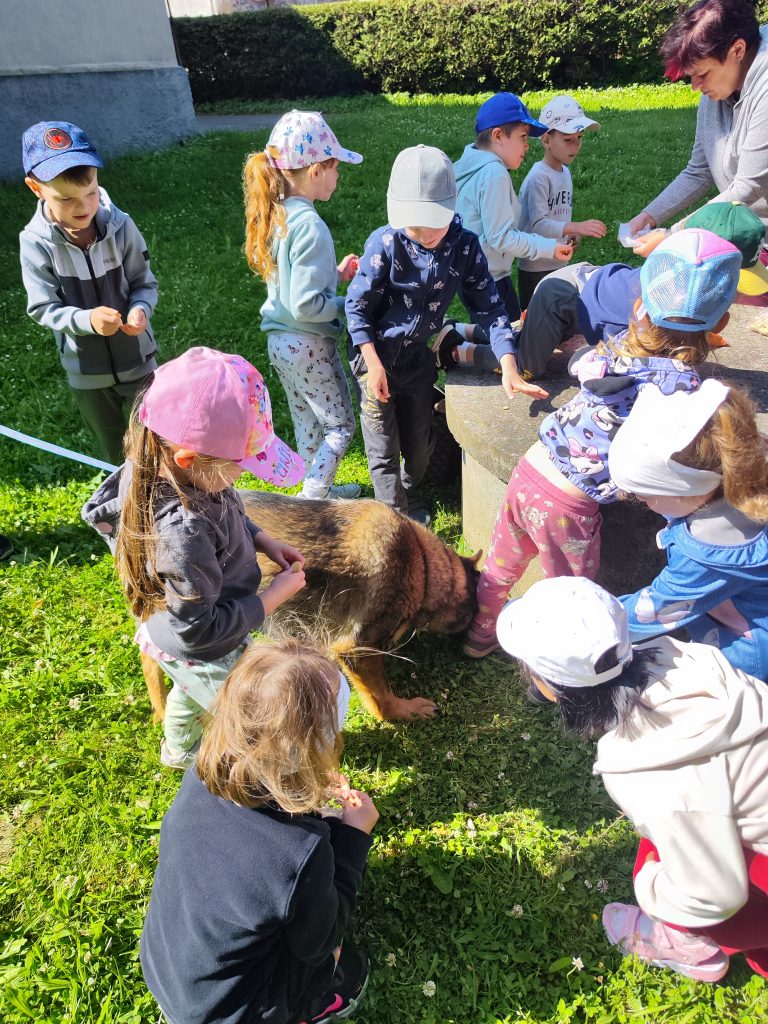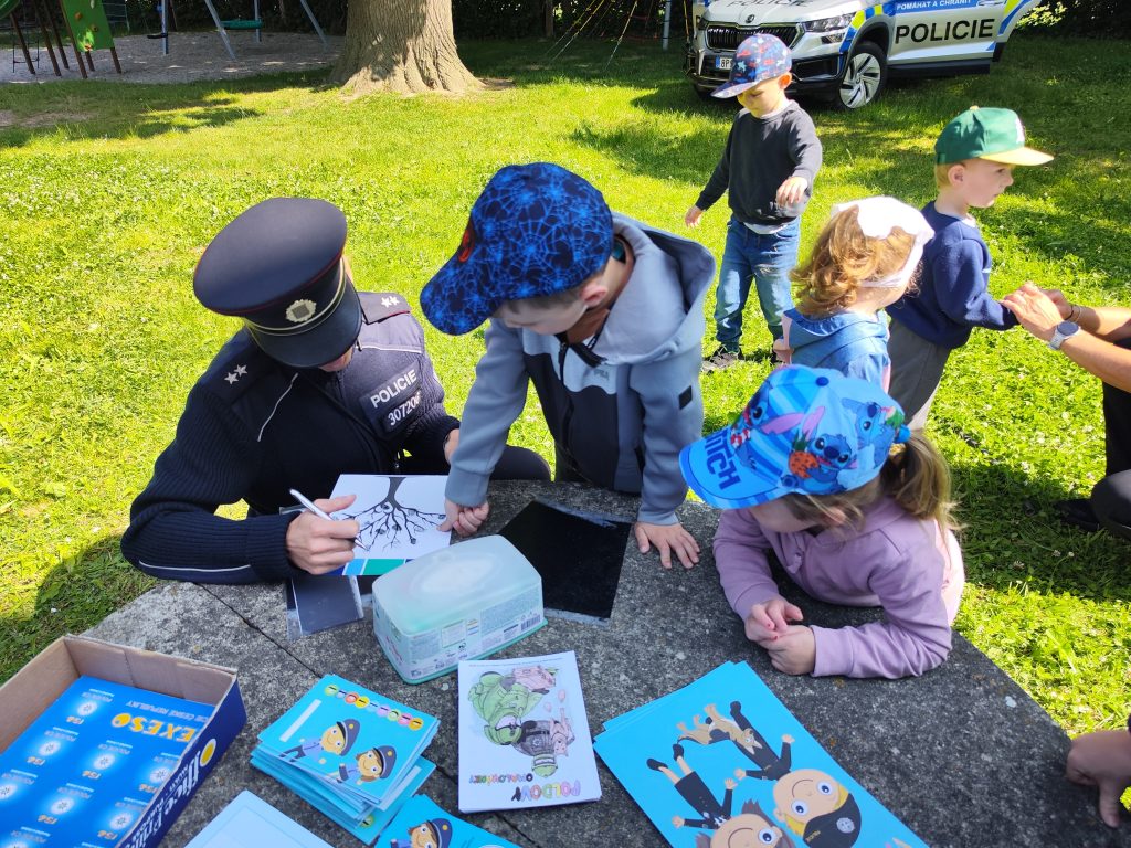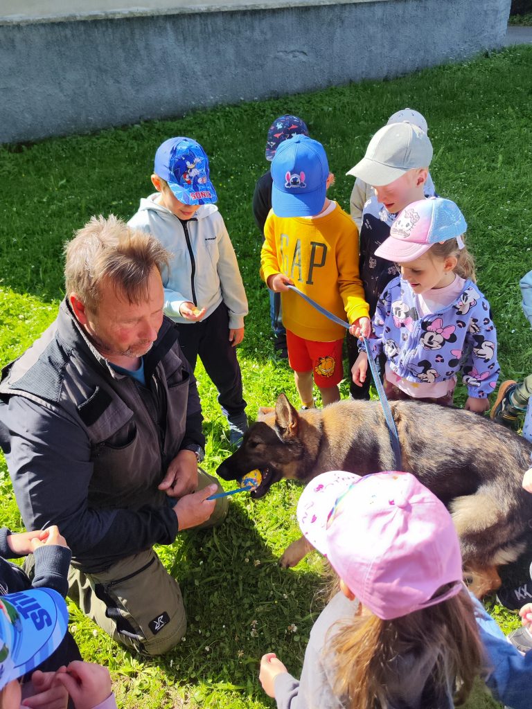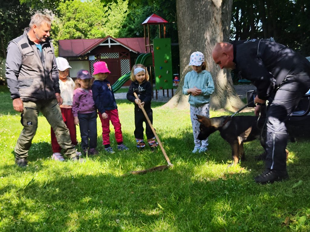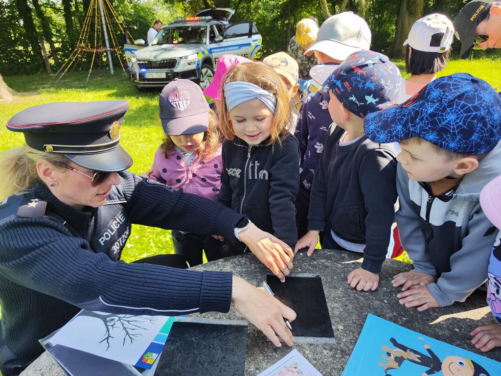 Ve čtvrtek 12. června jsme v naší školce přivítali policejní návštěvu. Páni policisti a paní policistky s sebou přivezli také své vycvičené pejsky, kteří nám předvedli hru s míčkem, přetahování i vyhledávání předmětů. Za odměnu si pejsci pochutnali na piškotech, které jsme jim všichni donesli a s radostí je nakrmili. Prohlédli jsme si také policejní vozidlo a dokonce jsme mohli usednout za volant a na opravdové policisty si tak zahrát. Na památku jsme dostali spoustu upomínkových předmětů včetně památečního stromu s našimi otisky. Celé dopoledne jsme si náramně užili.