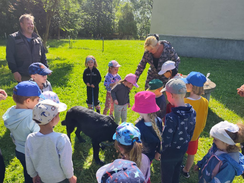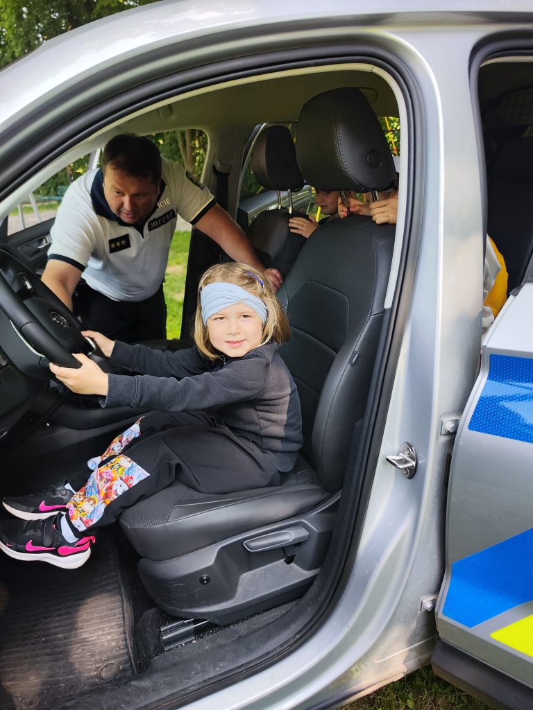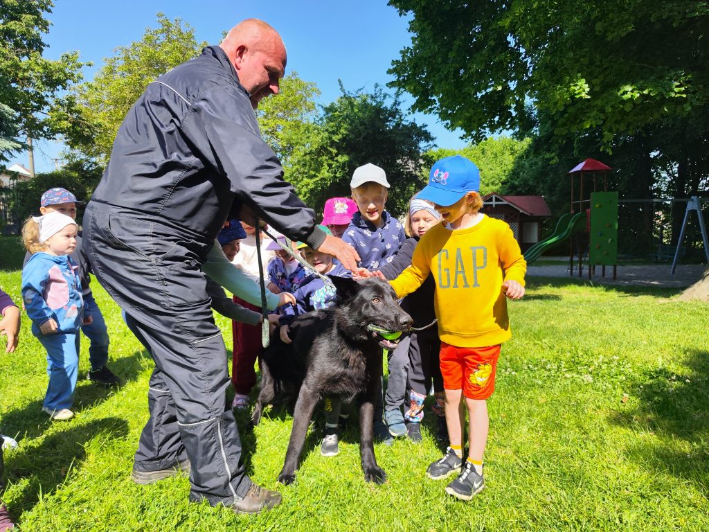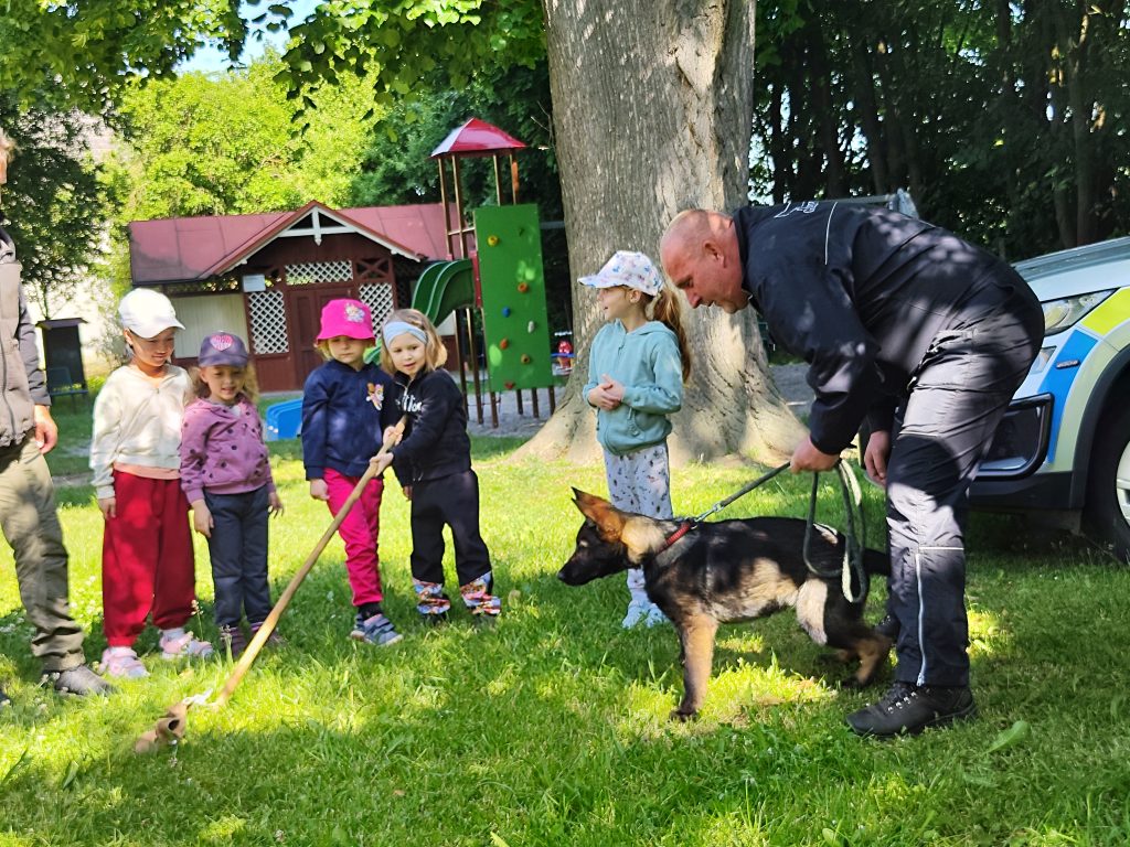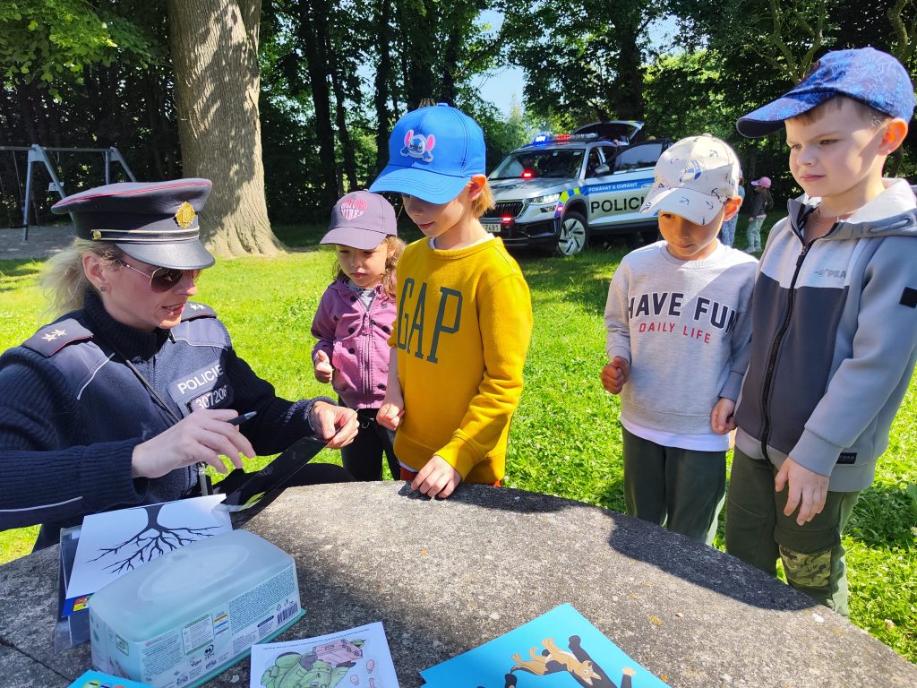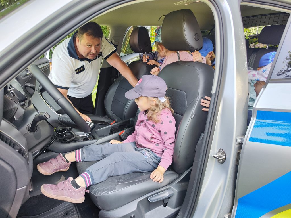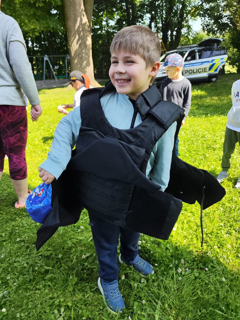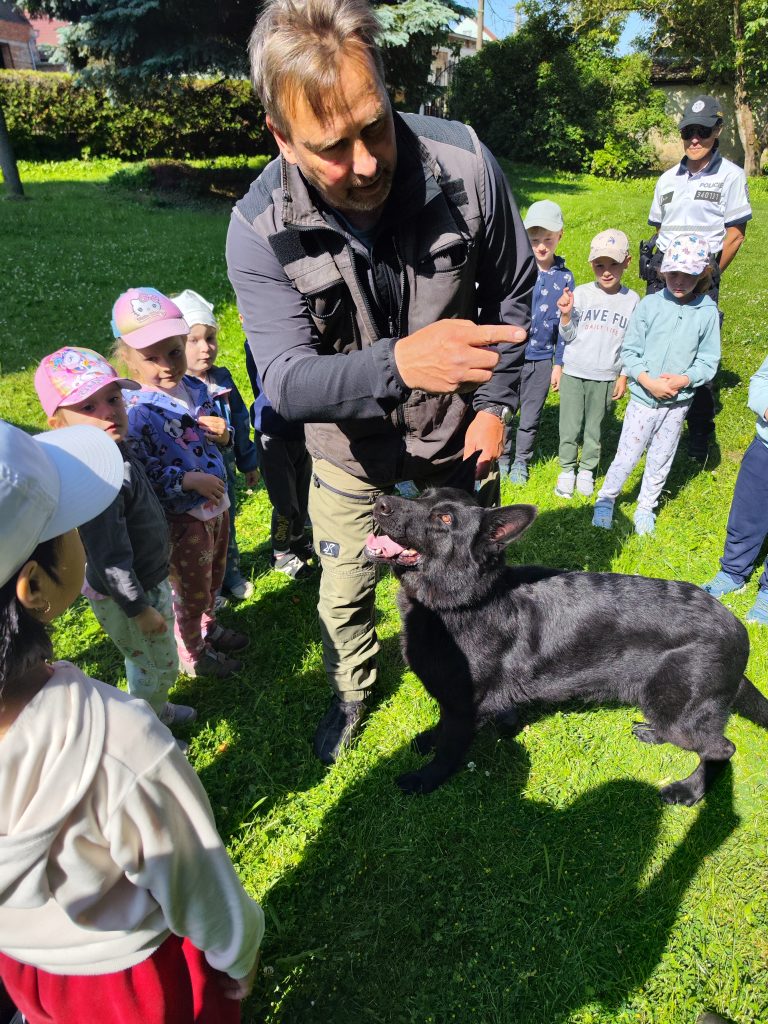Ve čtvrtek 12. června jsme v naší školce přivítali policejní návštěvu. Páni policisti a paní policistky s sebou přivezli také své vycvičené pejsky, kteří nám předvedli hru s míčkem, přetahování i vyhledávání předmětů. Za odměnu si pejsci pochutnali na piškotech, které jsme jim všichni donesli a s radostí je nakrmili. Prohlédli jsme si také policejní vozidlo a dokonce jsme mohli usednout za volant a na opravdové policisty si tak zahrát. Na památku jsme dostali spoustu upomínkových předmětů včetně památečního stromu s našimi otisky. Celé dopoledne jsme si náramně užili.