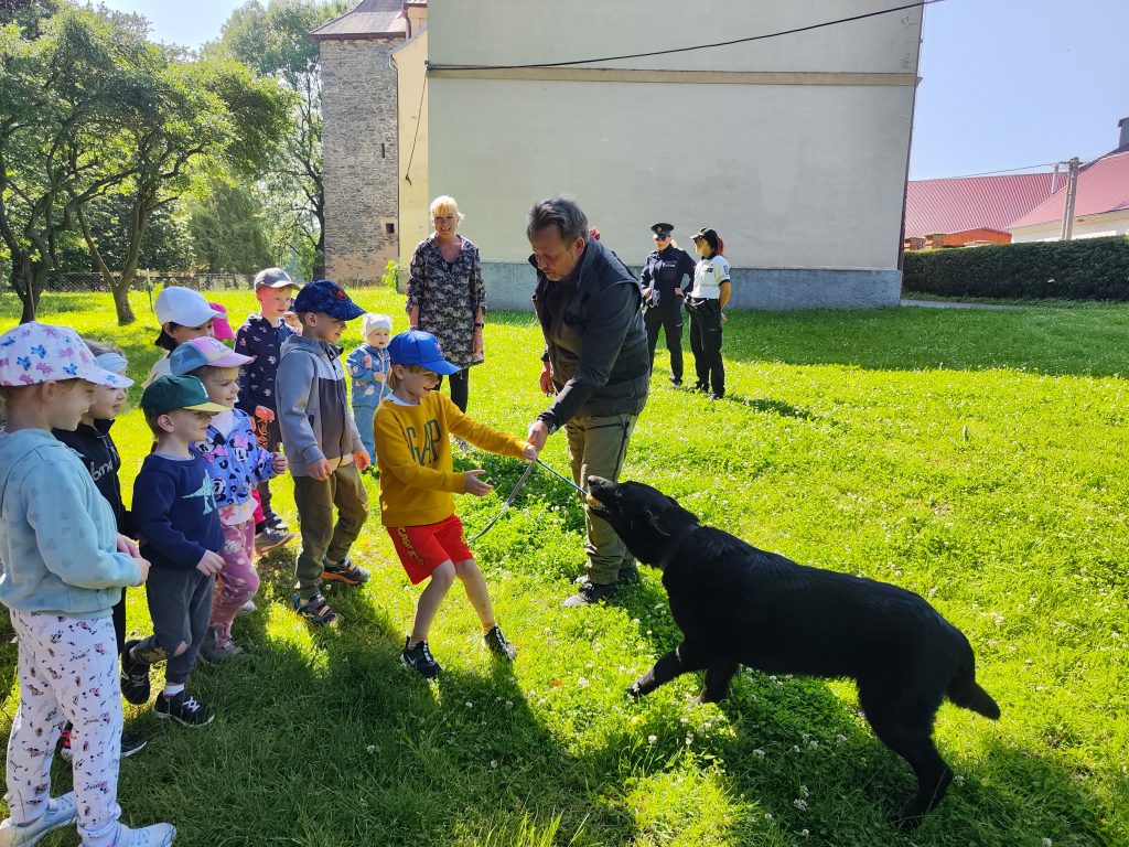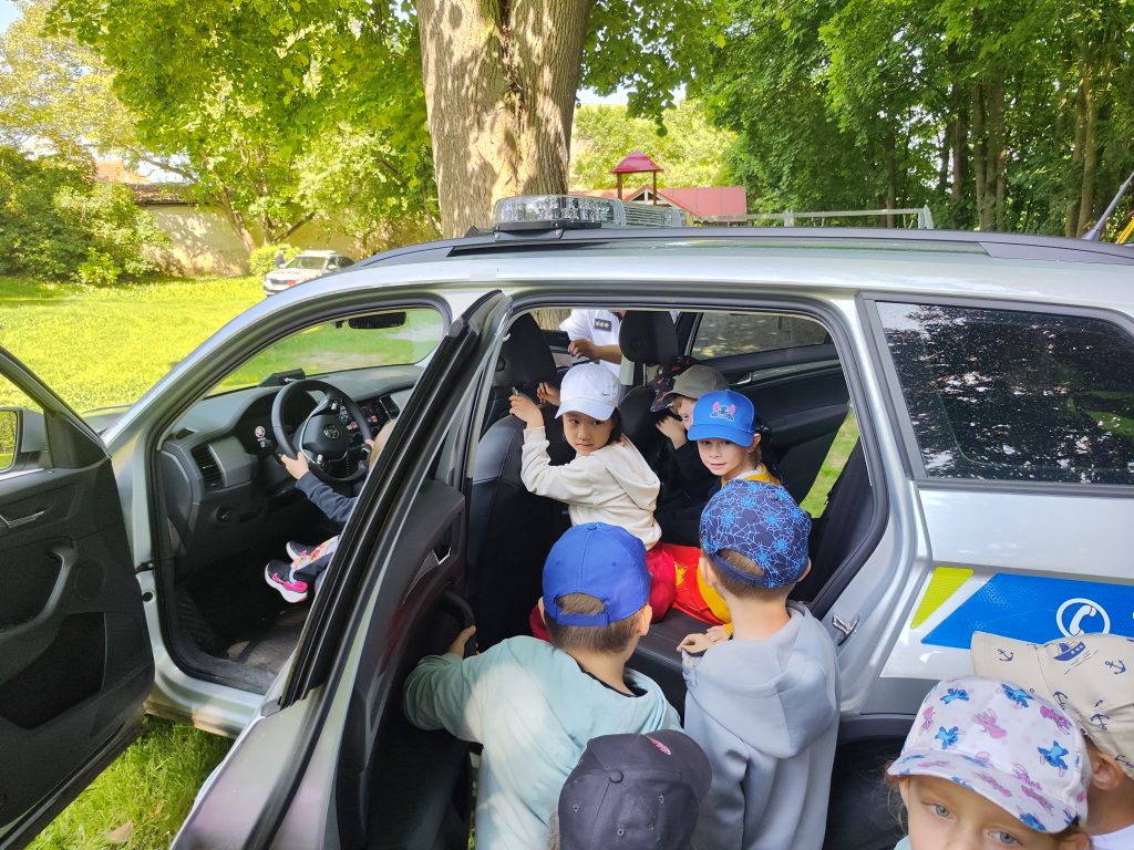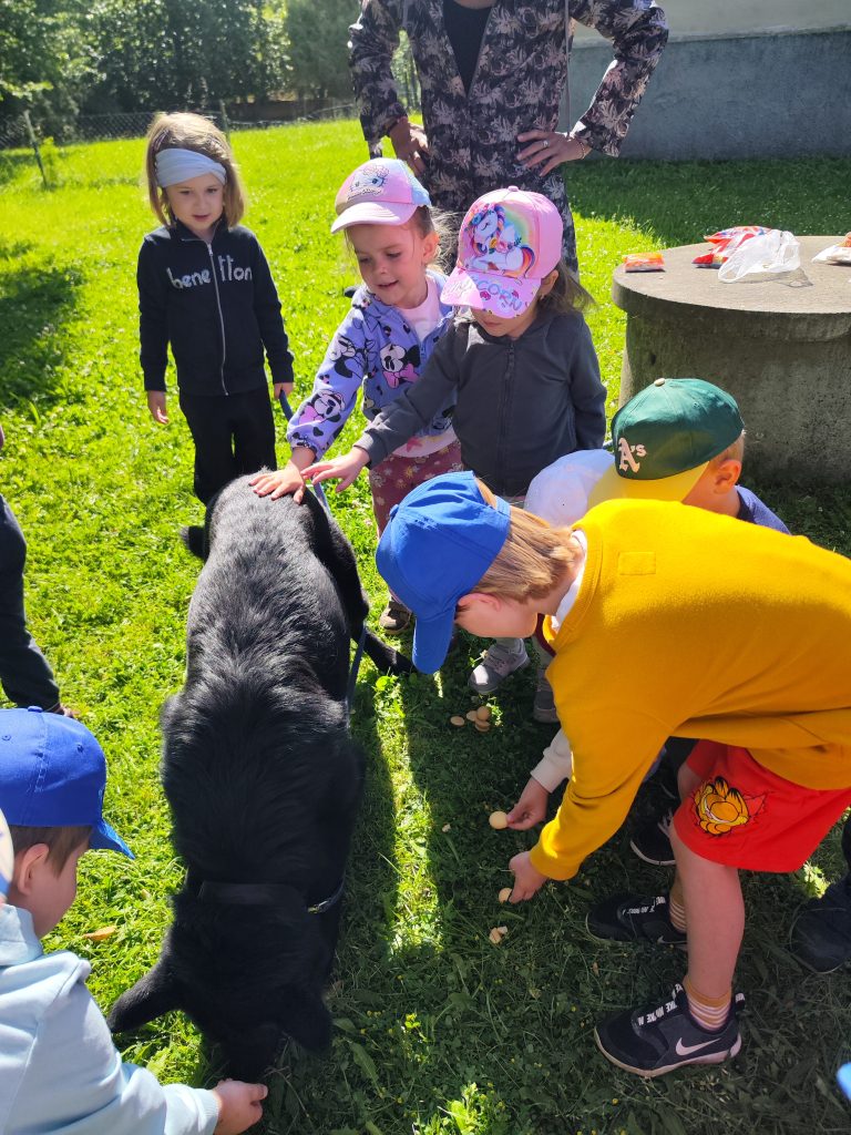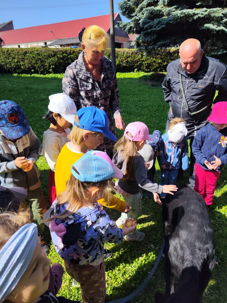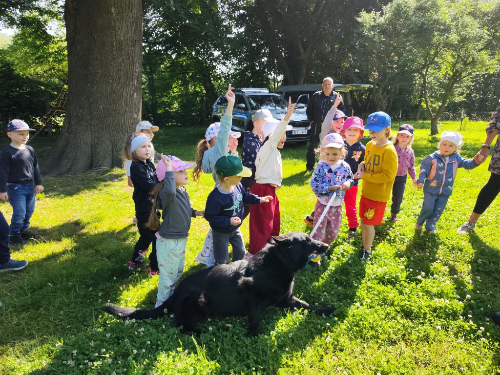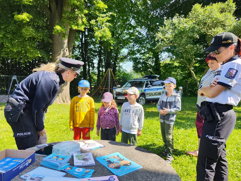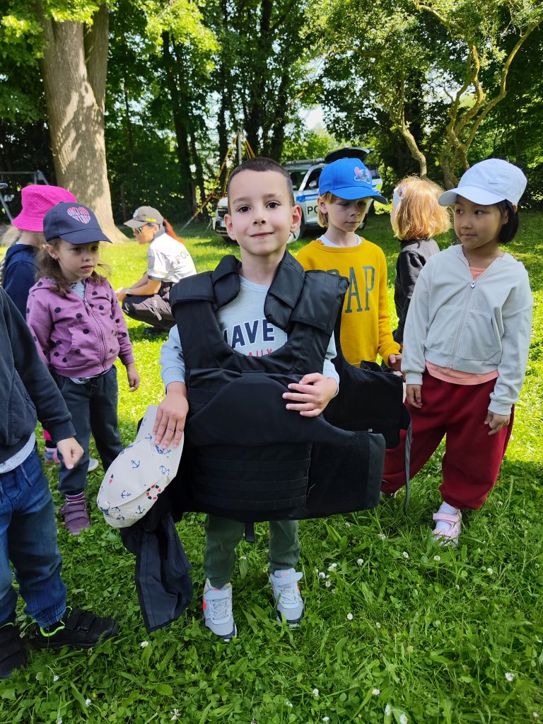 Ve čtvrtek 12. června jsme v naší školce přivítali policejní návštěvu. Páni policisti a paní policistky s sebou přivezli také své vycvičené pejsky, kteří nám předvedli hru s míčkem, přetahování i vyhledávání předmětů. Za odměnu si pejsci pochutnali na piškotech, které jsme jim všichni donesli a s radostí je nakrmili. Prohlédli jsme si také policejní vozidlo a dokonce jsme mohli usednout za volant a na opravdové policisty si tak zahrát. Na památku jsme dostali spoustu upomínkových předmětů včetně památečního stromu s našimi otisky. Celé dopoledne jsme si náramně užili.