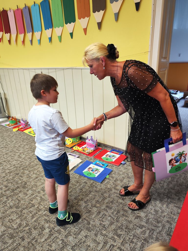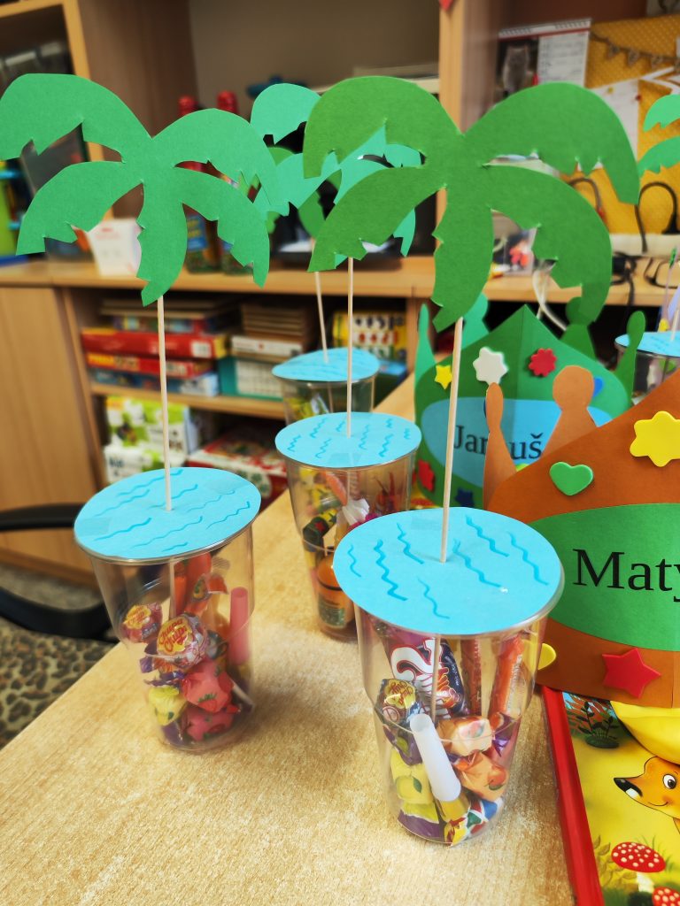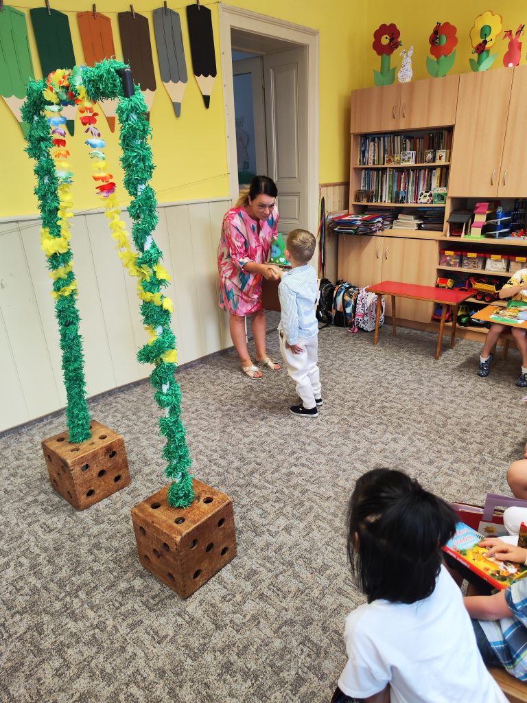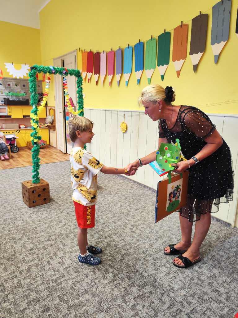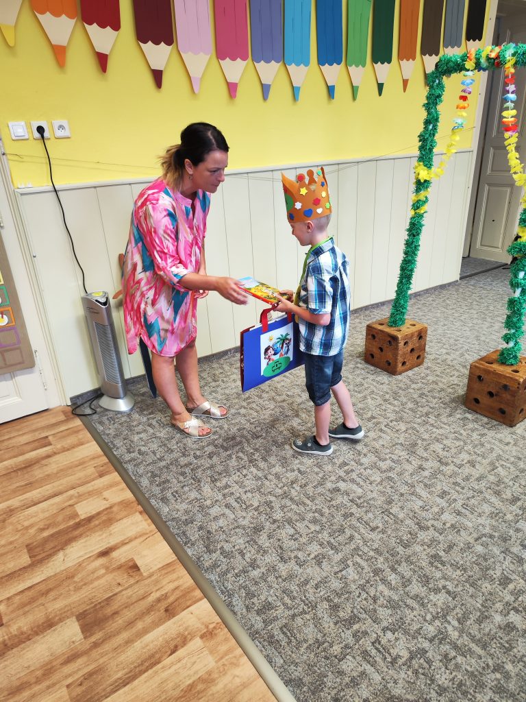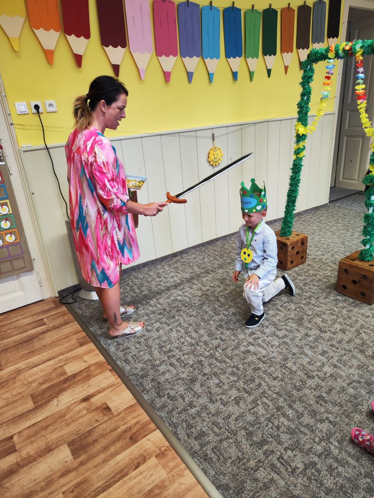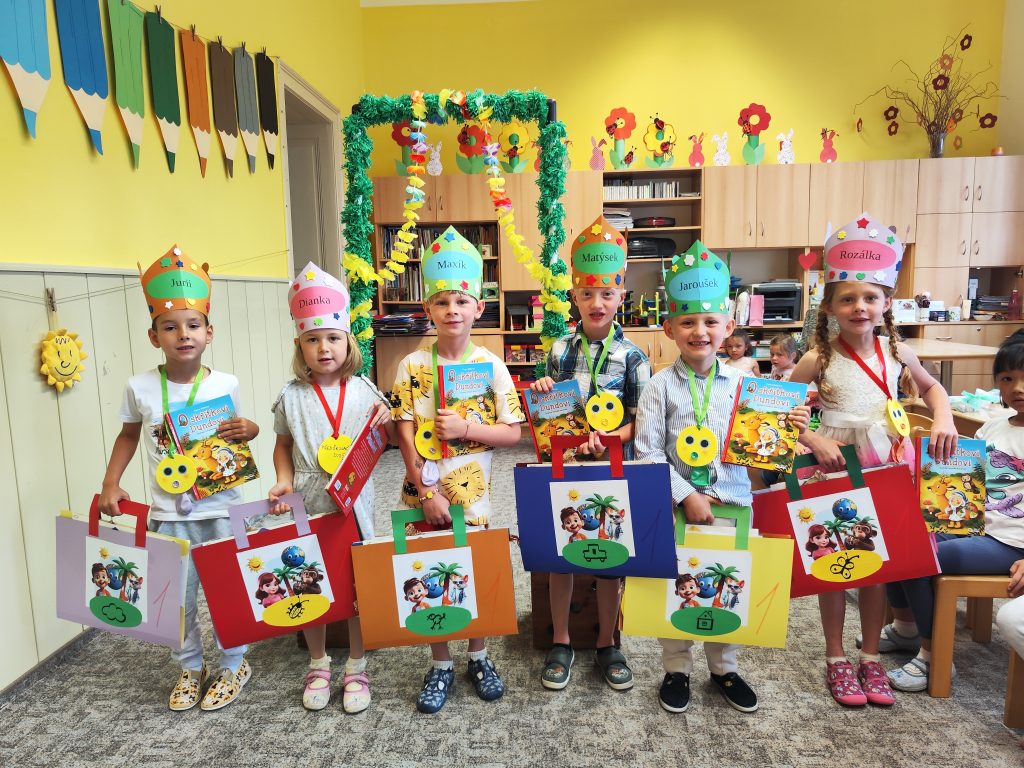 V pátek 27. června nastal čas rozloučit se s našimi velkými kamarády, kteří nás po prázdninách opustí a zasednout ve školách do velkých lavic. Všechny naše předškoláky jsme slavnostně pasovali na školáky, rozdali jim pamětní předměty a popřáli na cestu do velkého světa hodně štěstí. Ani ostatní děti ale nepřišli zkrátka a domů si odnášeli sladké dobroty a školková vysvědčení se svými celoročními výtvarnými pracemi. Na závěr jsme si uspořádali slavnostní hostinu a přípitkem si popřáli pohodové prázdniny bez boulí plné zážitků.
