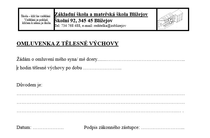 – omluvenku prosím vytištěnou a řádně vyplněnou ve formátu A5