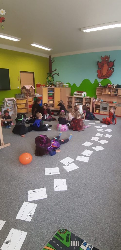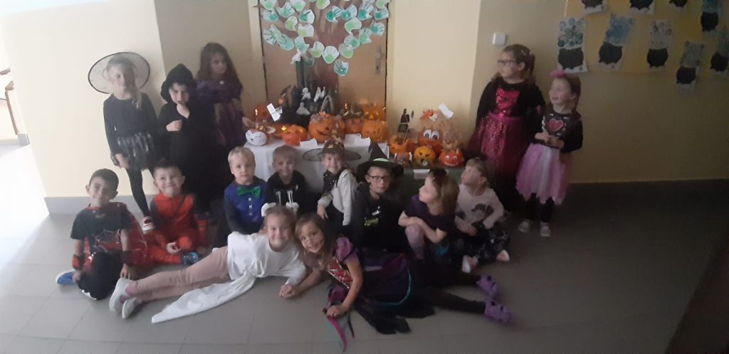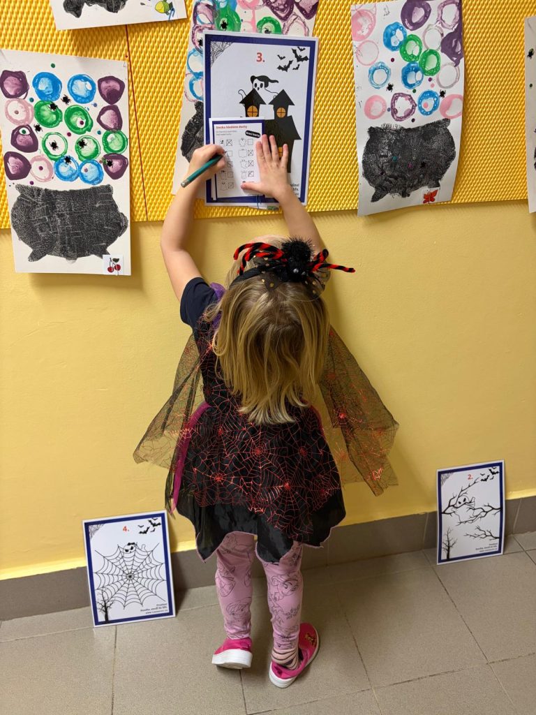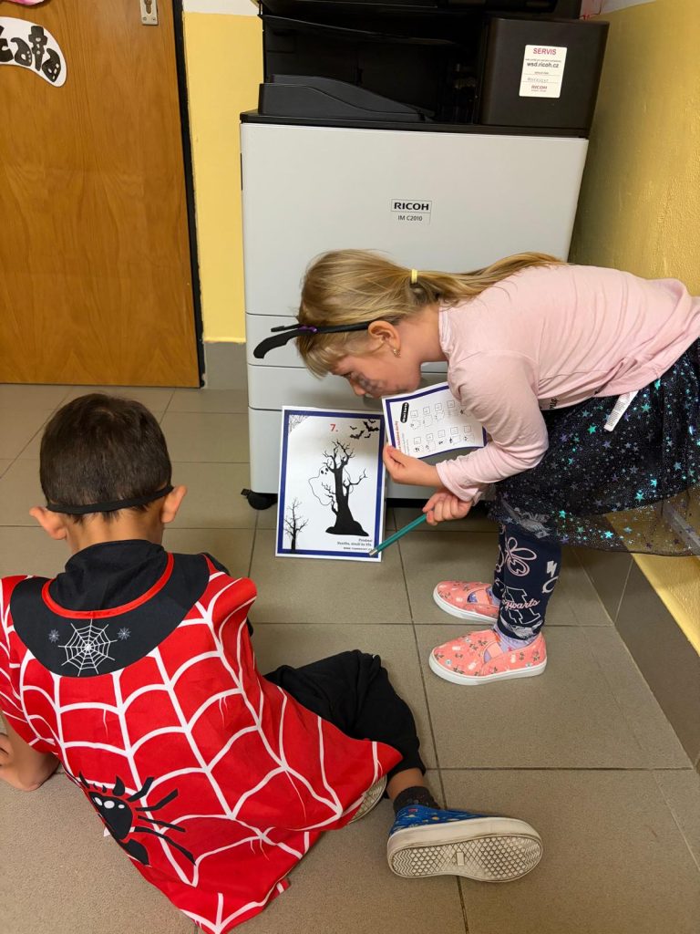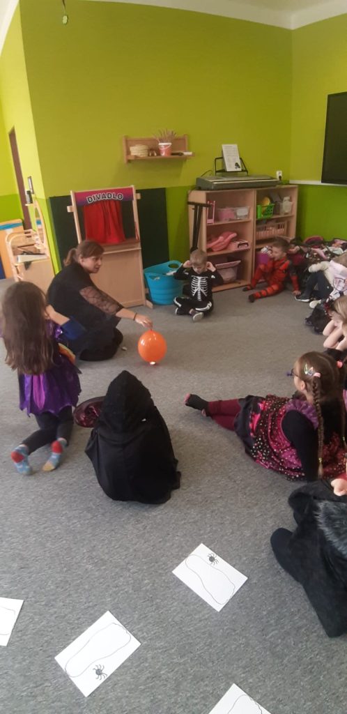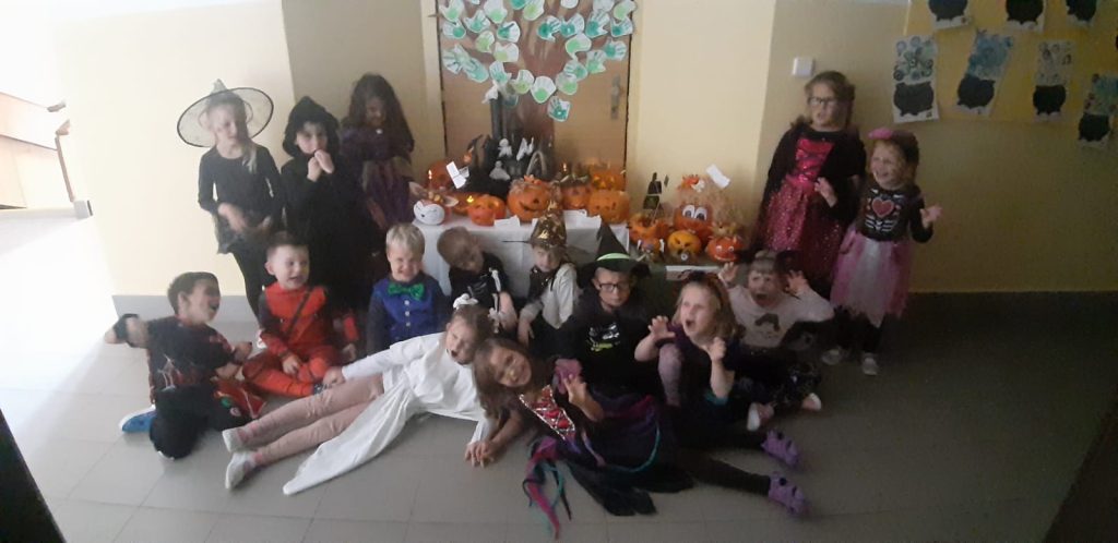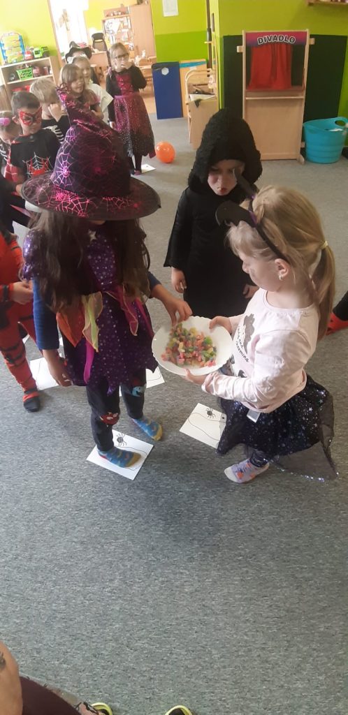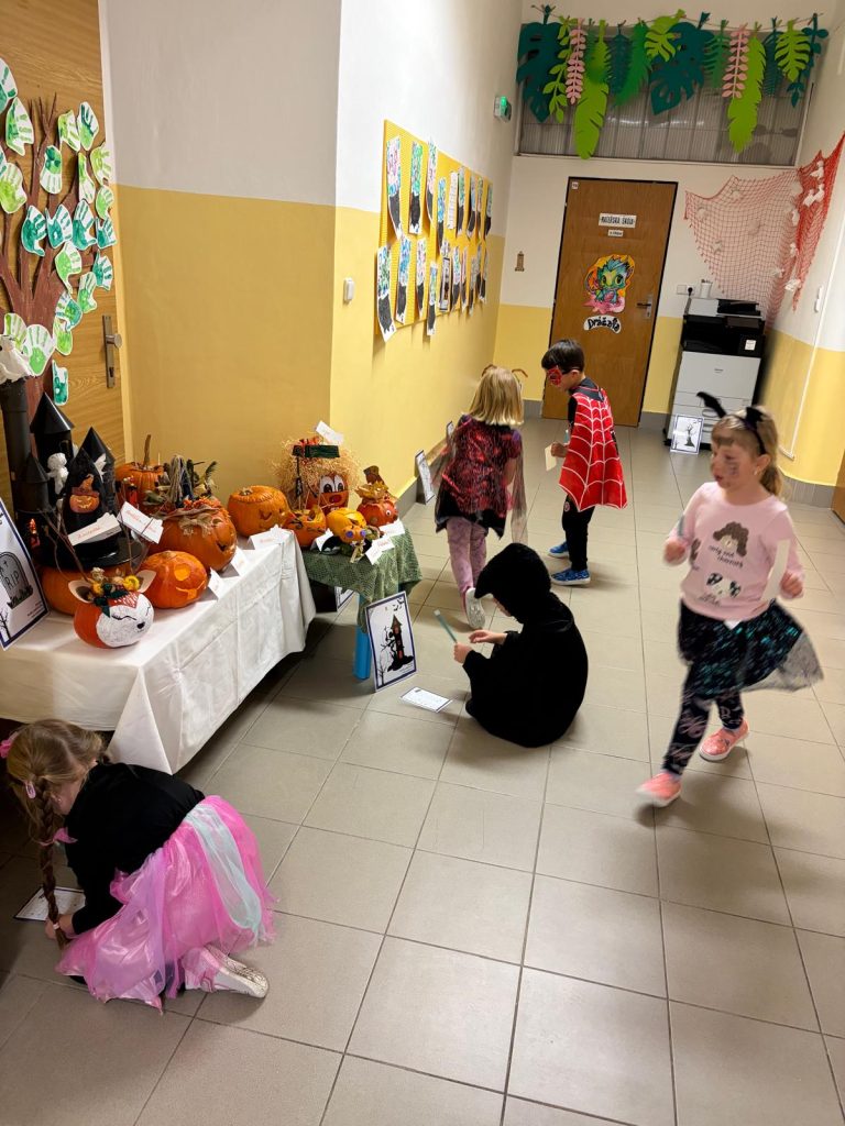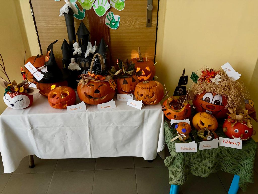 V říjnu jsme sklidili poslední brambory a vyzkoušeli si jak to probíhá u voleb. Seznámili jsme se s kalendářem, naučili se dny v týdnu a vysvětlili si, proč se střídá den a noc. Proběhla soutěž “ Dýňáček „, které se zůčastnili všichni. Krásné a originální výtvory jsme ocenili. S Matějem a Viki jsme oslavili narozeniny. Jako strašidýlka jsme si zařádili při hrách a soutěžích.