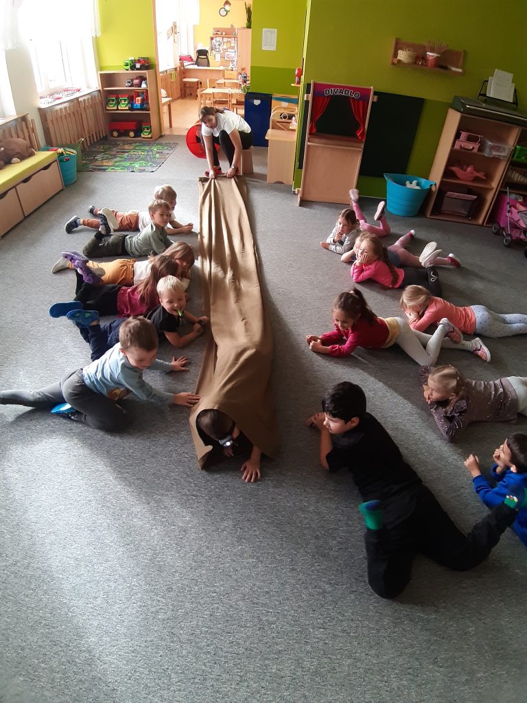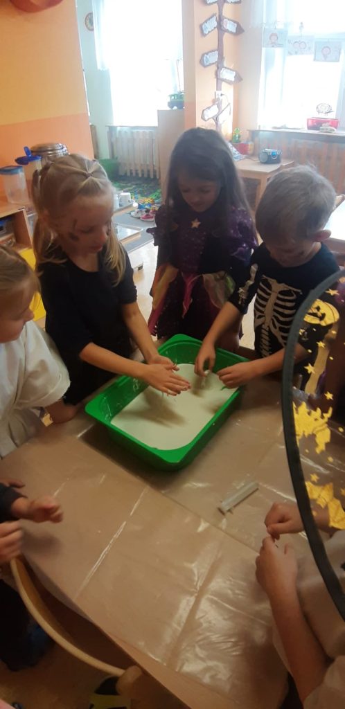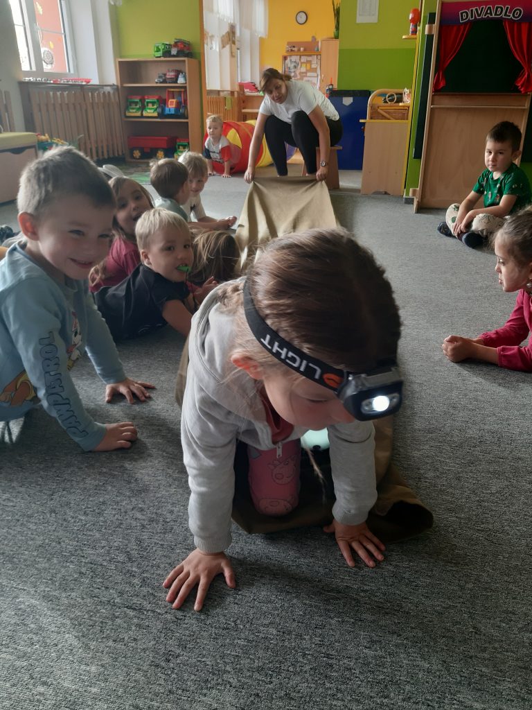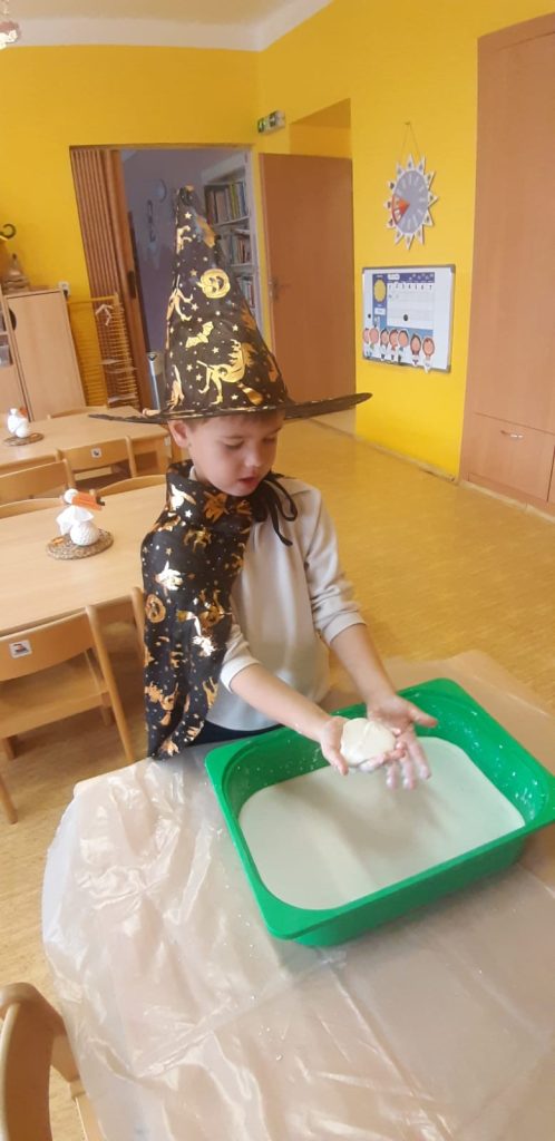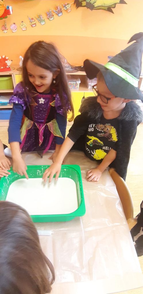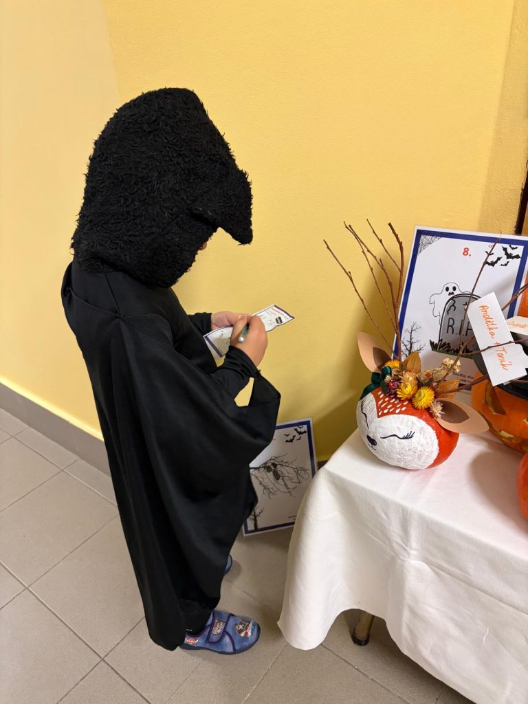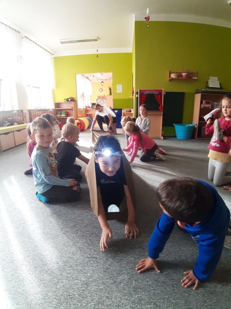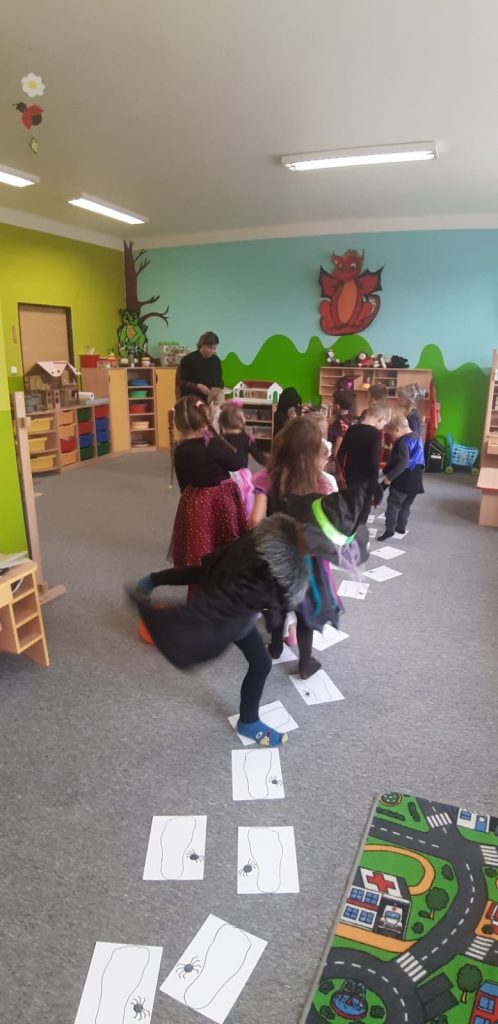 V říjnu jsme sklidili poslední brambory a vyzkoušeli si jak to probíhá u voleb. Seznámili jsme se s kalendářem, naučili se dny v týdnu a vysvětlili si, proč se střídá den a noc. Proběhla soutěž “ Dýňáček „, které se zůčastnili všichni. Krásné a originální výtvory jsme ocenili. S Matějem a Viki jsme oslavili narozeniny. Jako strašidýlka jsme si zařádili při hrách a soutěžích.